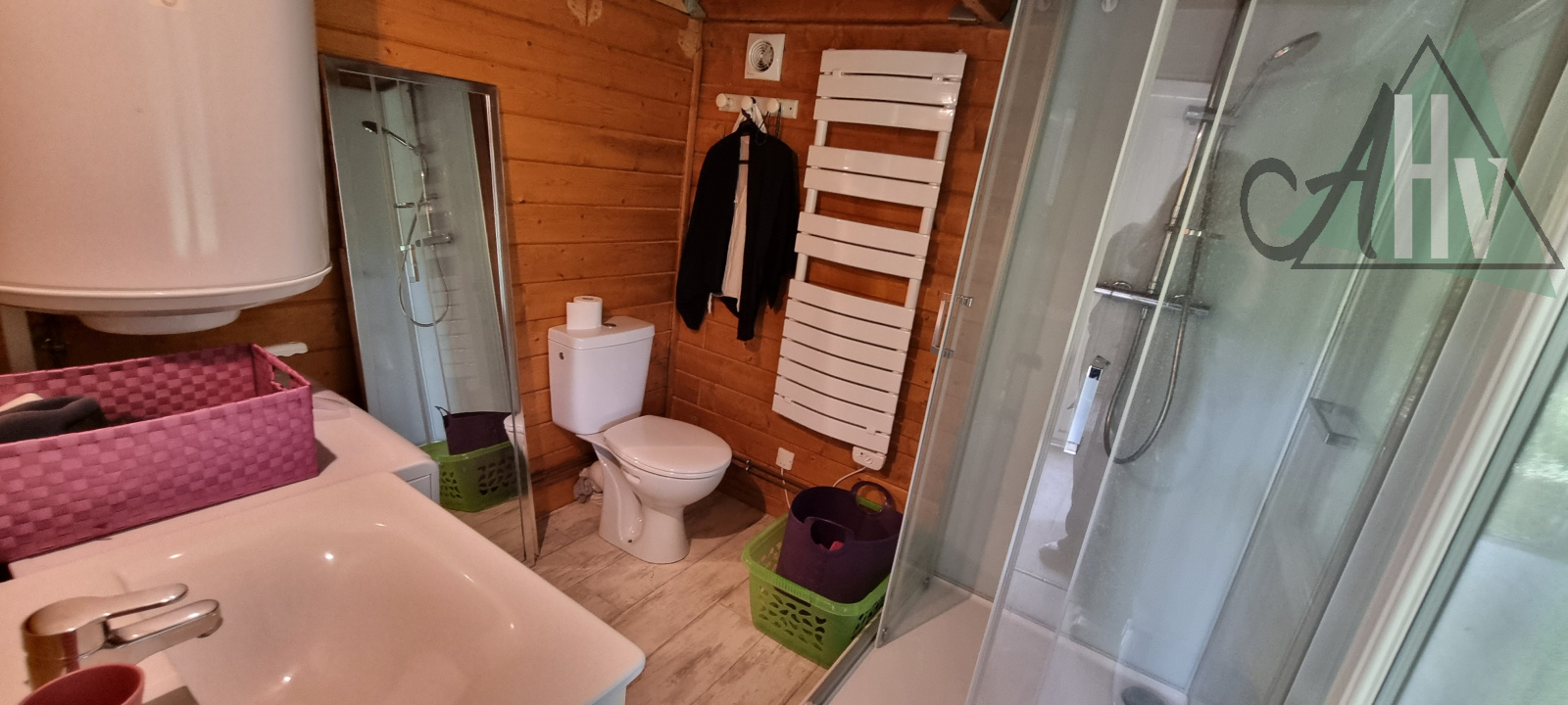 Deuxième chalet de 20 m² : chambre avec mezzanine, salle d'eau avec WC et appentis.
