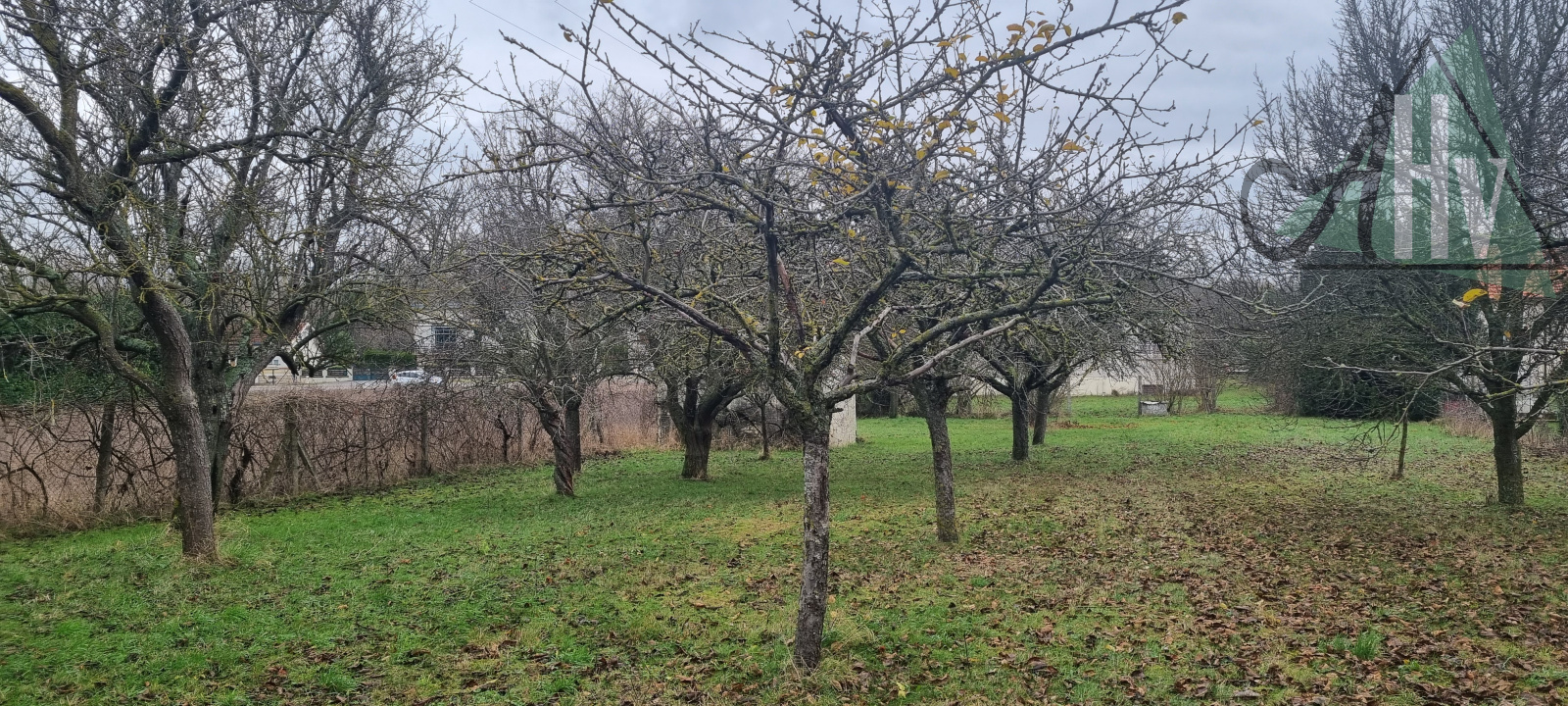 Jardin clos et arboré et parcelle de terrain constructible (environ 1451 m²) avec un accès via la rue arrière.