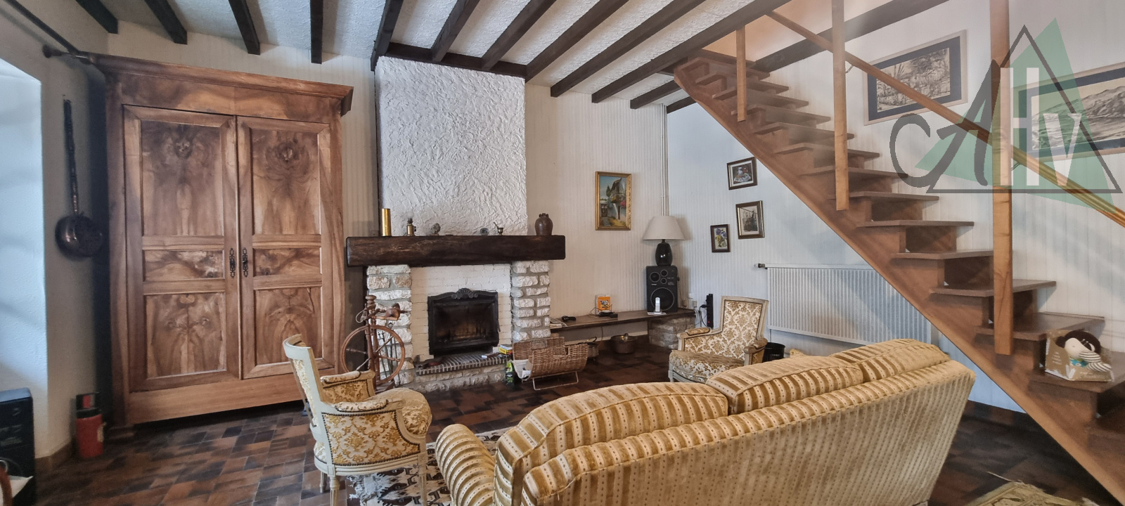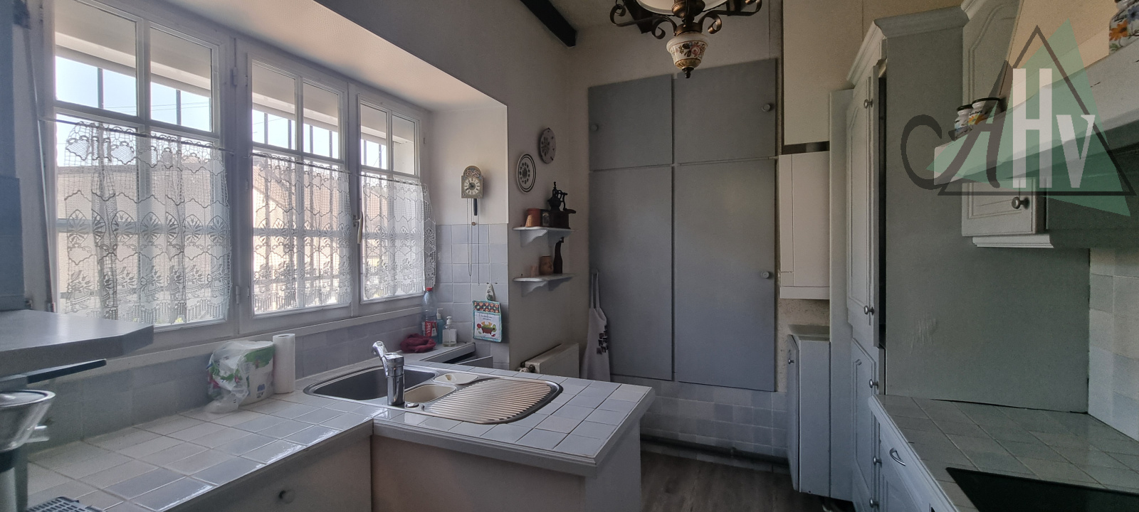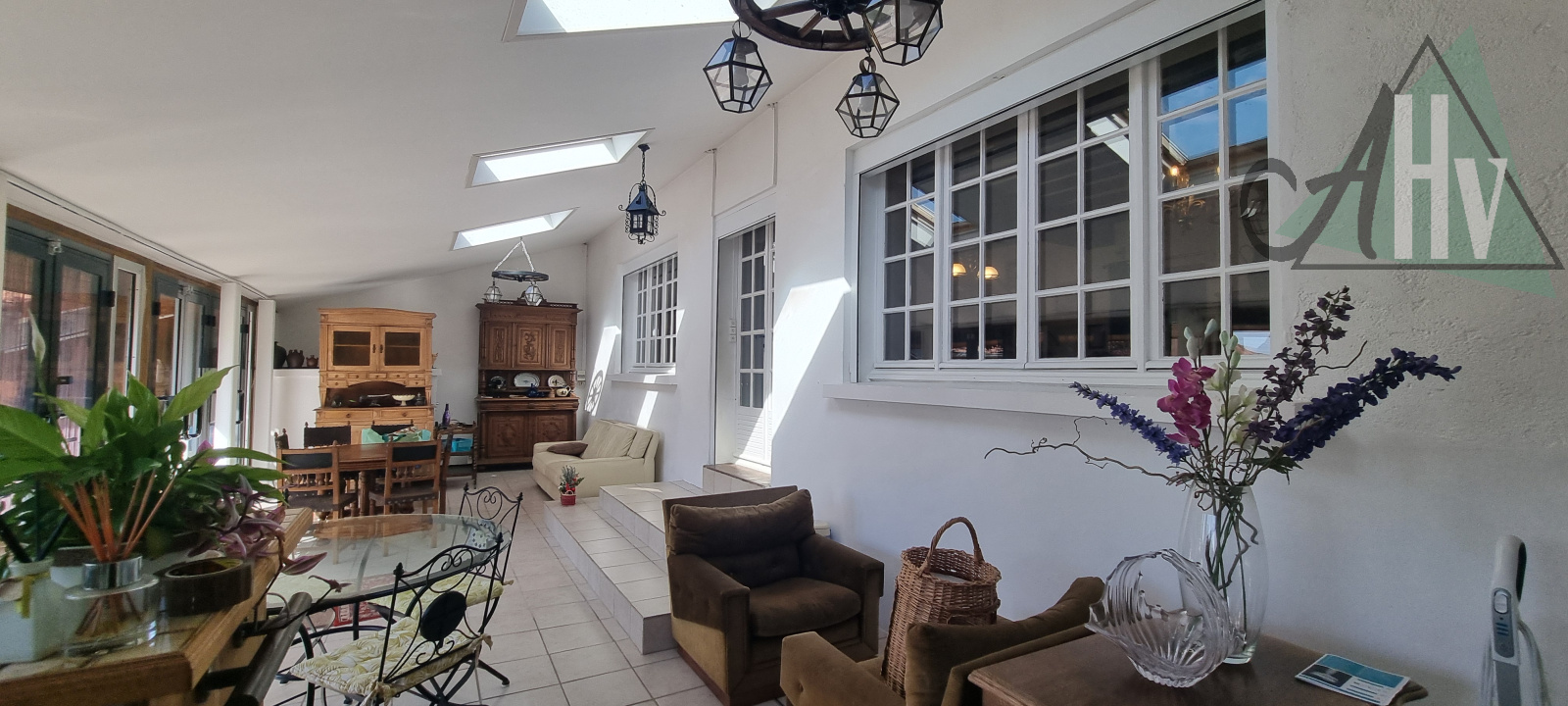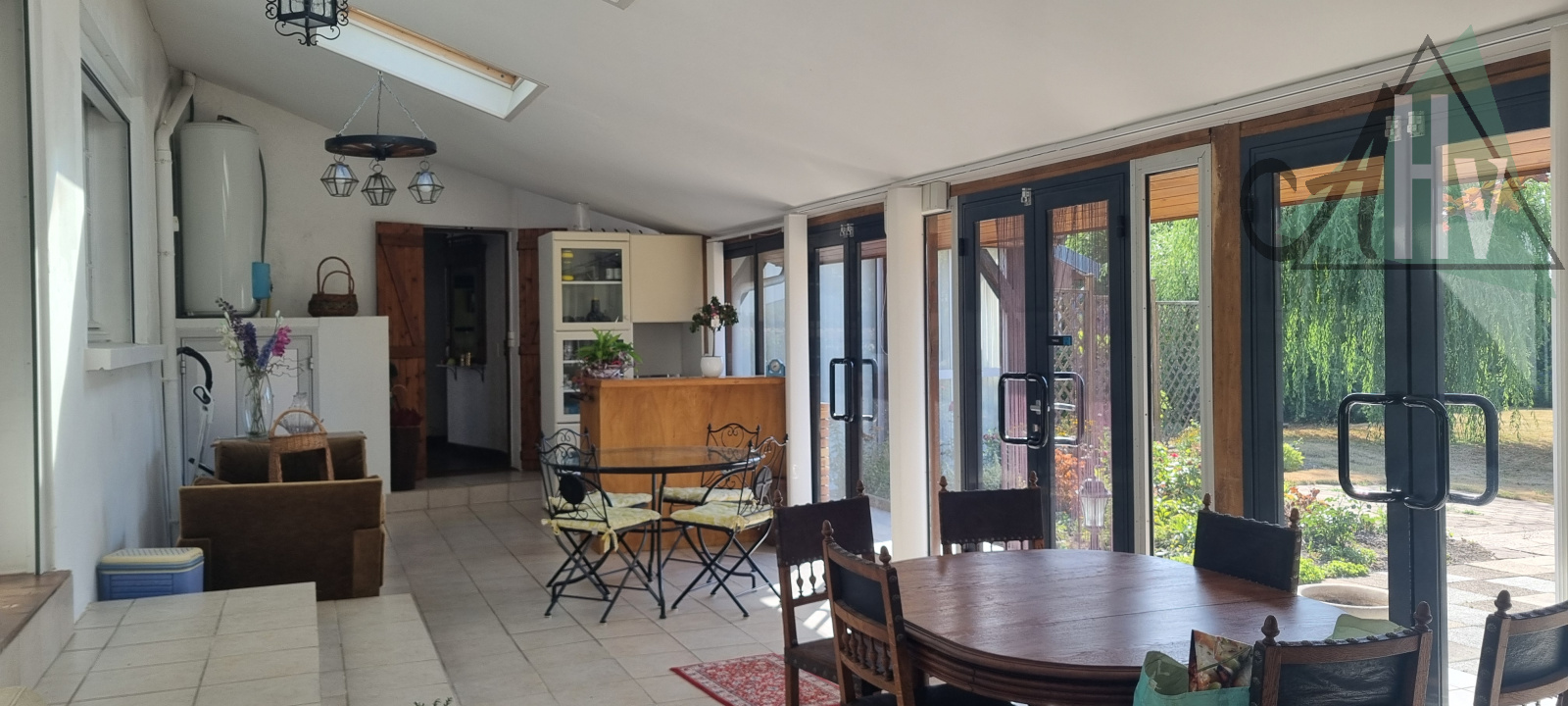 Au rez-de-chaussée : grande véranda comprenant un coin cuisine avec accès à deux caves, séjour avec insert, cuisine aménagée et équipée, dégagement, salle de bains avec douche, WC avec lave-mains et chambre.