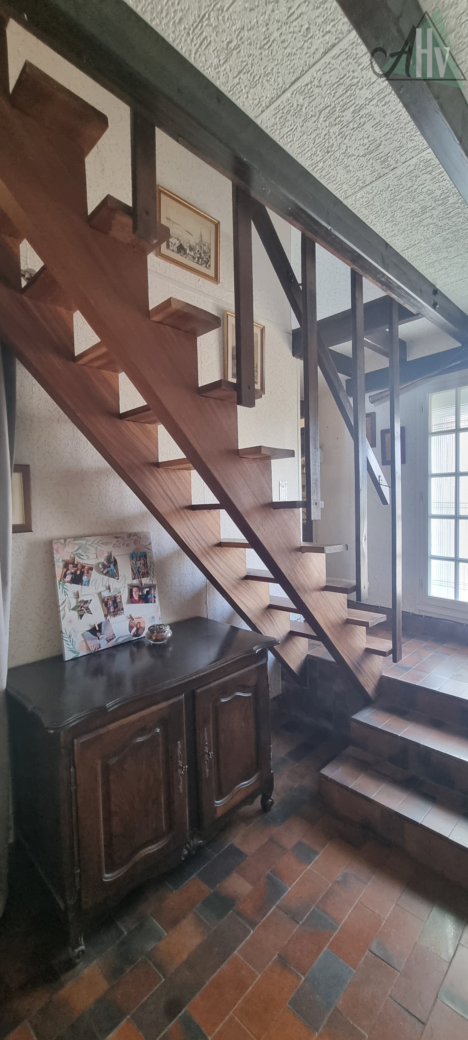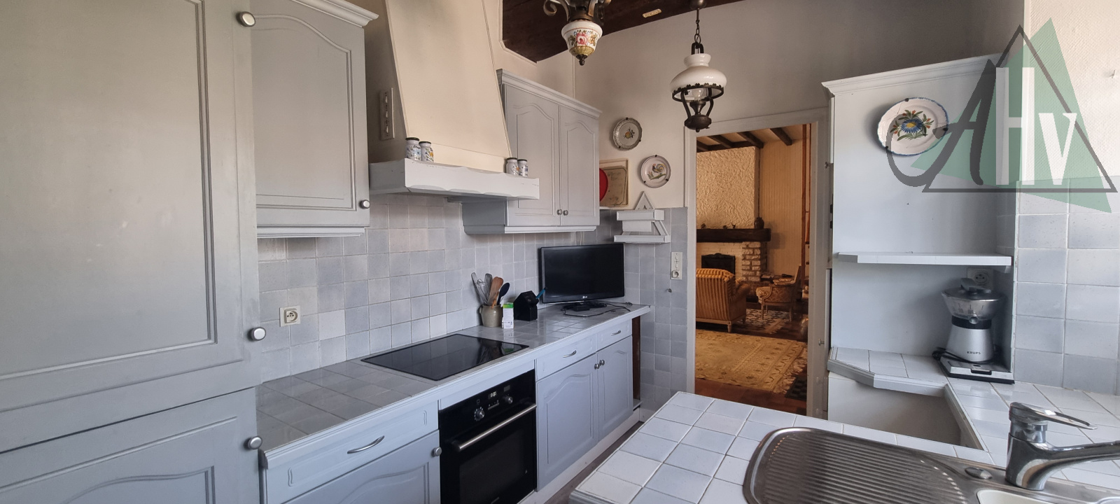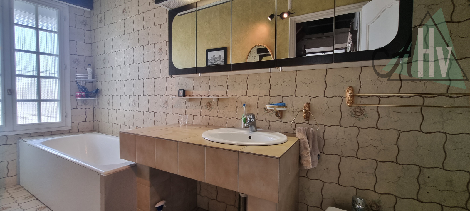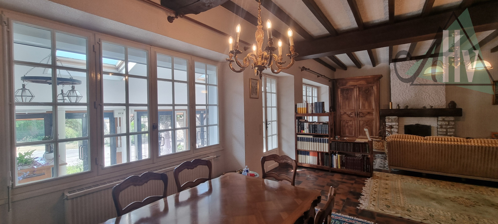 Au rez-de-chaussée : grande véranda comprenant un coin cuisine avec accès à deux caves, séjour avec insert, cuisine aménagée et équipée, dégagement, salle de bains avec douche, WC avec lave-mains et chambre.