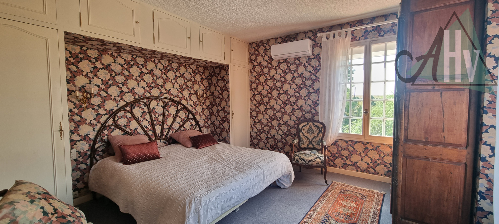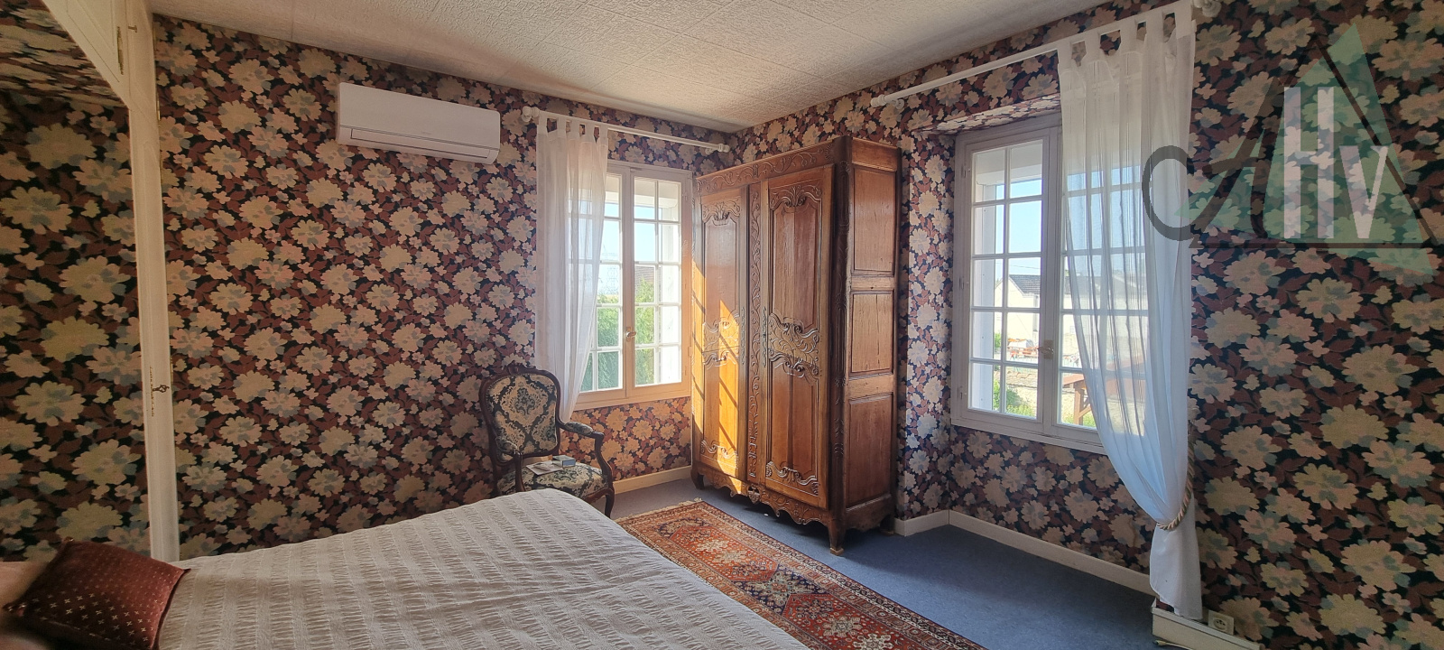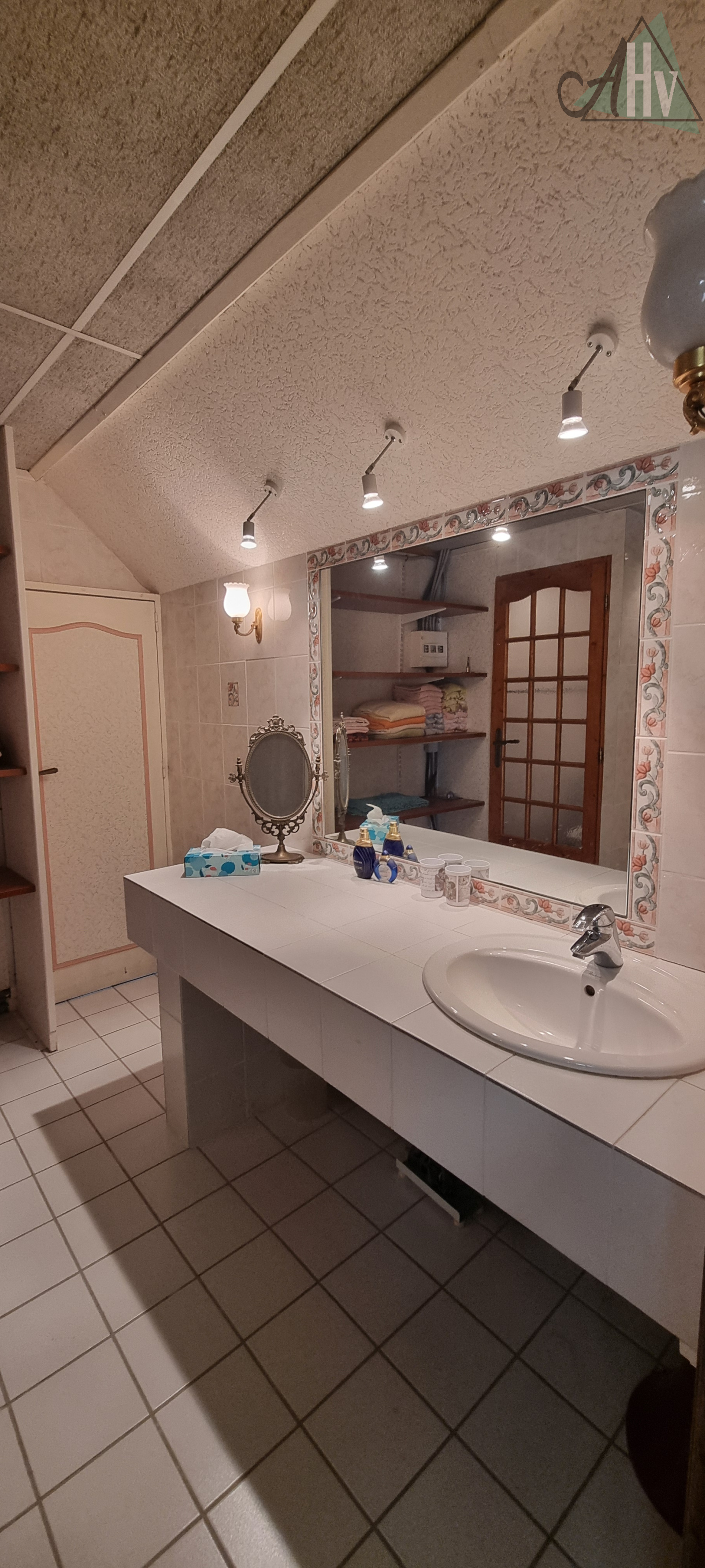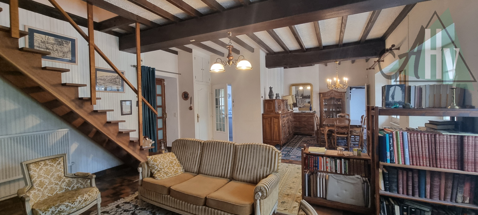 Au rez-de-chaussée : grande véranda comprenant un coin cuisine avec accès à deux caves, séjour avec insert, cuisine aménagée et équipée, dégagement, salle de bains avec douche, WC avec lave-mains et chambre.