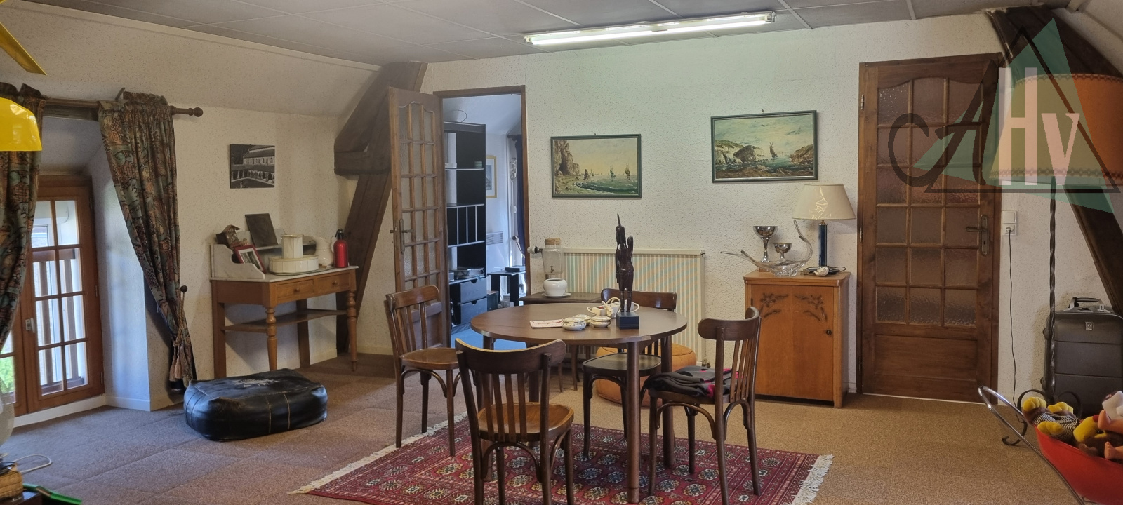 À l'étage : dégagement, deux chambres, salle d'eau avec WC, salle de jeu (ou grande chambre de 40 m²) et bureau.