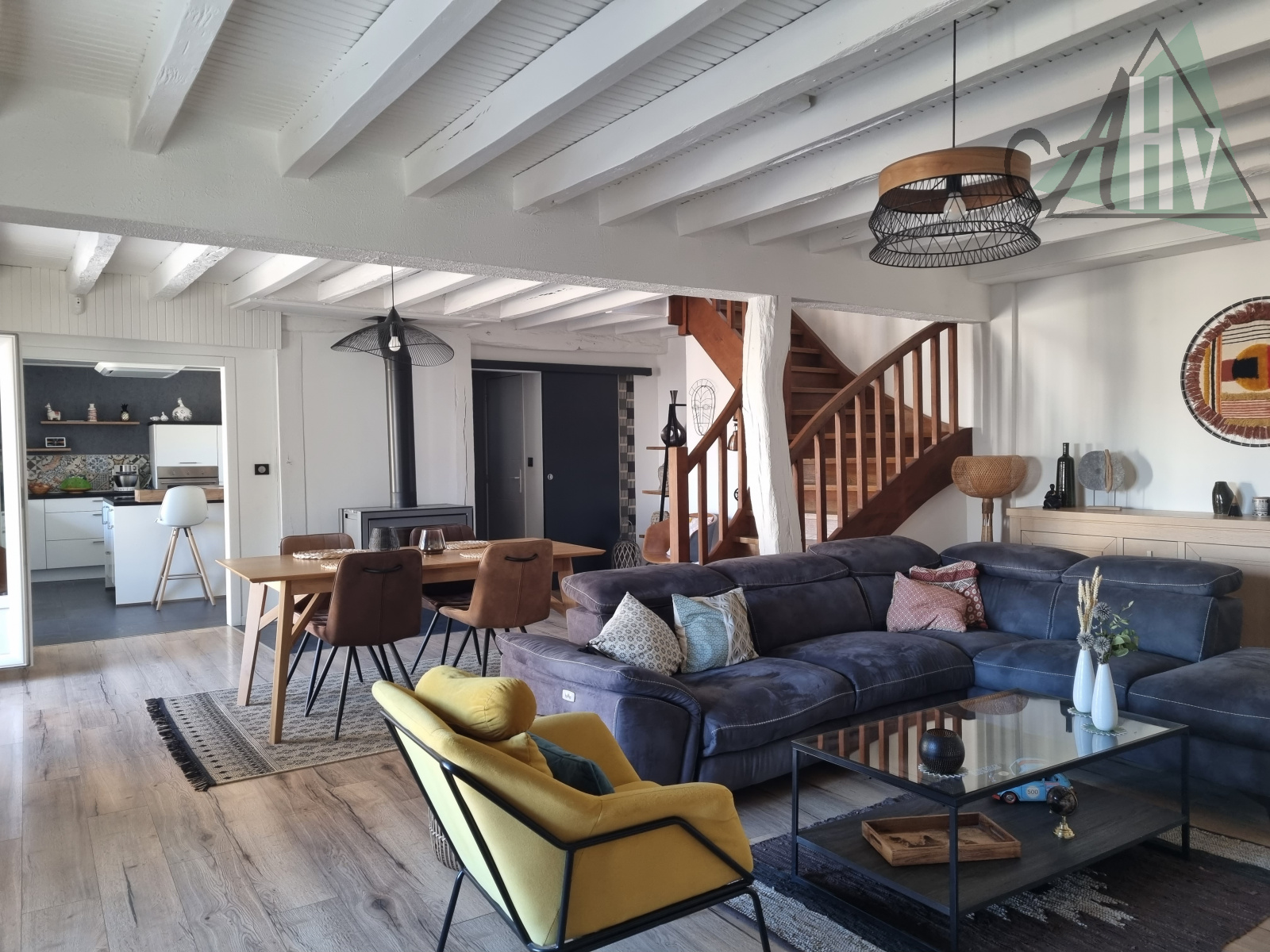 Cette belle maison offre, au rez-de-chaussée : une cuisine aménagée et équipée (récente) de 15 m² ouverte sur un sublime séjour de 50 m² avec poêle à bois, une salle d'eau, un WC, une pièce pouvant être transformée en sas d'entrée, une chaufferie et sa cave.