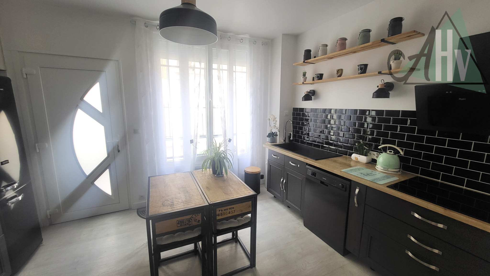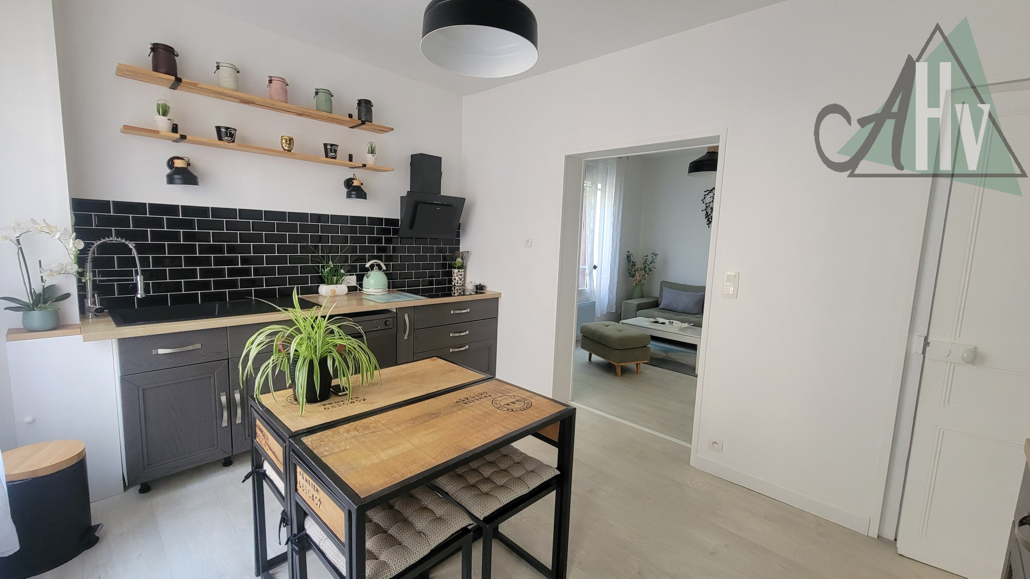 Au rez-de-chaussée : cuisine aménagée et équipée ouverte sur un séjour convivial,