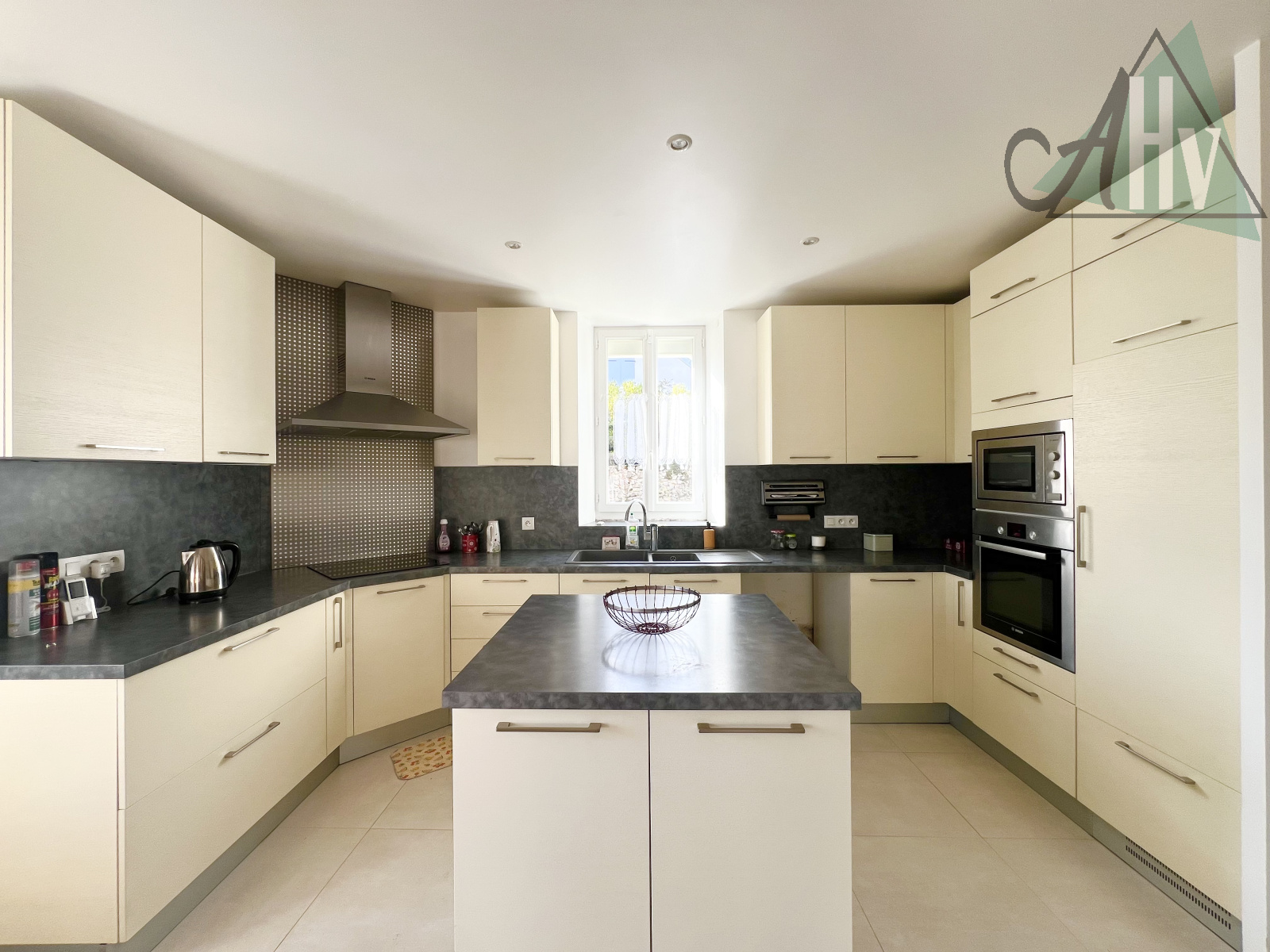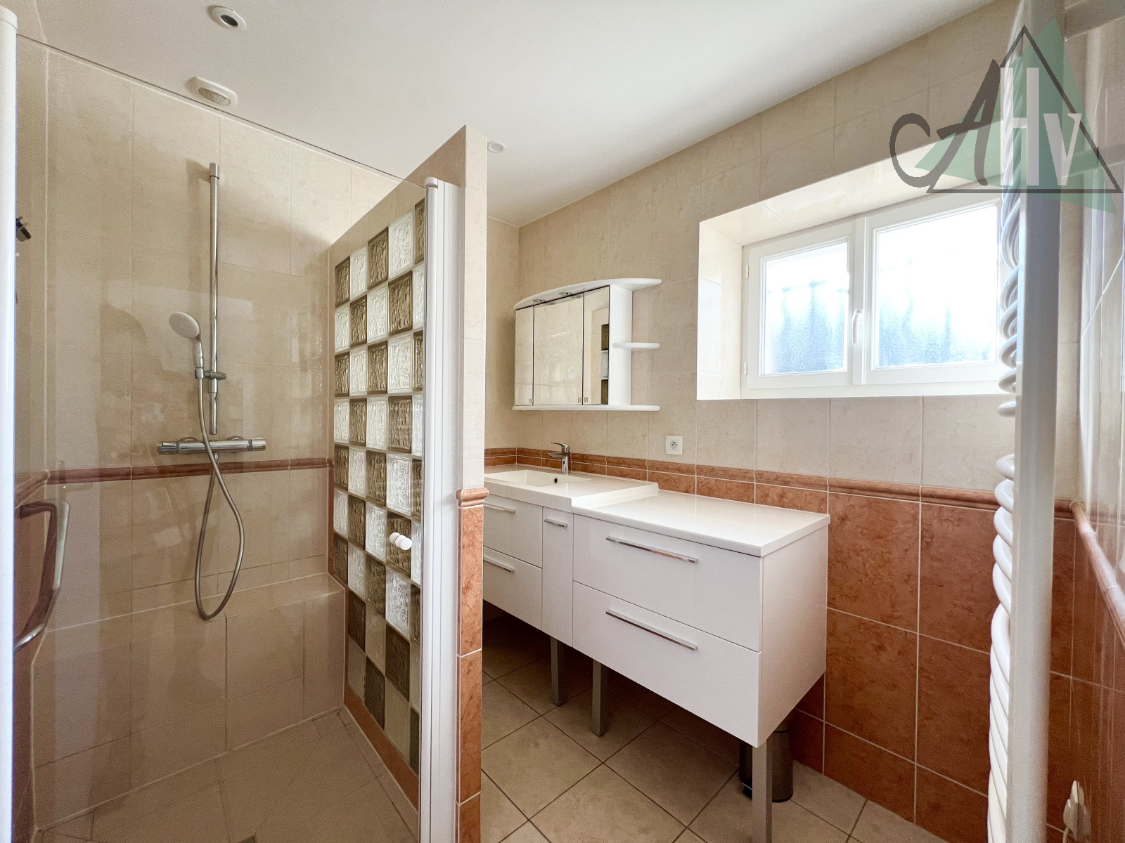 Côté prestations : chauffage central au gaz (citerne) et électrique à l’étage, double vitrage aluminium, volet roulant électrique, alarme, fibre, tout à l’égout.