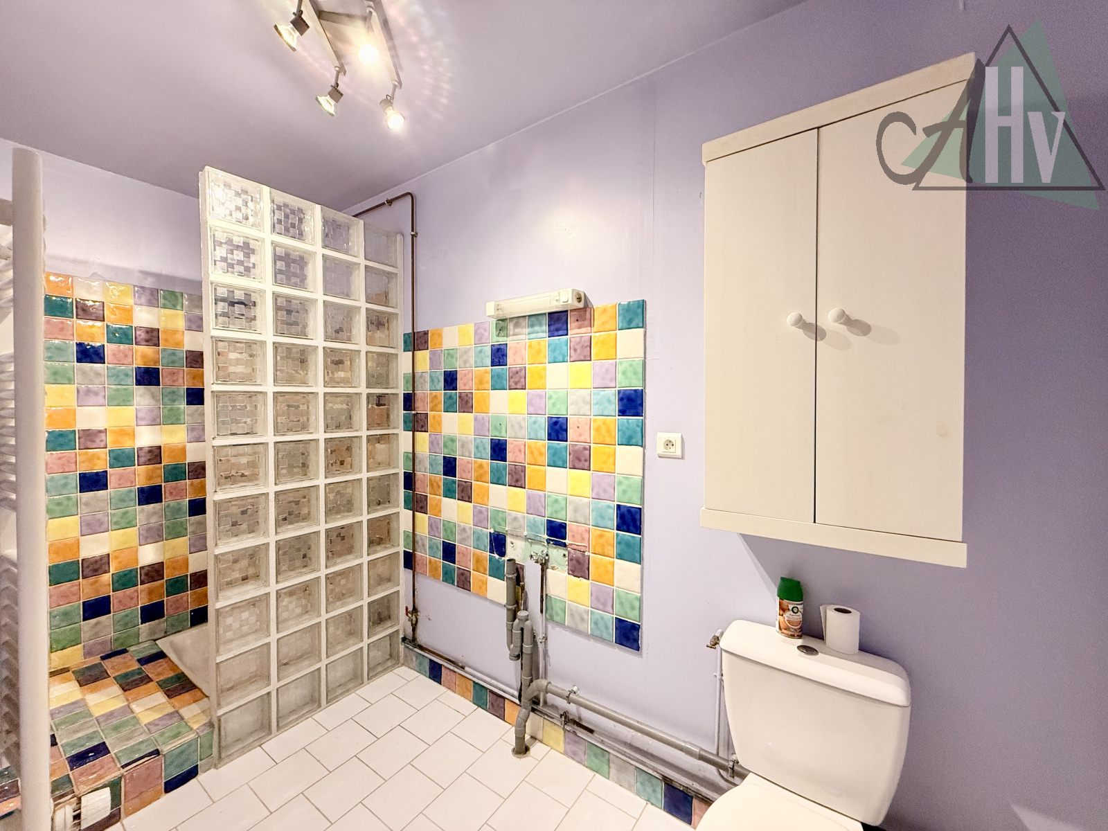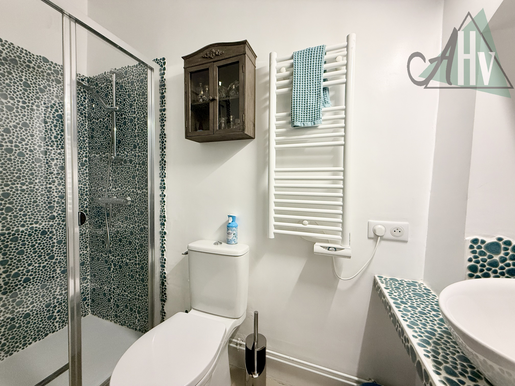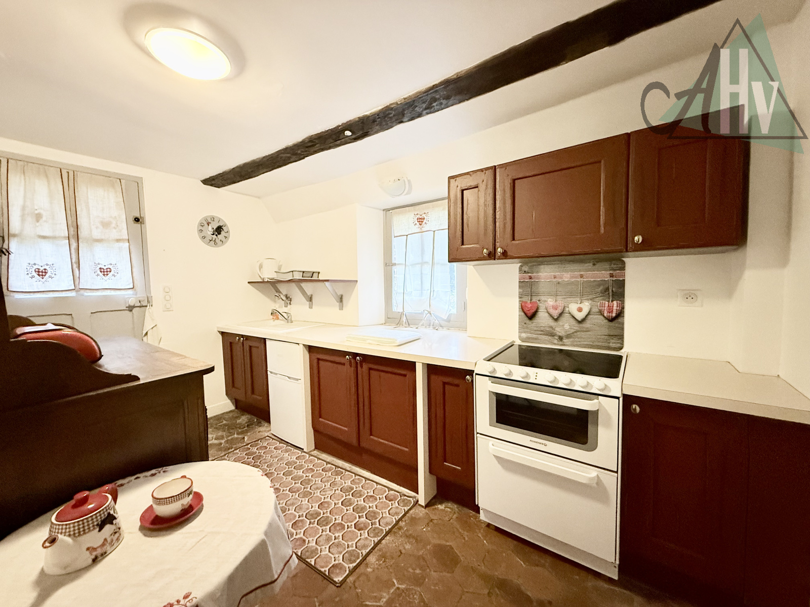 Au rez-de-chaussée : une salle d’eau avec WC, séjour avec poêle à bois, cuisine aménagée – équipée.