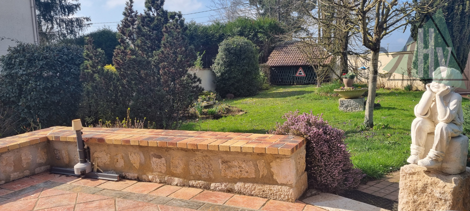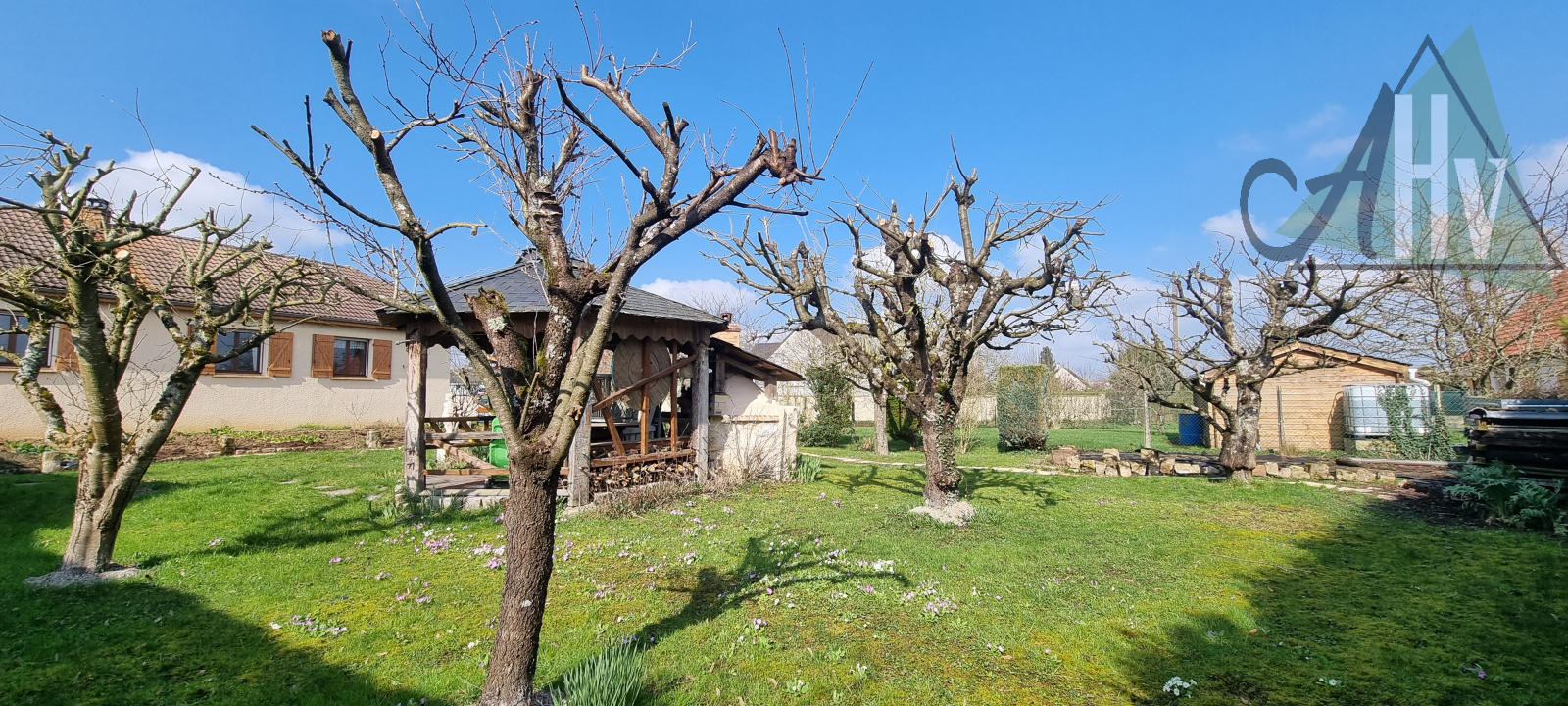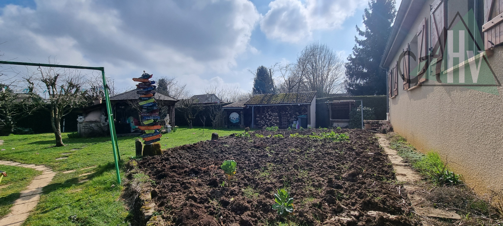 Joli jardin paysagé avec sa pergola offrant un four à pizza idéal pour vos repas entre amis ou en famille, potager, et abris de jardin.