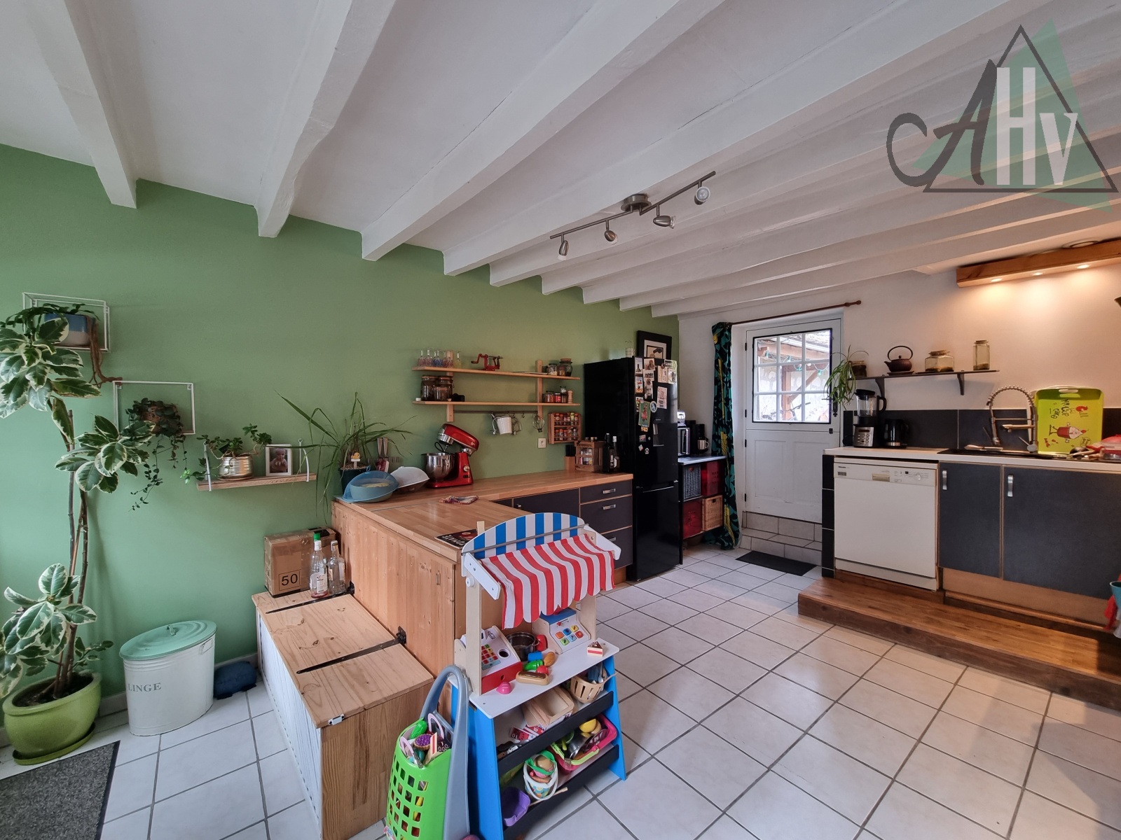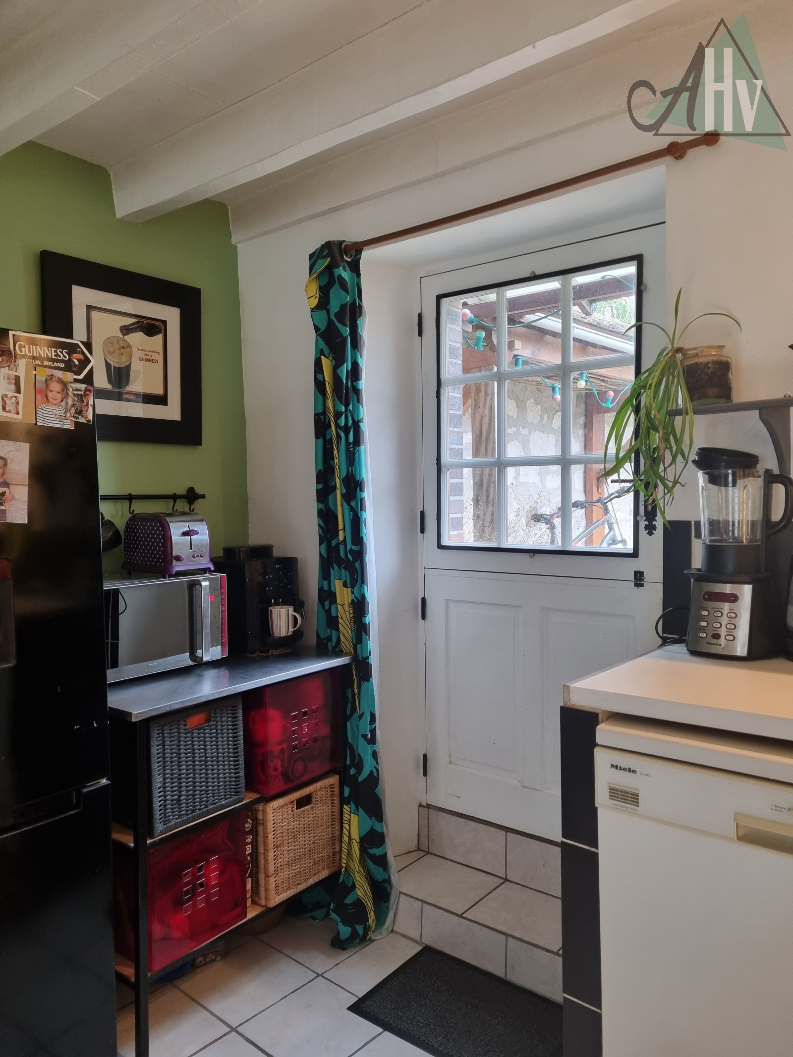 Elle se compose : au rez-de-chaussée : entrée sur cuisine aménagée (accédez directement à la terrasse et au jardin par la porte arrière de la cuisine), séjour avec insert bois et belle chambre lumineuse avec porte-fenêtre.