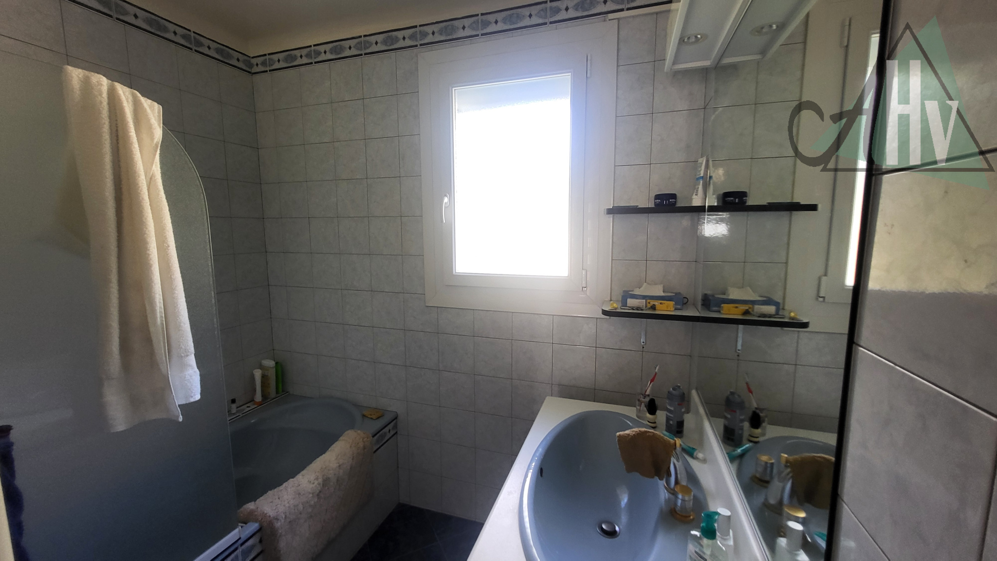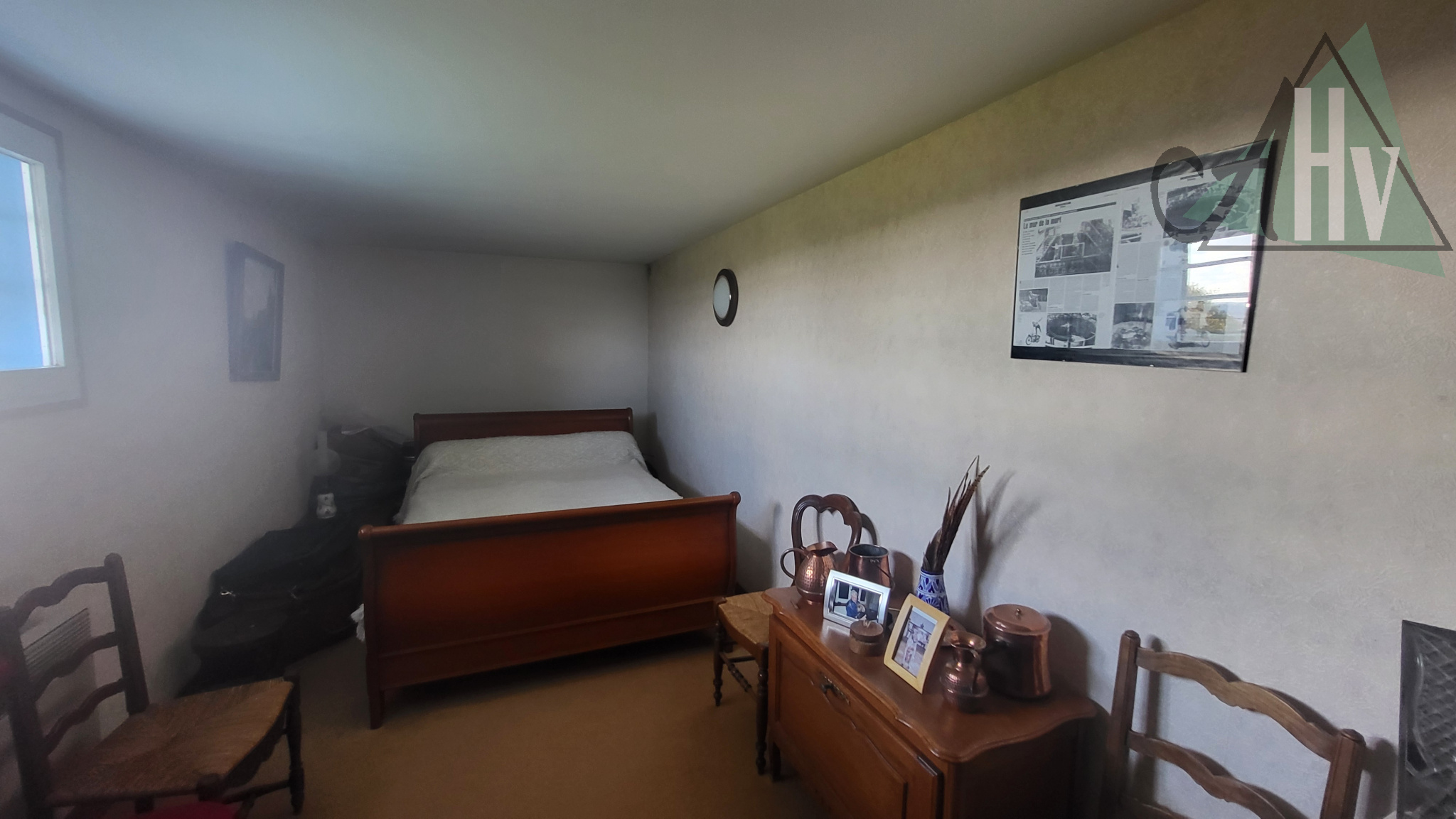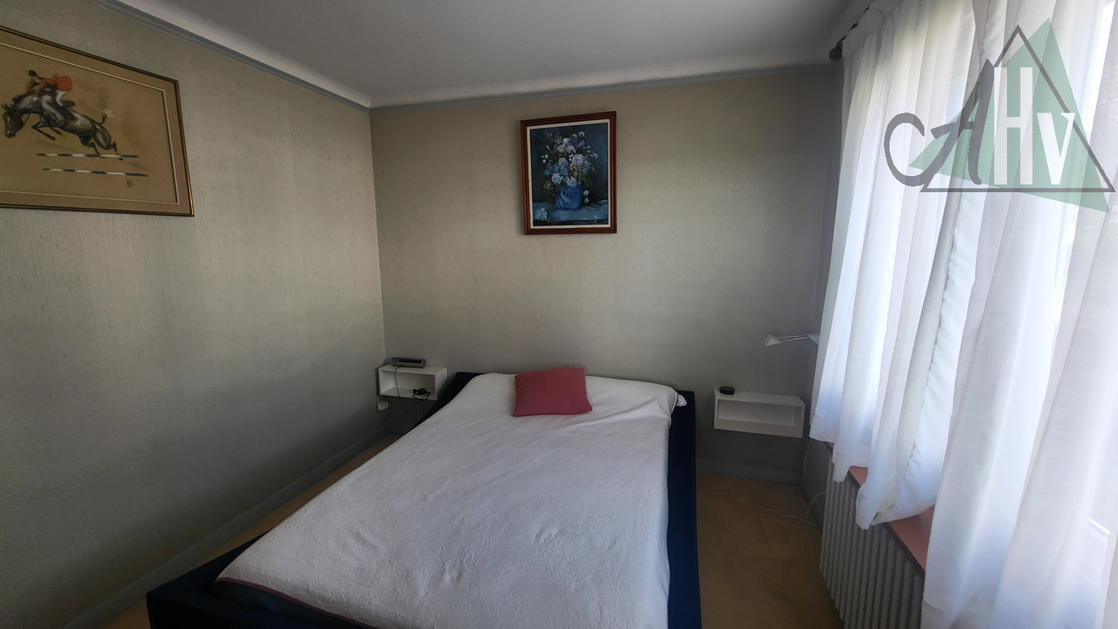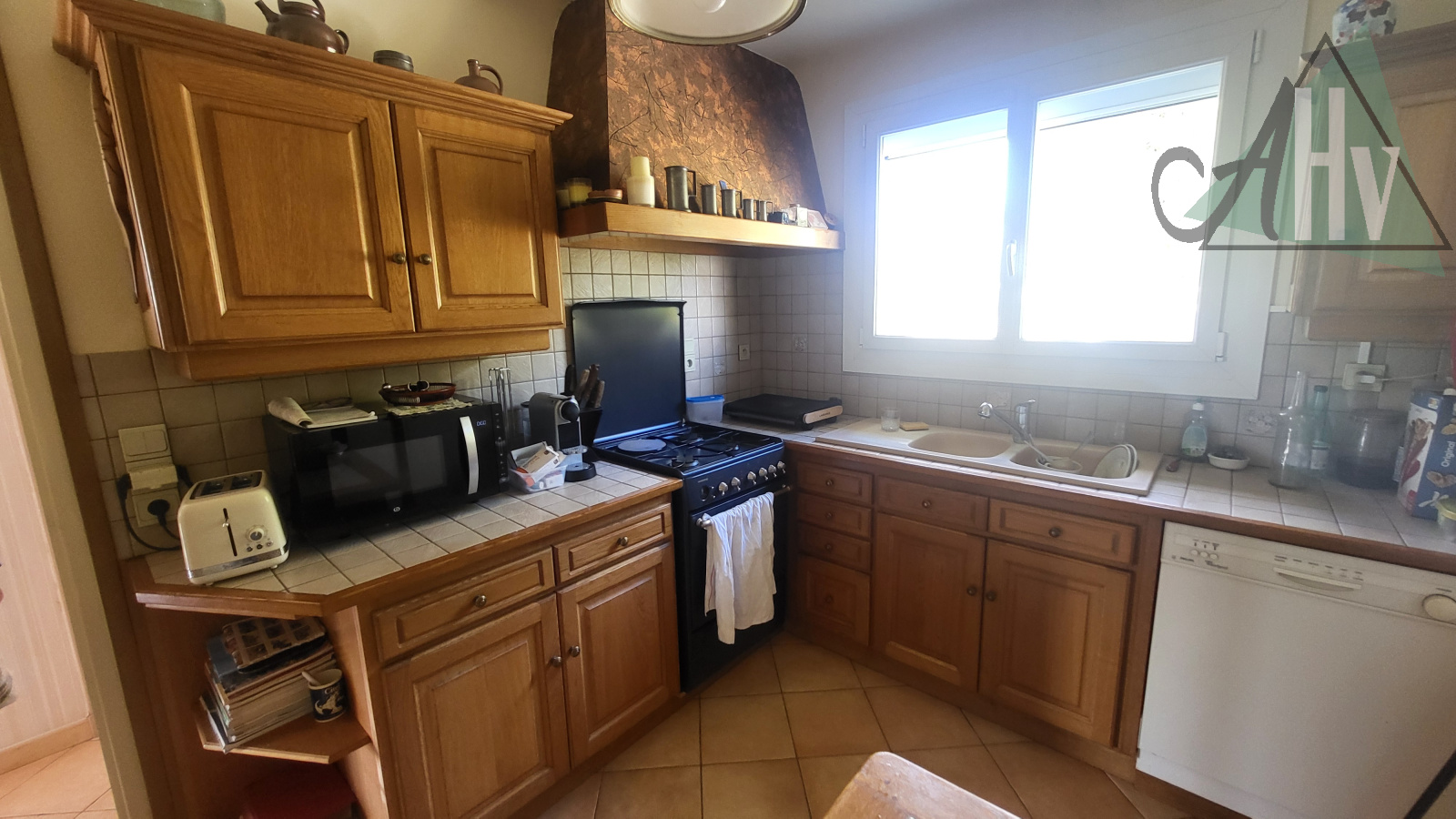 Au rez-de-chaussée sur élevé : entrée sur loggia, cuisine aménagée et équipée, salon-séjour avec cheminée à insert, salle de bains, wc, deux chambres,