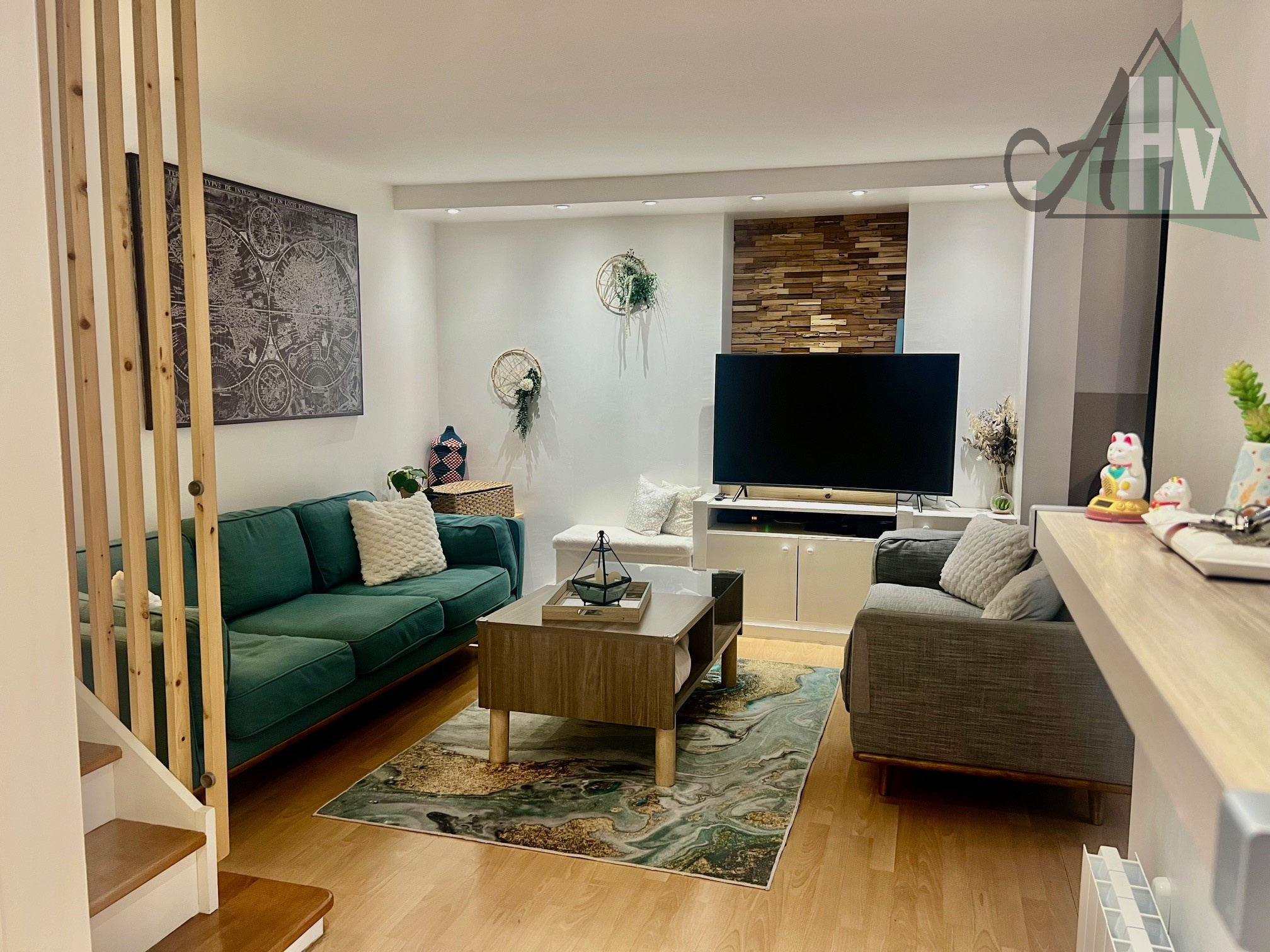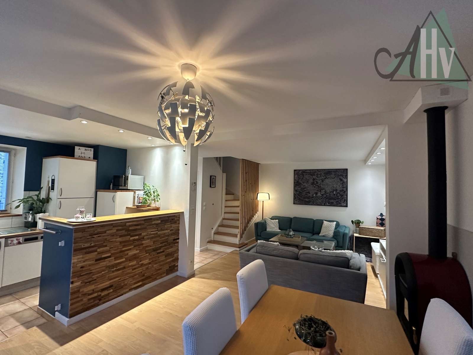 Au rez-de-chaussée : entrée sur salon-séjour ouvert sur cuisine aménagée - équipée, WC,