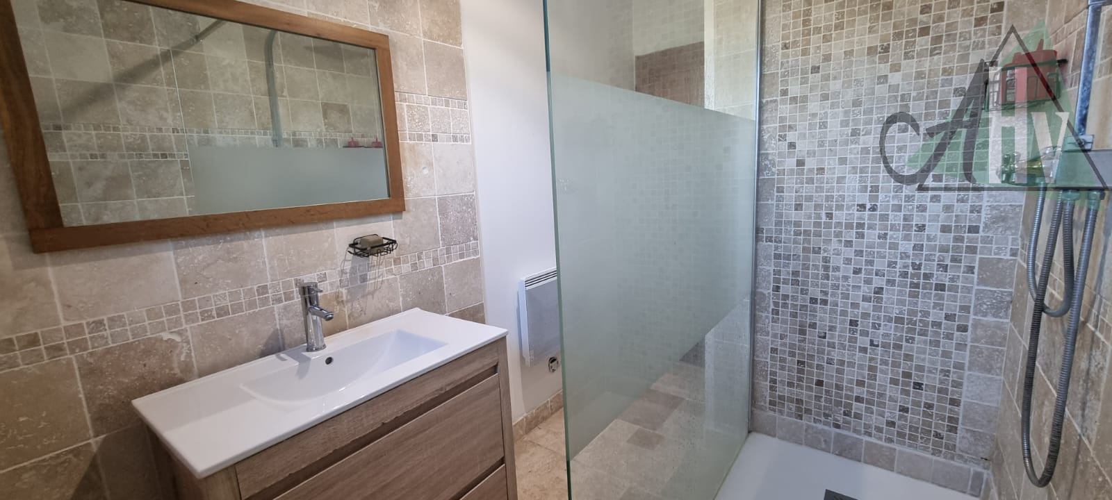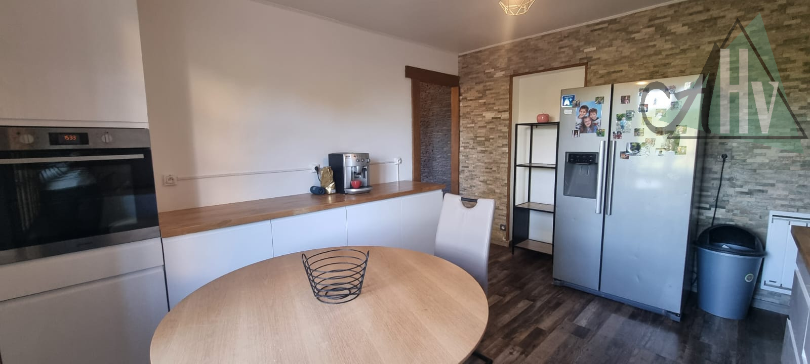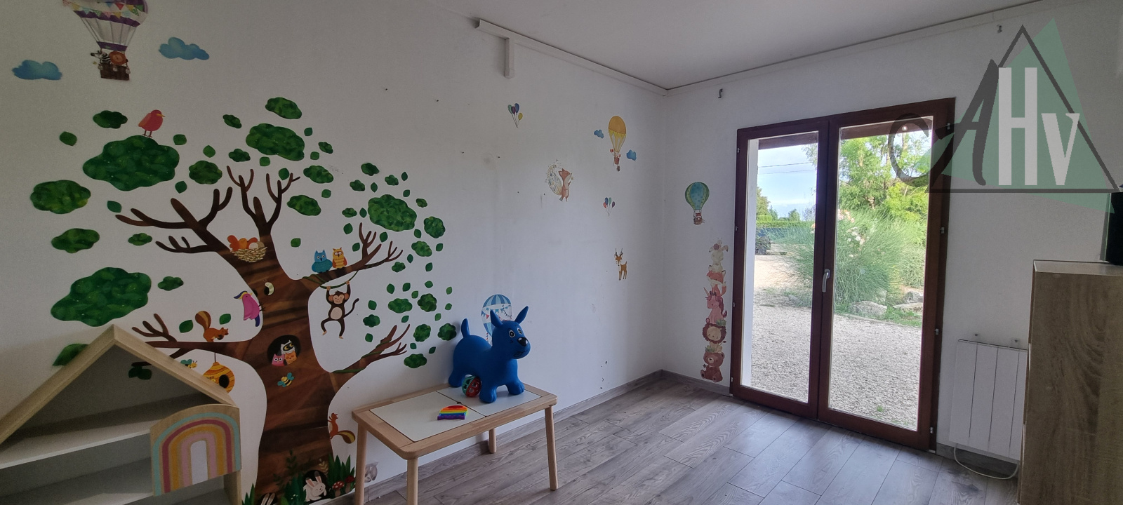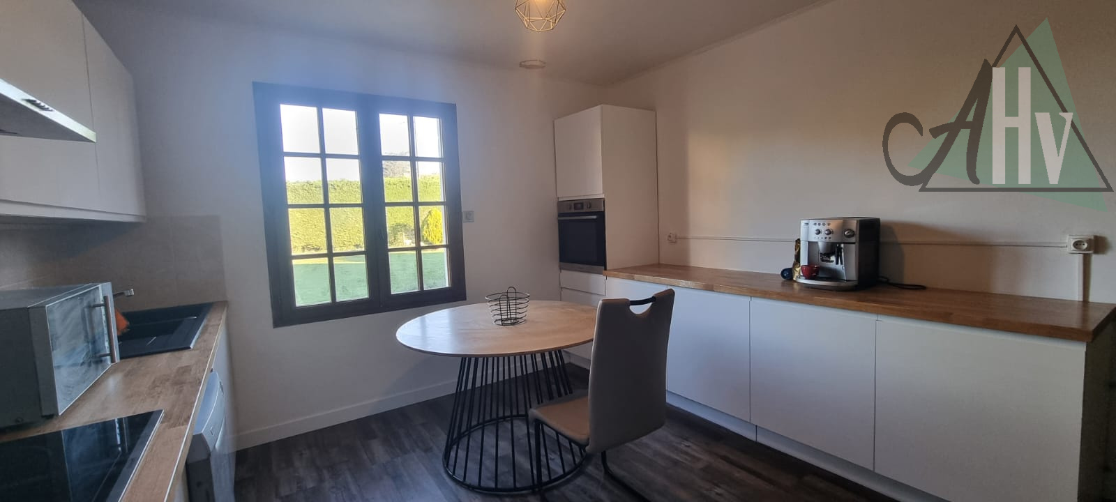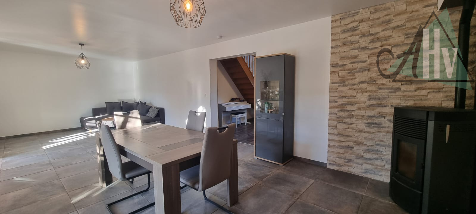 Au rez-de-chaussée : une grande entrée, un salon-séjour donnant sur la terrasse côté jardin, avec poêle à granulés, une cuisine, trois chambres, une salle de douche, un WC indépendant ainsi qu’une buanderie.
