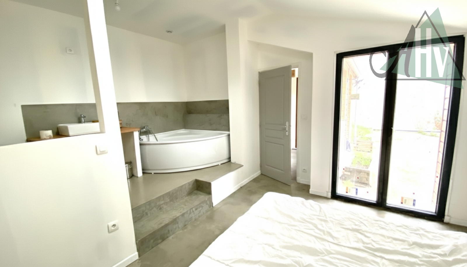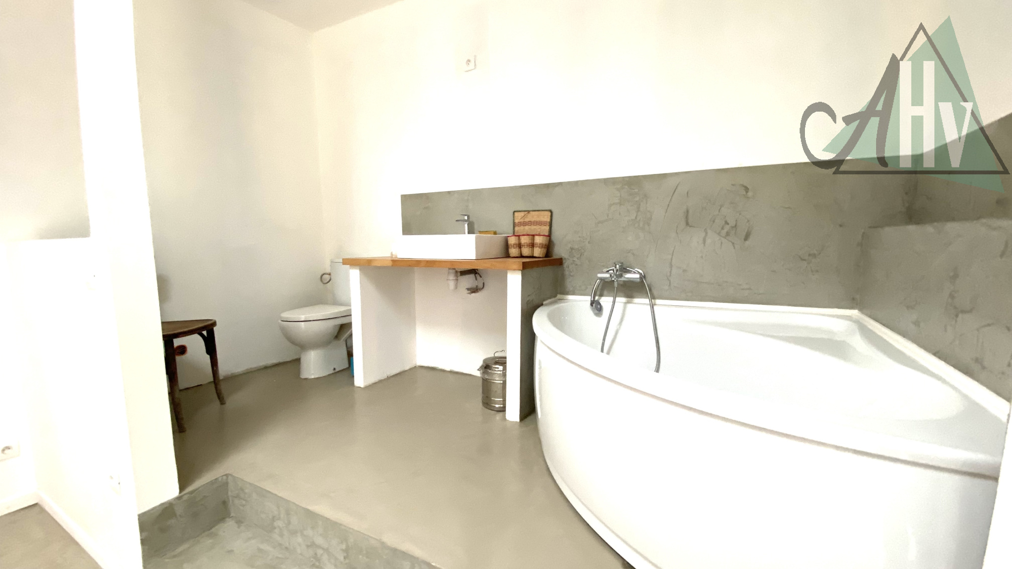 A l'étage : mezzanine (possibilité d'une petite chambre) desservant une chambre ainsi qu' une salle d'eau avec WC.