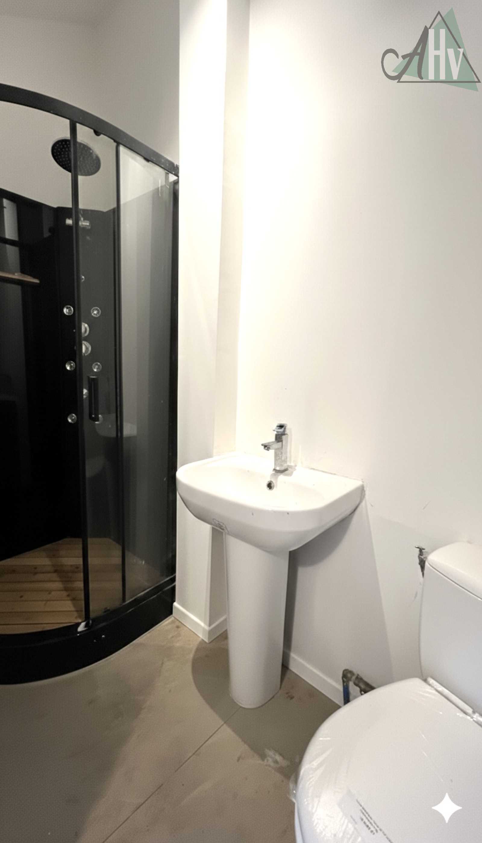 Au RDC : entrée sur belle pièce de vie avec son coin cuisine, une chambre parentale avec sa salle de bains et WC.