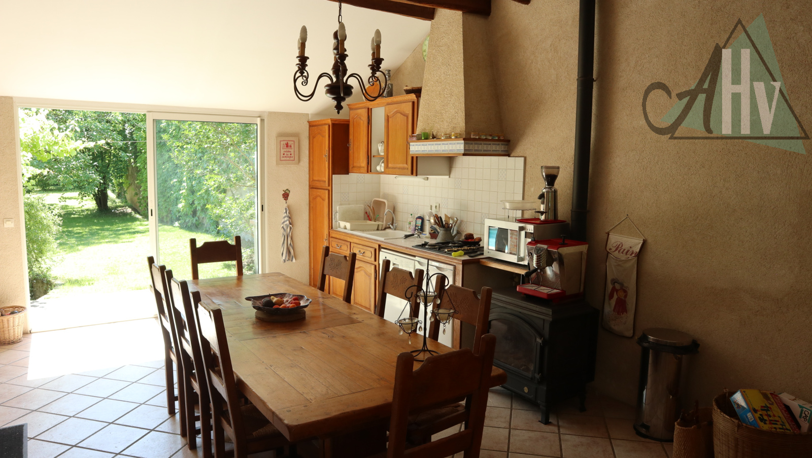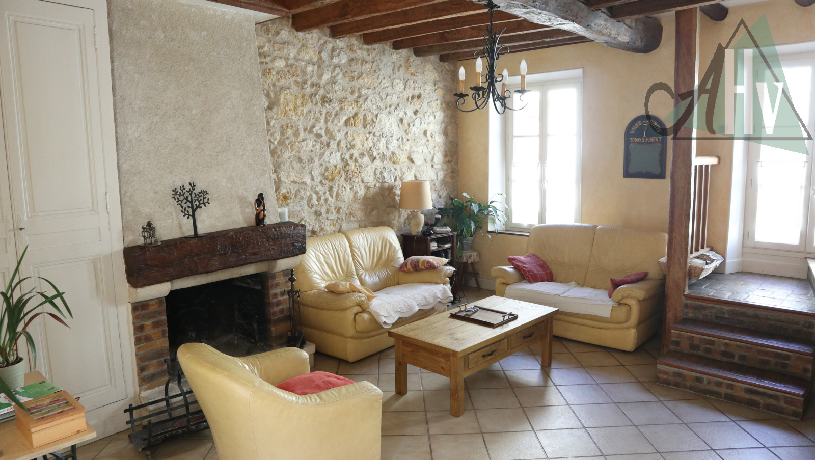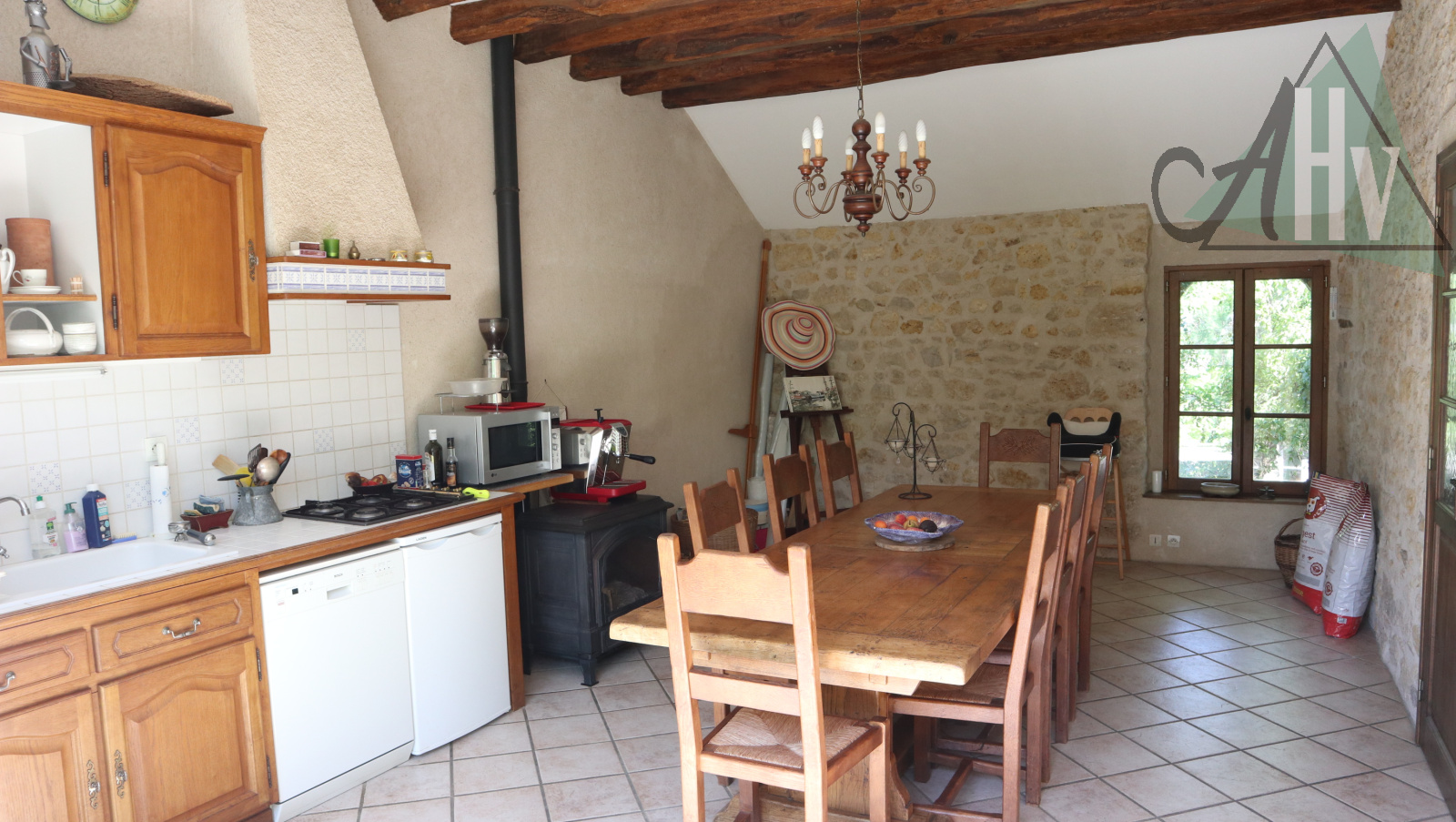 La maison comprend : au RDC : entrée, salon de 25 m² avec cheminée, cuisine aménagée équipée ouverte sur séjour de 20 m², wc avec lave-mains.