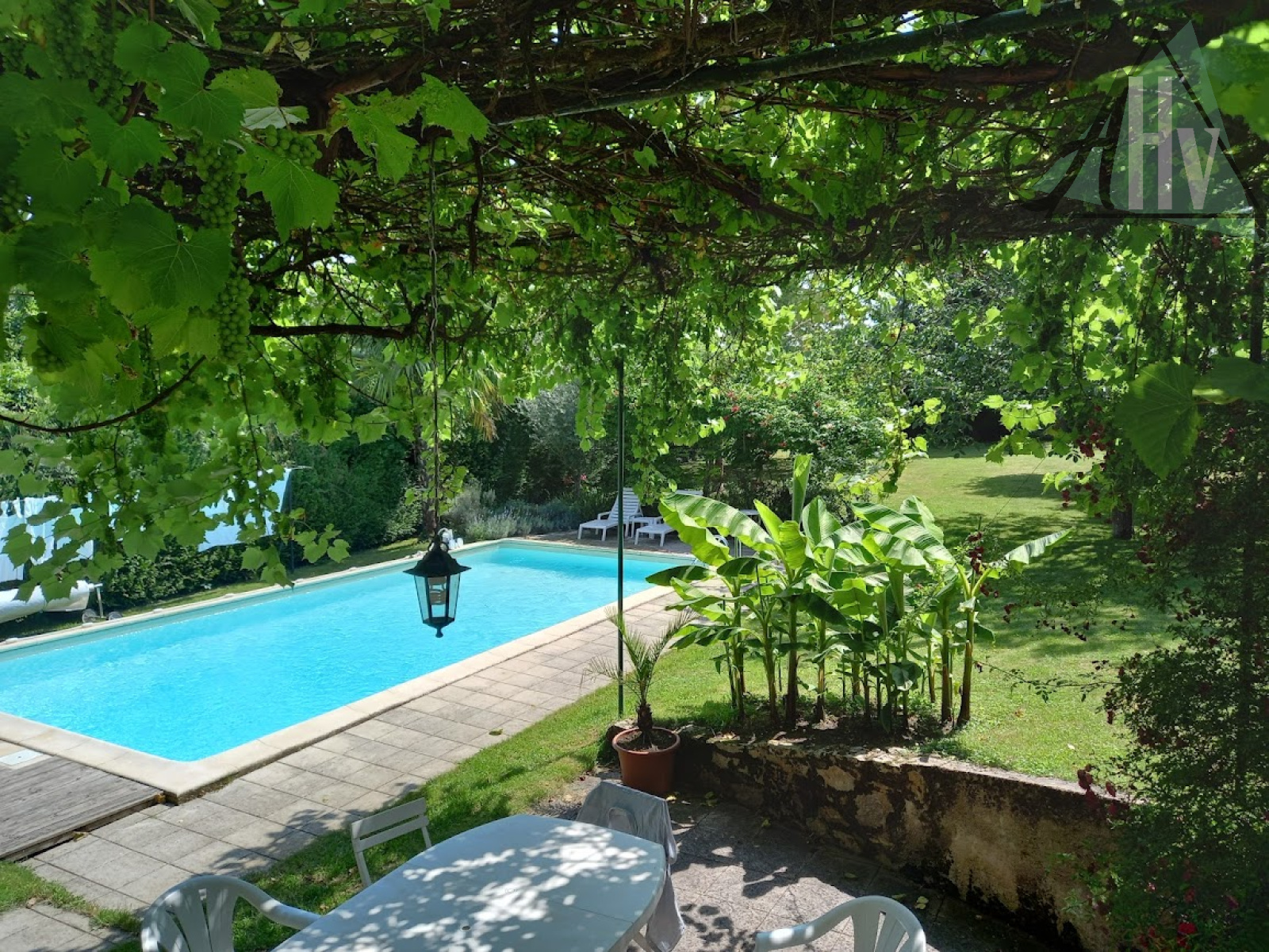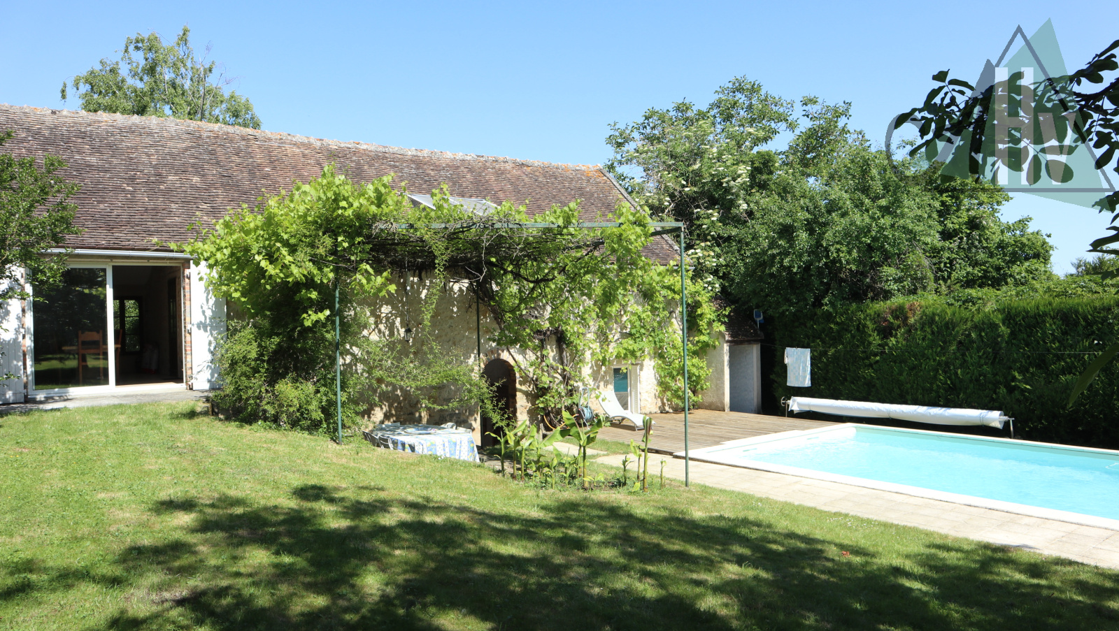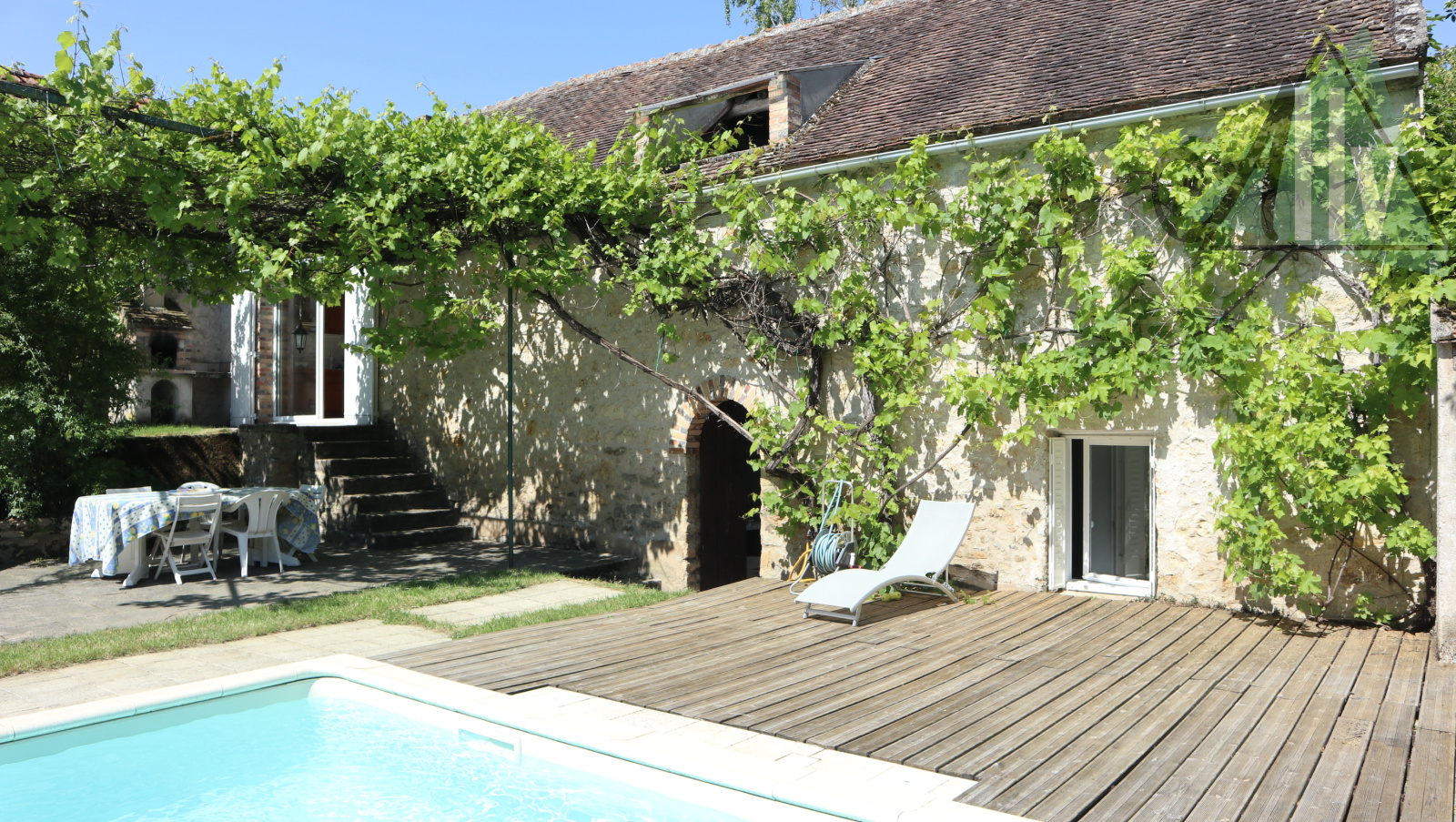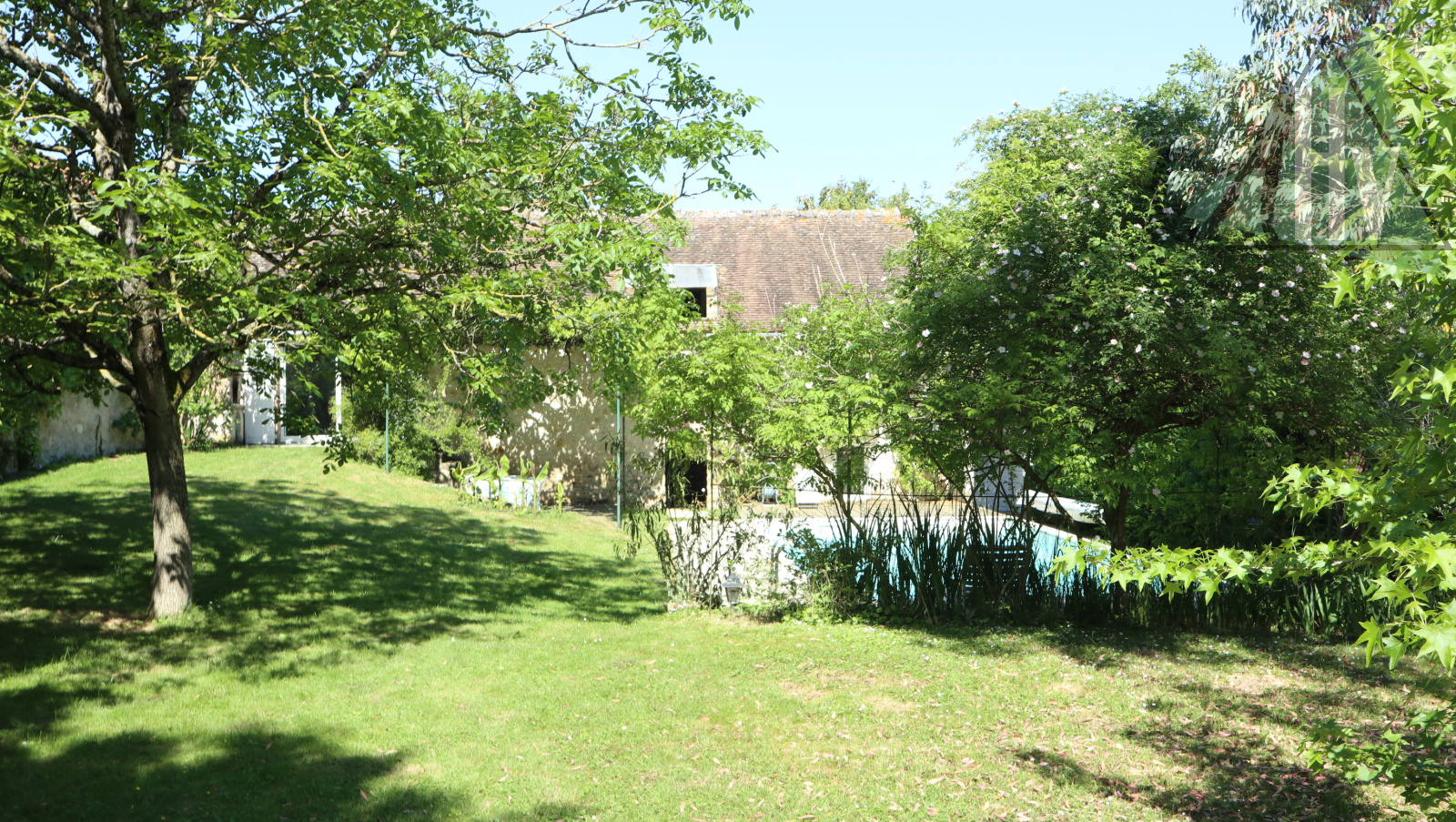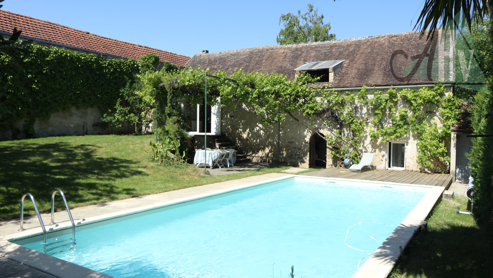 Belle cour intérieure donnant sur une grange ouverte avec cuisine d'été de 25 m² et vue sur le jardin arboré avec une belle piscine et terrasse.