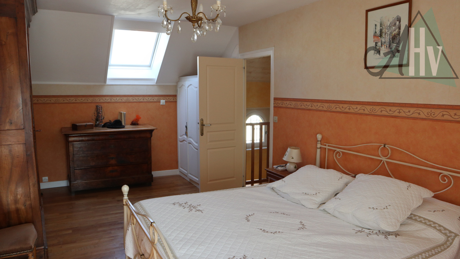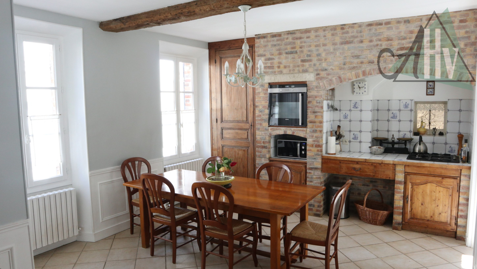 A l'étage : trois belles chambres (18 - 17 et 11 m²), salle de bains, salle d'eau avec wc, dégagement avec coin bureau.