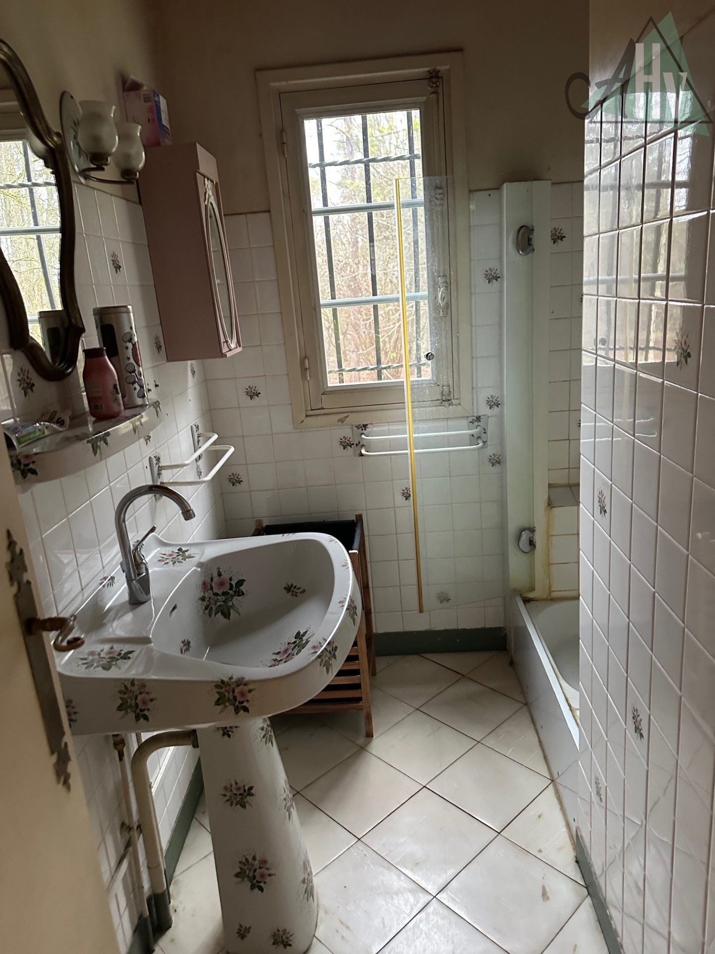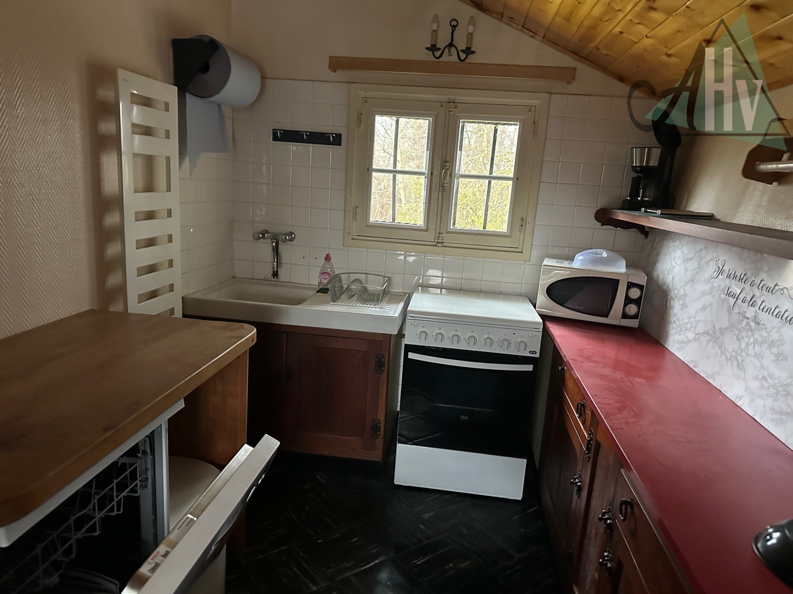 Au rez-de-chaussée : cuisine, salon-séjour avec poêle à bois, terrasse et balcon, dégagement, salle de bains, chambre, wc,