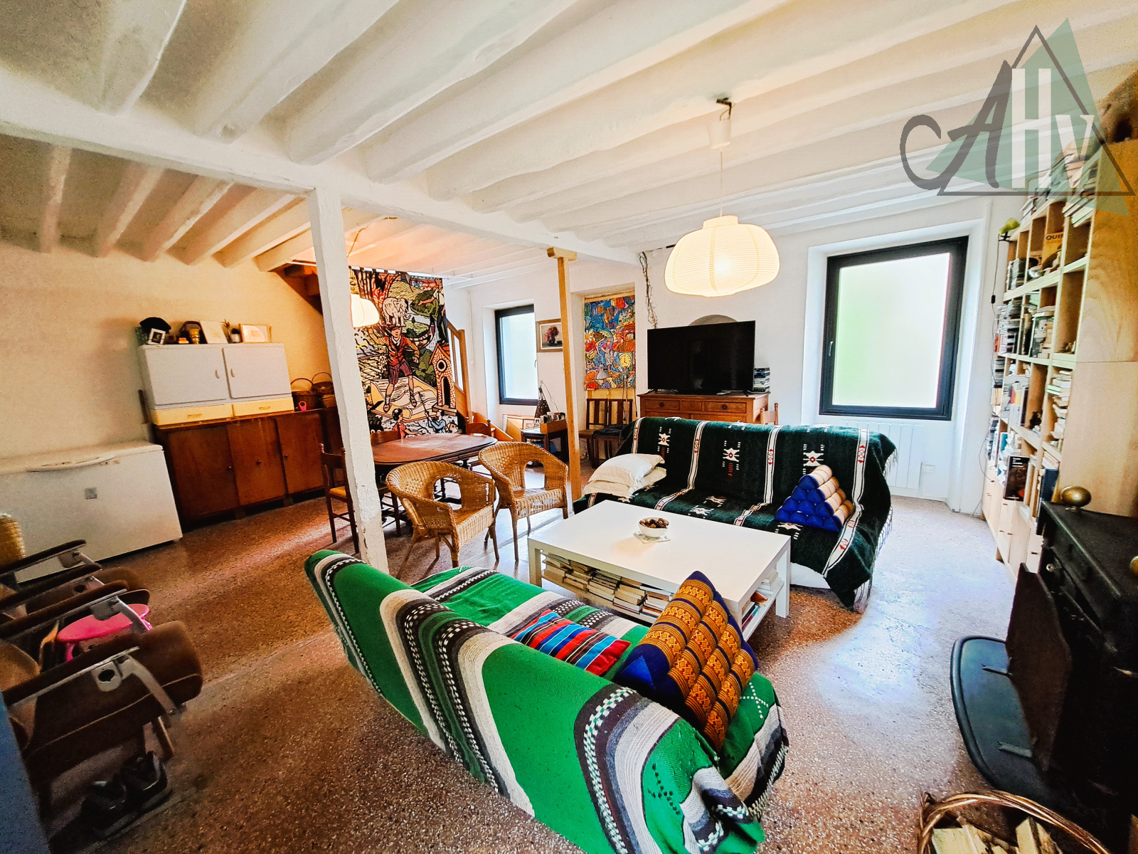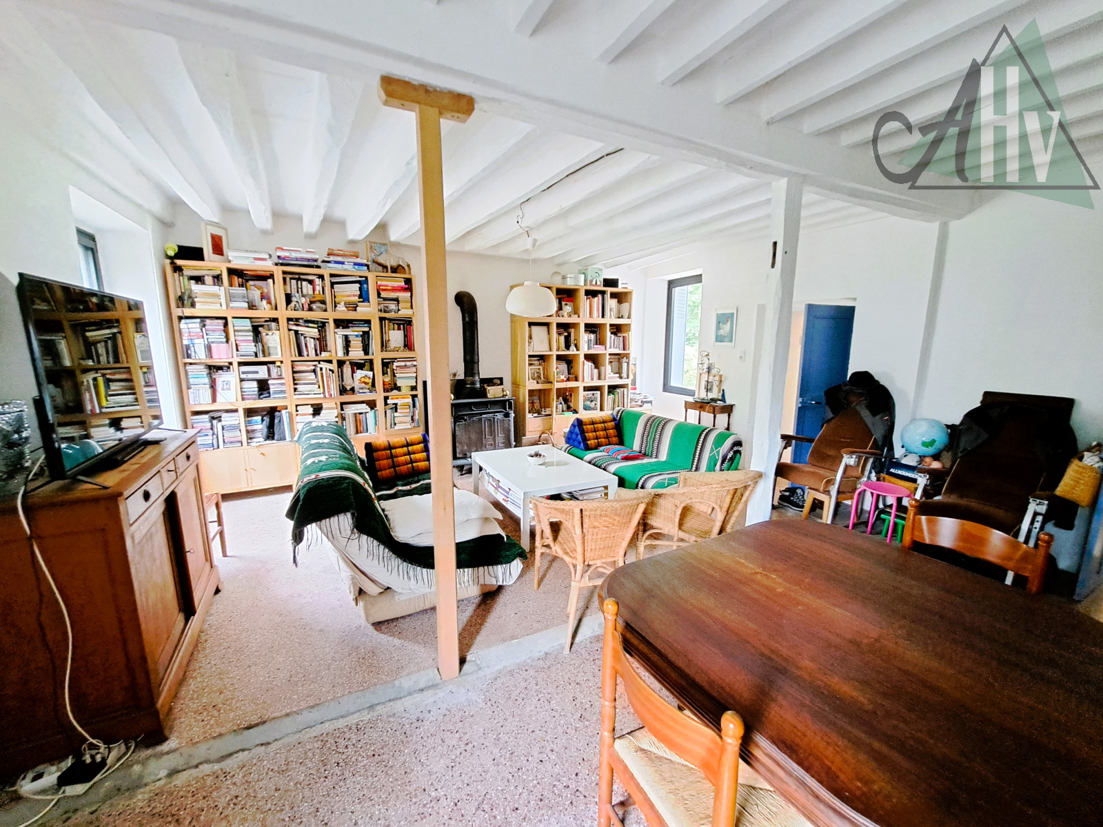 La maison principale : au RDC : entrée sur cuisine aménagée équipée de 21 m², grand salon de 39 m² avec poêle à bois, belle pièce à vivre de 32 m² avec baie vitrée et mezzanine ;