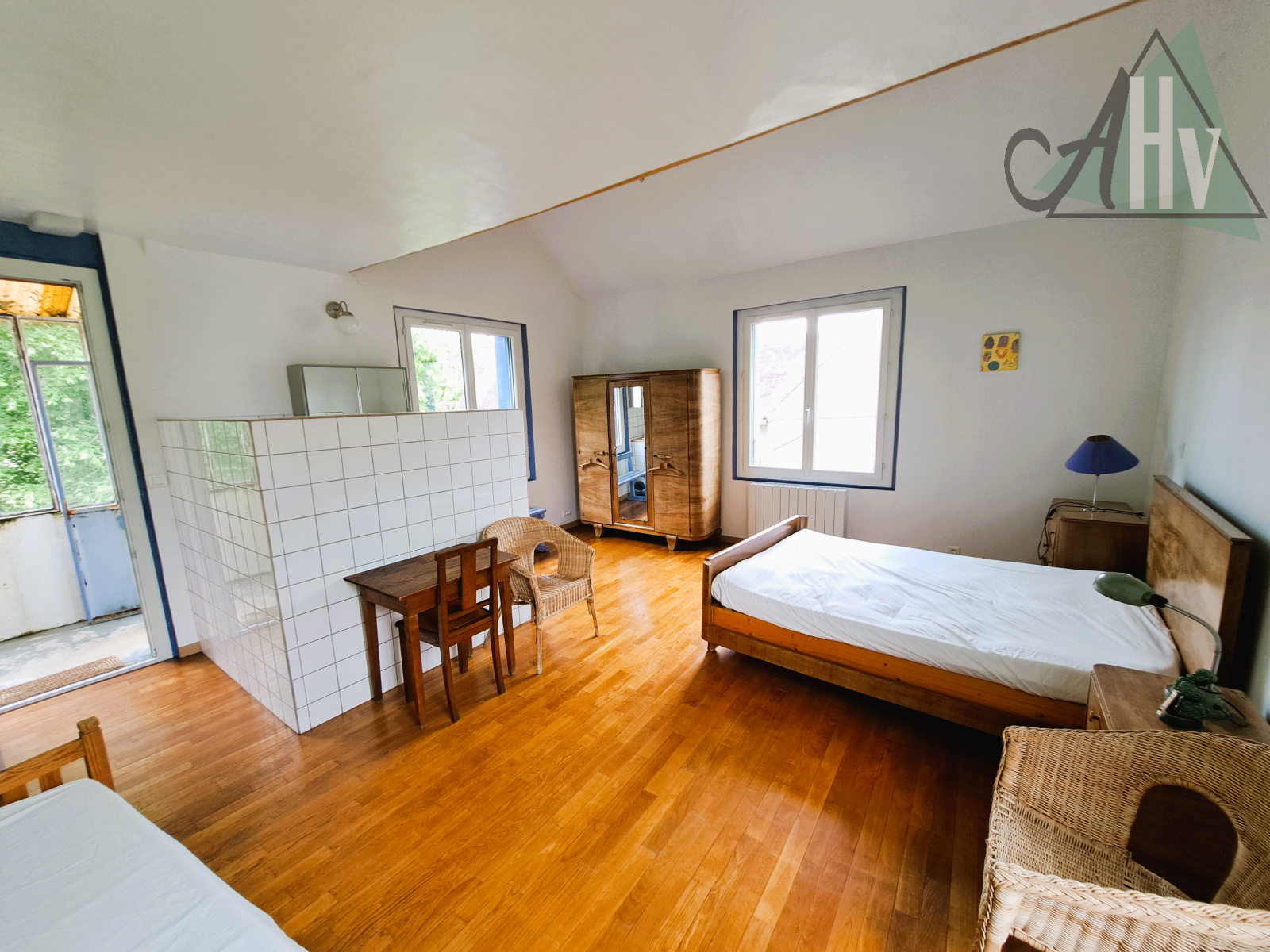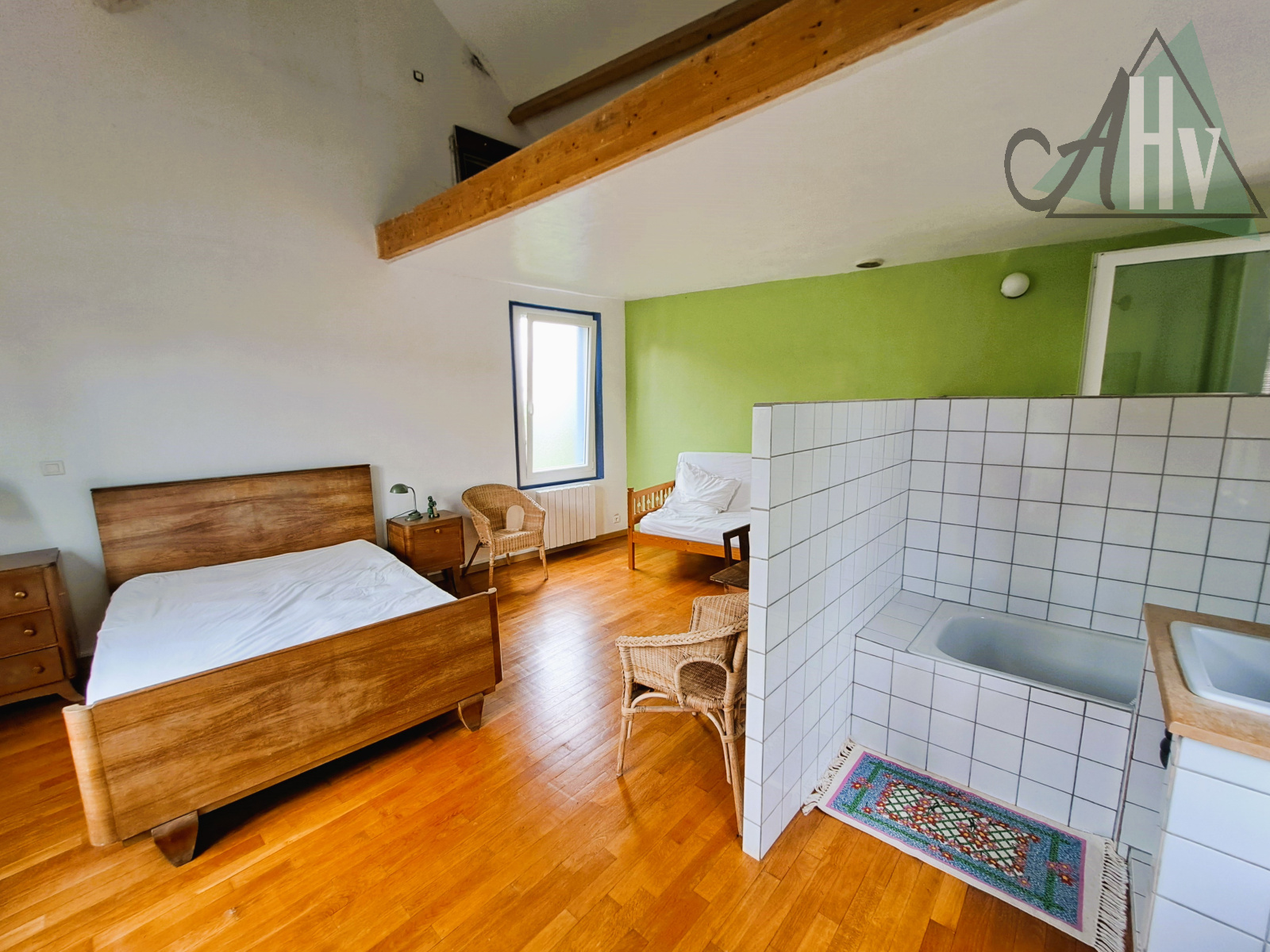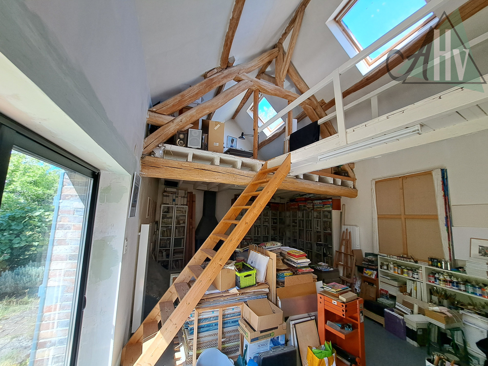 à l'étage : deux chambres (19 m² et 14,5 m²), salle d'eau avec wc, passerelle vers la mezzanine de 9 m².