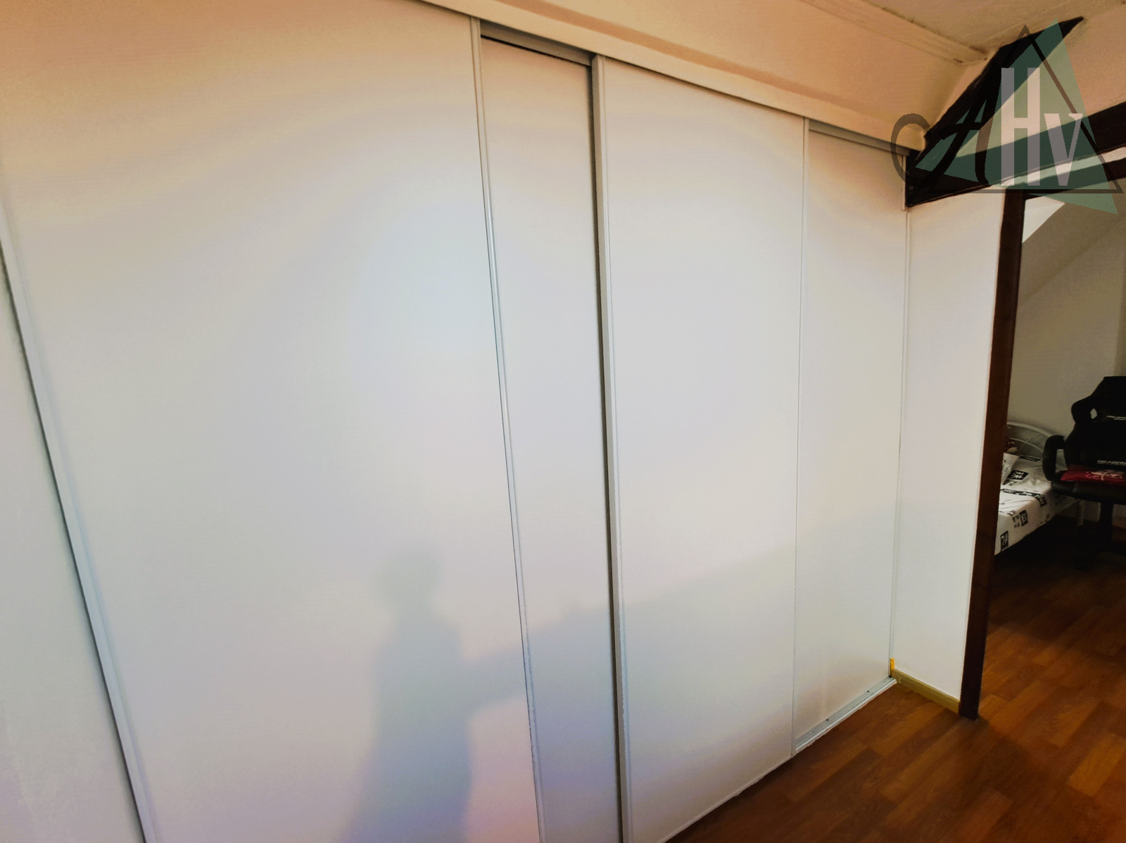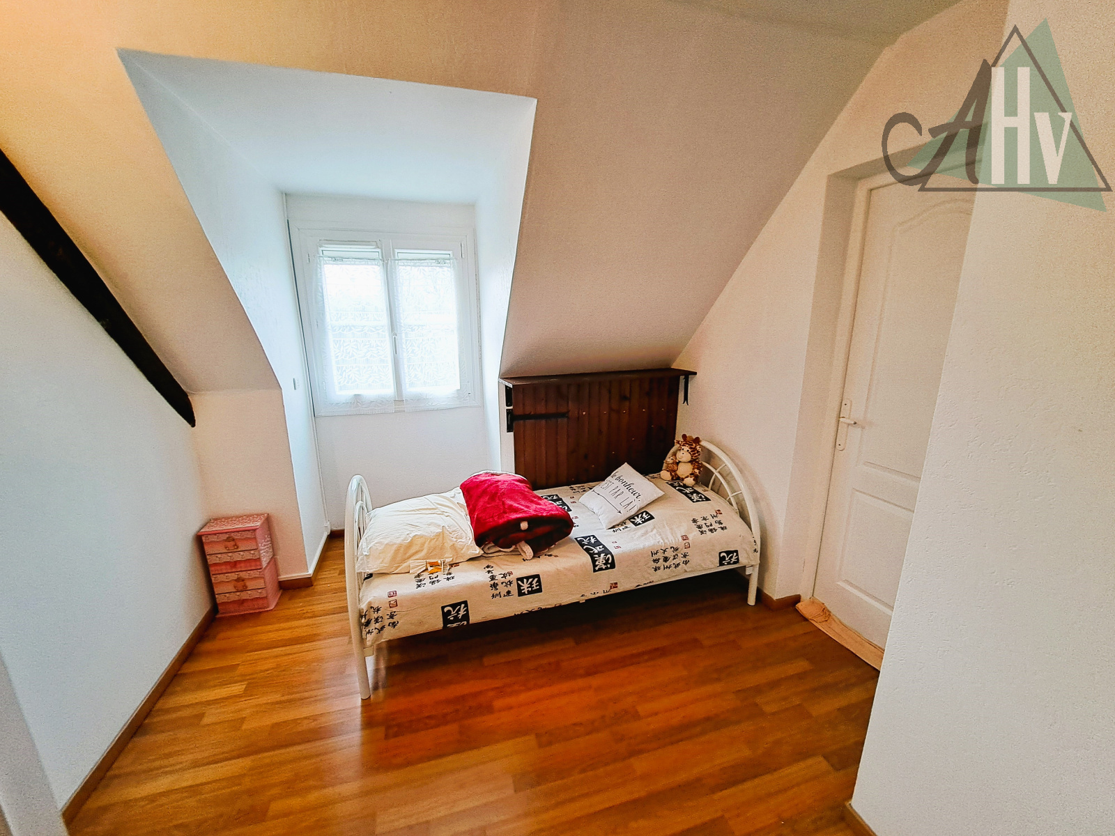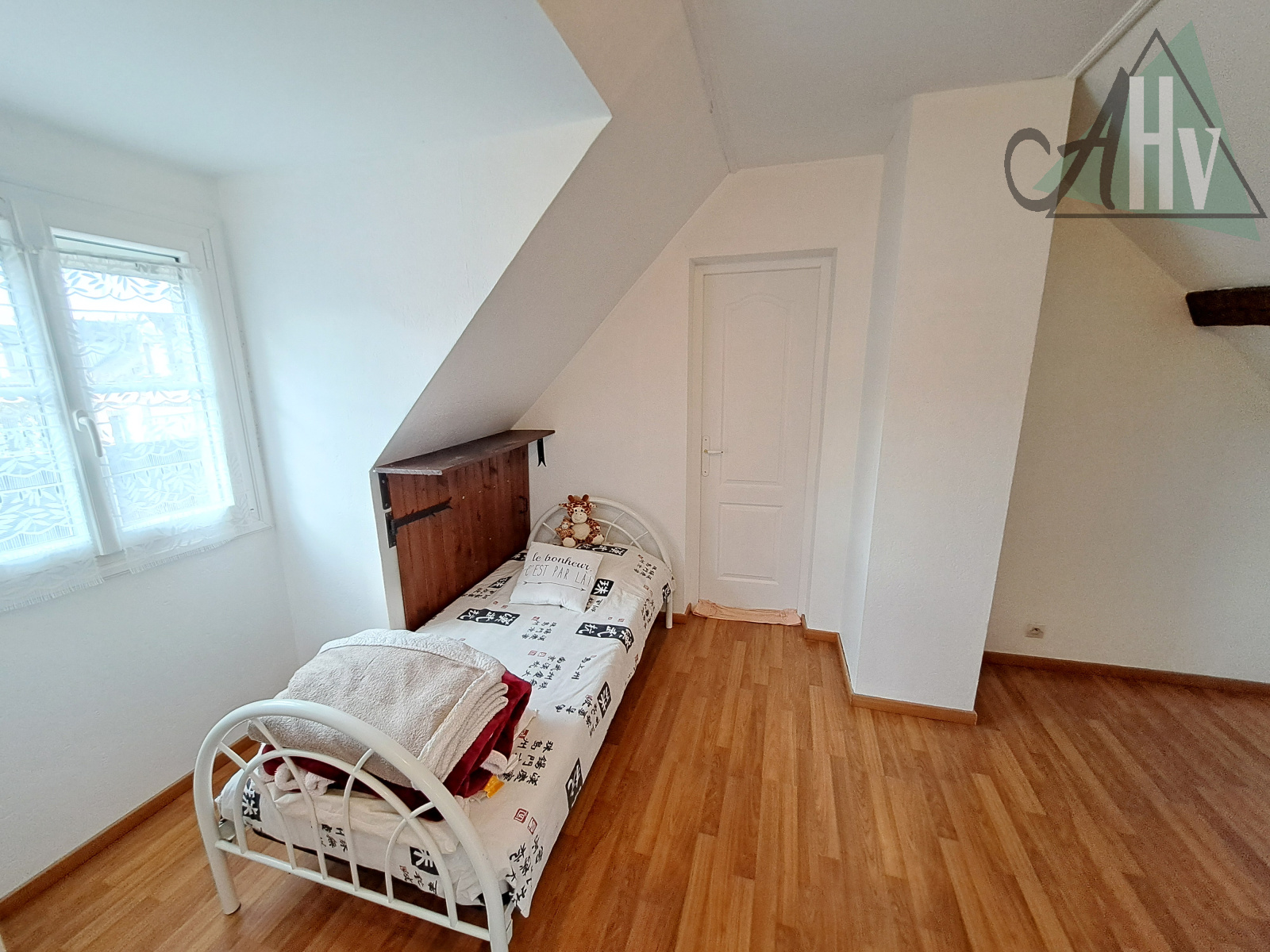 à l'étage : deux chambres d'environ 12 m², dégagement avec grand placard / penderie, pièce à terminer d'aménager de 14,5 m² (3ème chambre possible) avec escalier vers le garage.