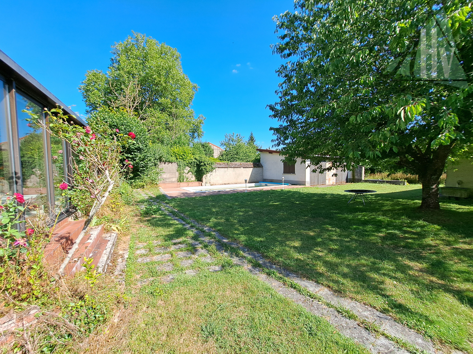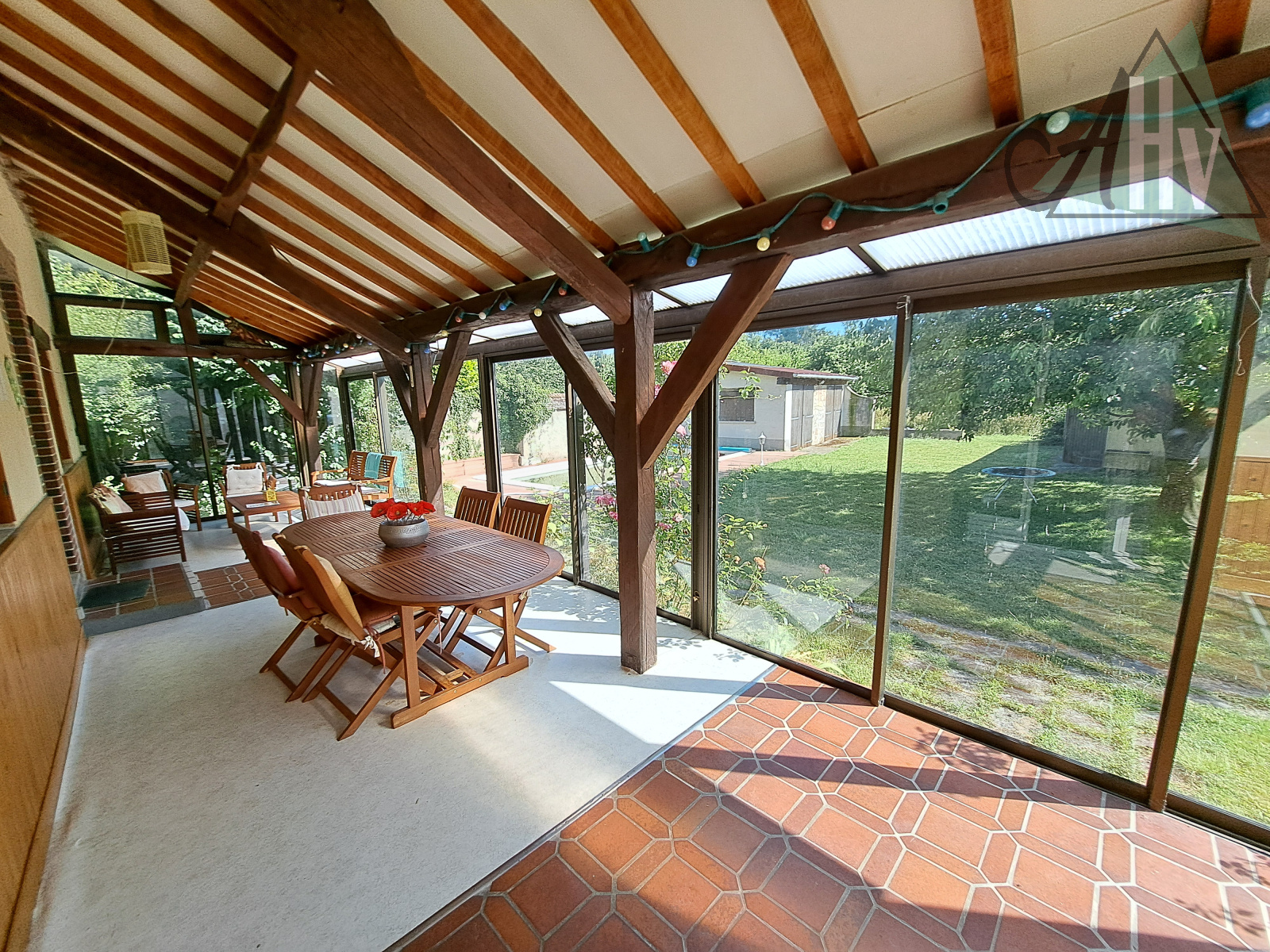 au RDC : belle véranda de 23 m² donnant sur le jardin et la piscine, salon de 30 m² avec cheminée insert, salle à manger de 19 m² avec poêle à bois, cuisine de 8 m², chambre de 14,4 m², salle d'eau avec wc, deuxième petite véranda, deuxième salle d'eau, wc séparés ;à l'étage : trois grandes chambres (18 - 17 et 16 m²), pièce traversante et wc.