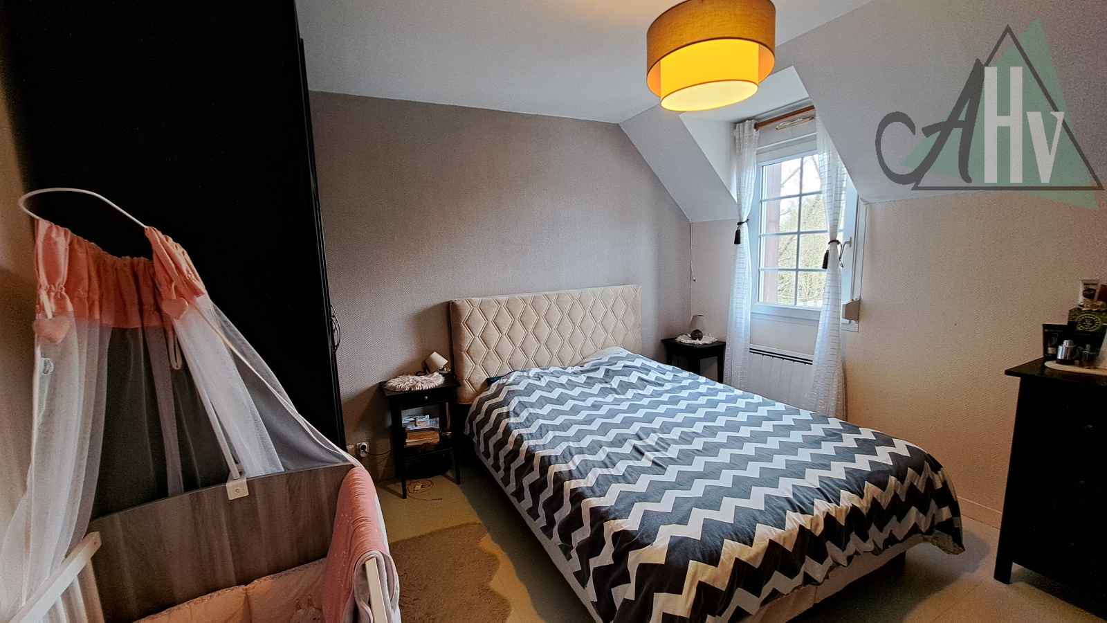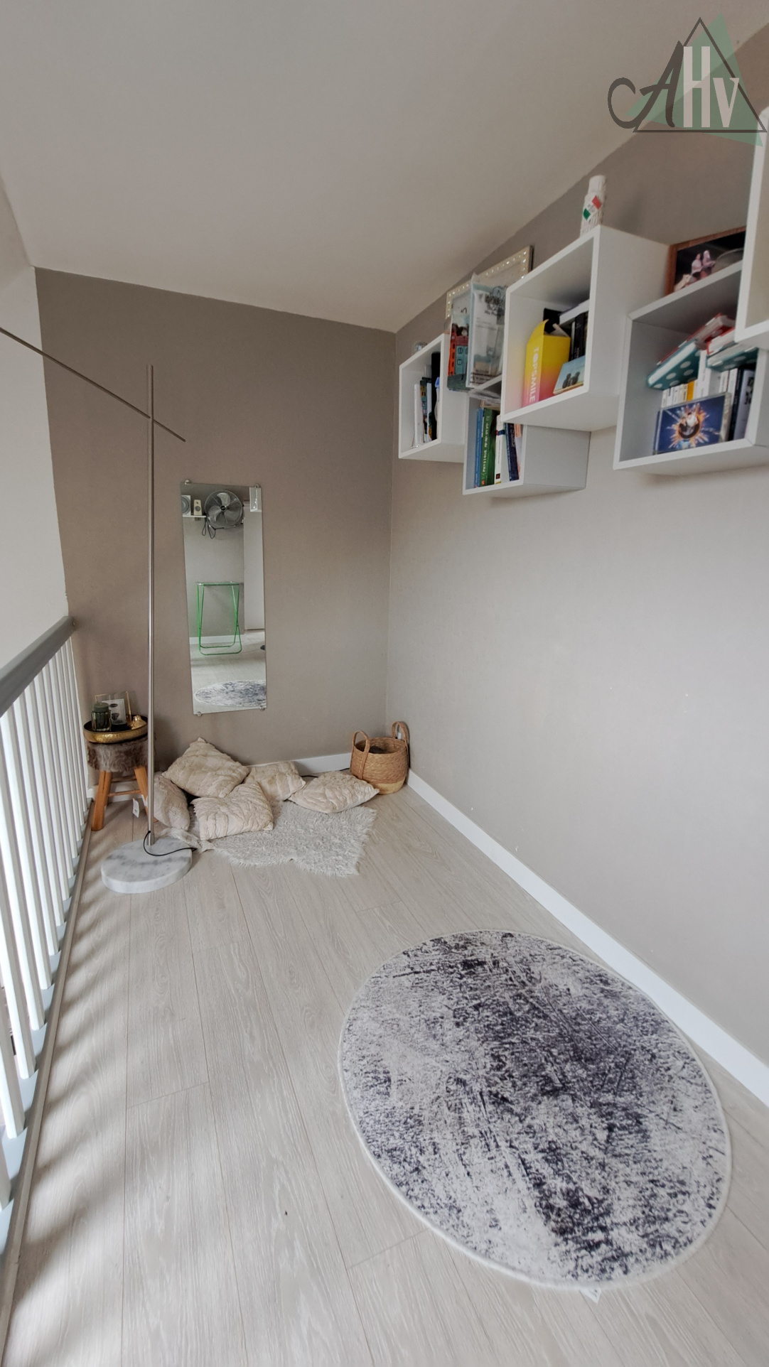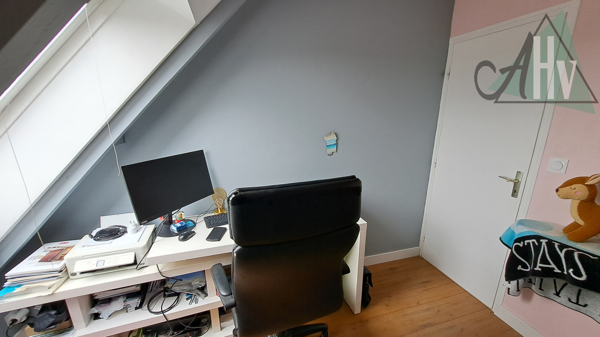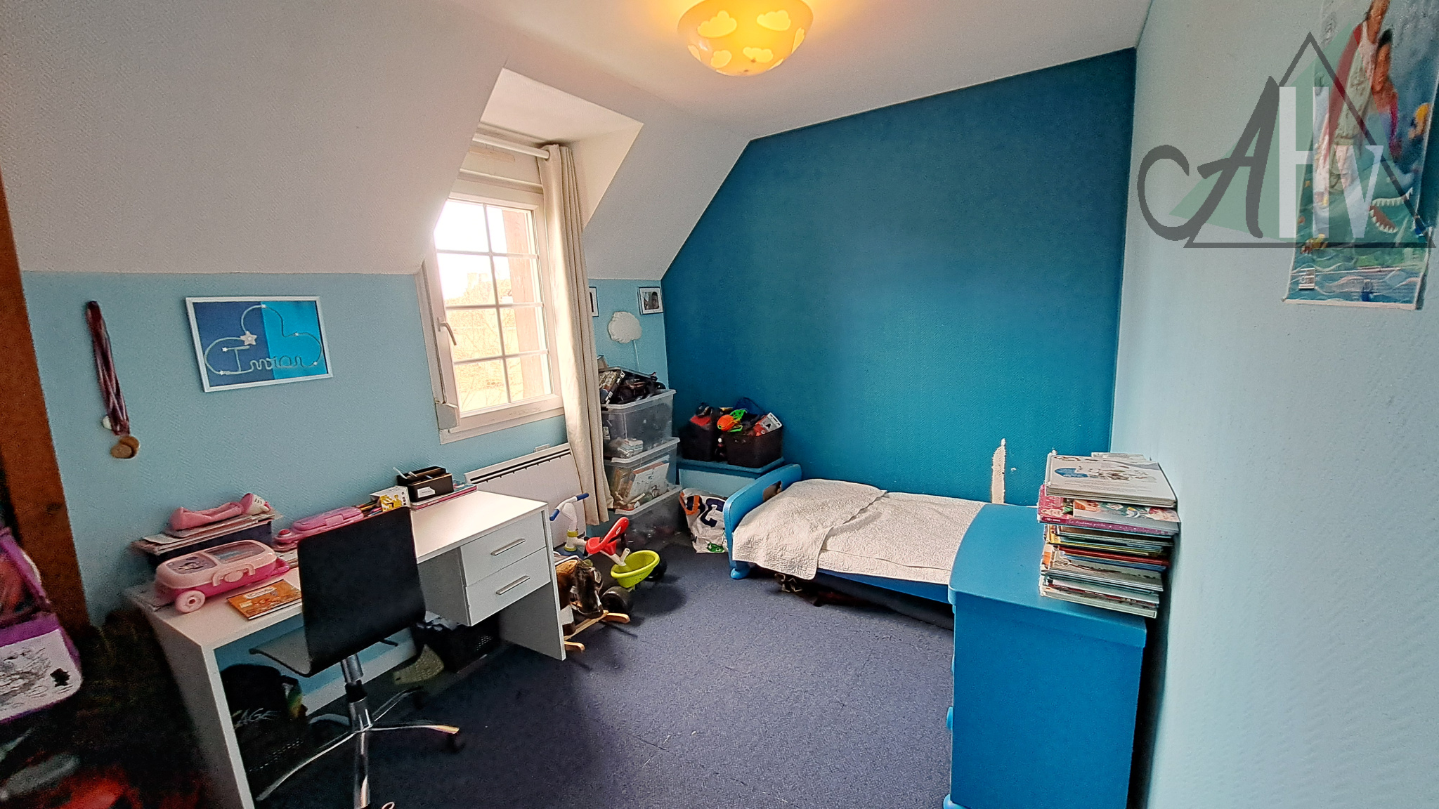 A l'étage : chambre de 7 m², bureau, palier (espace bibliothèque ou jeux), salle de bains, wc séparés.