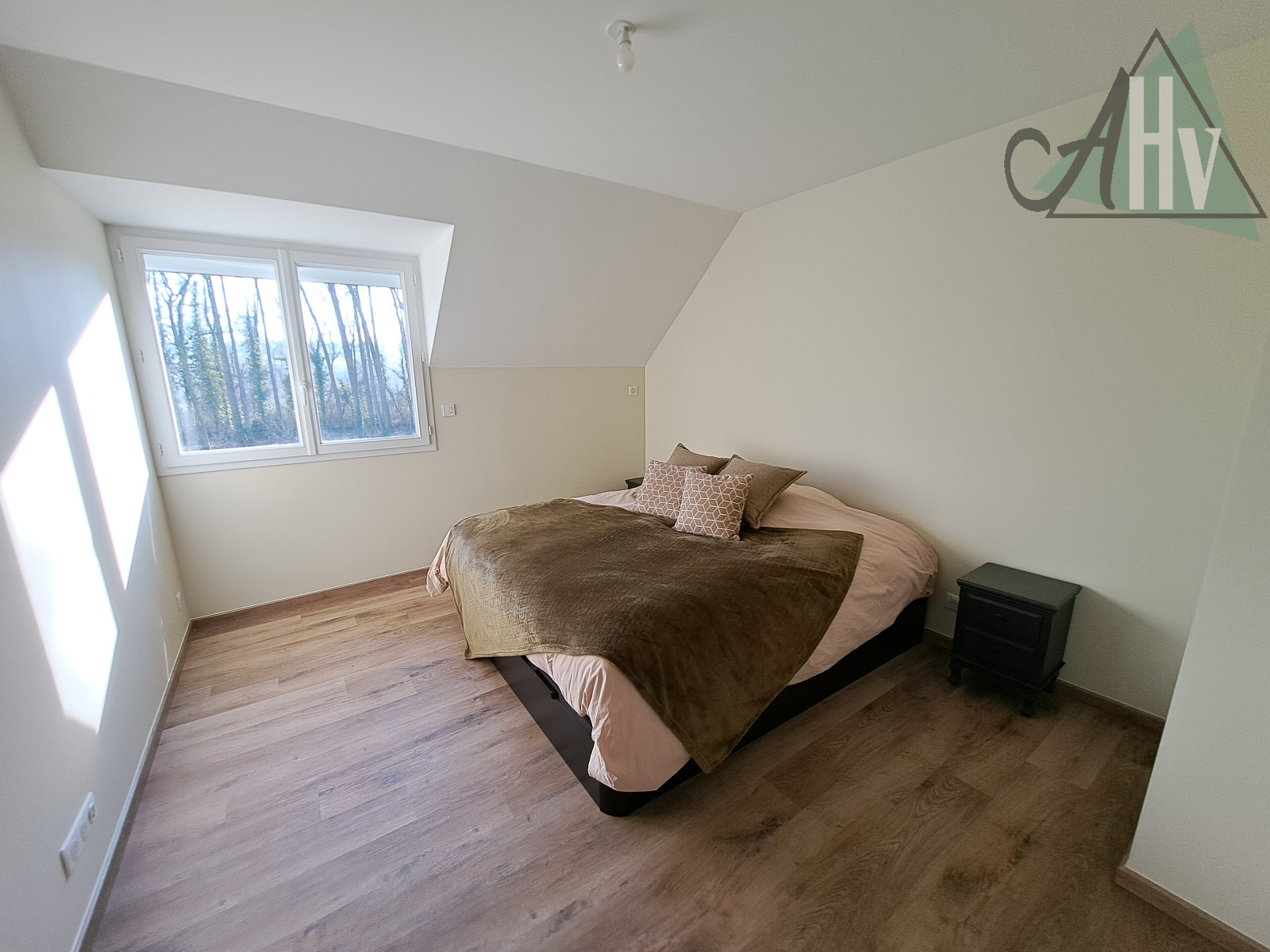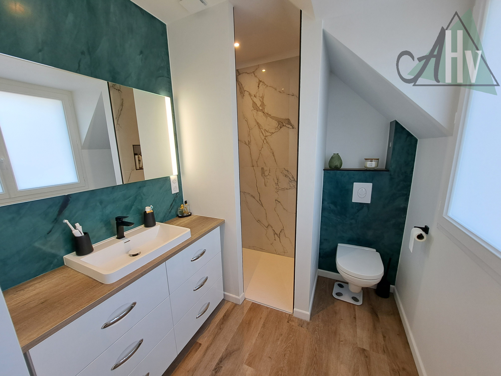 À l'étage : palier, trois chambres (13 - 13 - 12 m²), suite parentale à terminer d'aménager d'environ 30 m², salle d'eau avec wc suspendus.