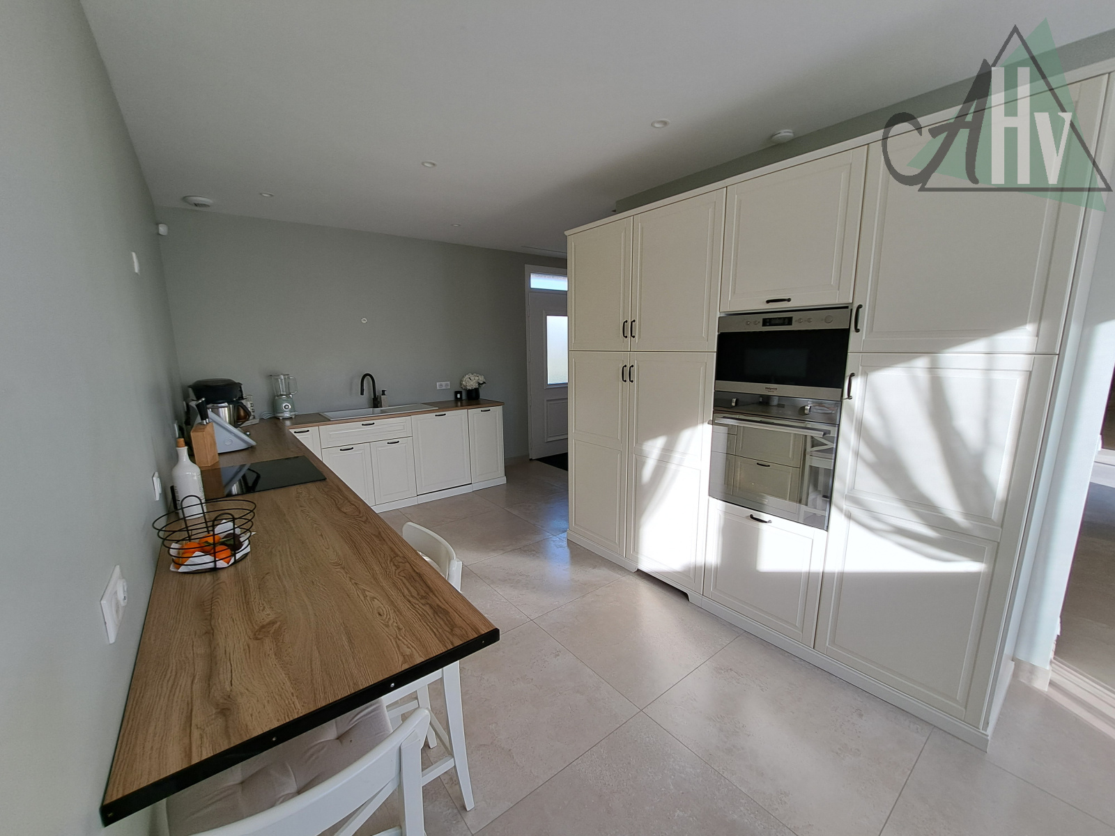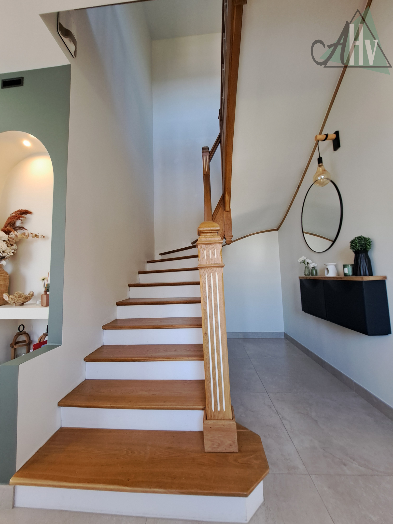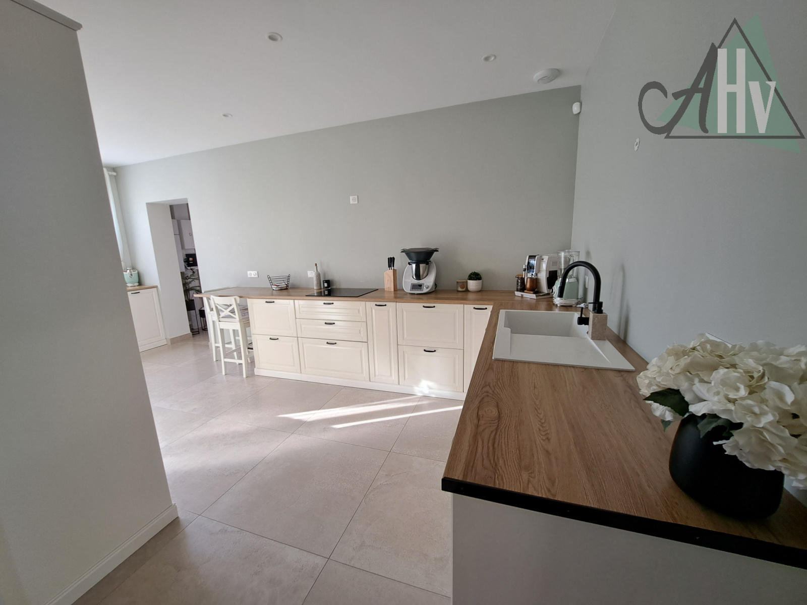 au RDC : entrée, cuisine aménagée équipée de 18 m², grand salon - séjour de 51 m² baigné de lumière grâce à ses baies vitrées à galandage et avec cheminée-insert, suite parentale avec chambre de 10 m² avec placards , salle d'eau et wc suspendus séparés avec lave-mains. Accès au garage (20 m²) avec porte automatique et à une remise.