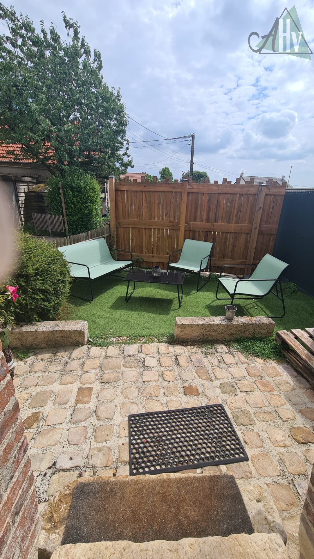 Une terrasse permet l'installation d'un salon de jardin et une place de parking.