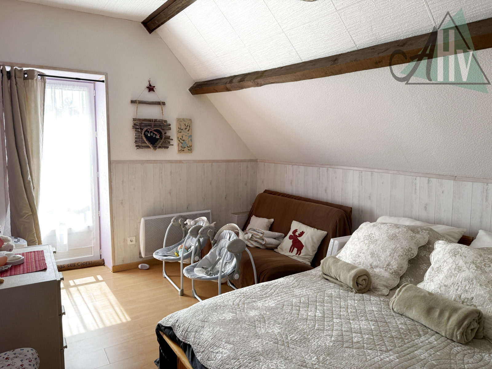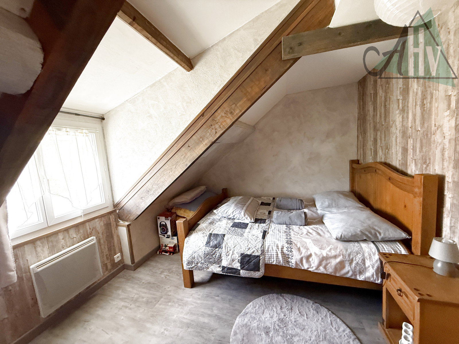 À l’étage : 3 chambres, un grand palier.