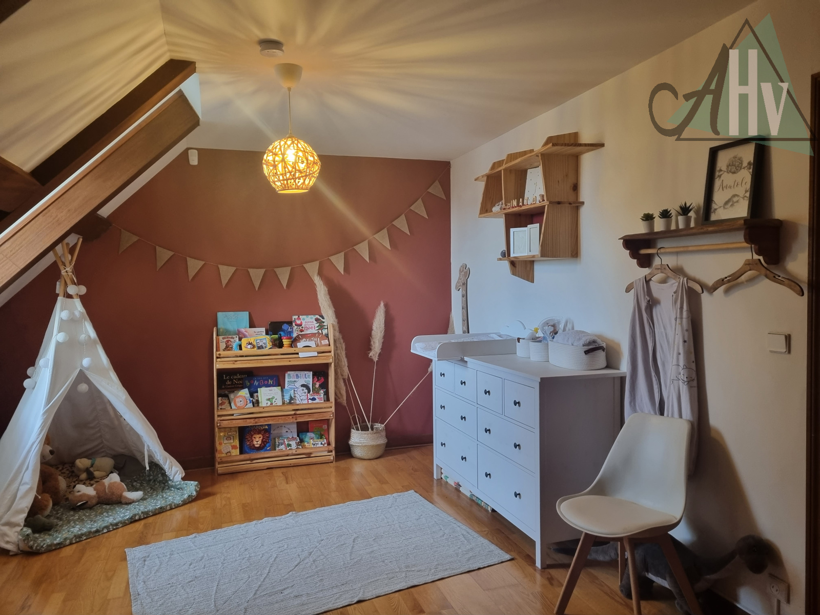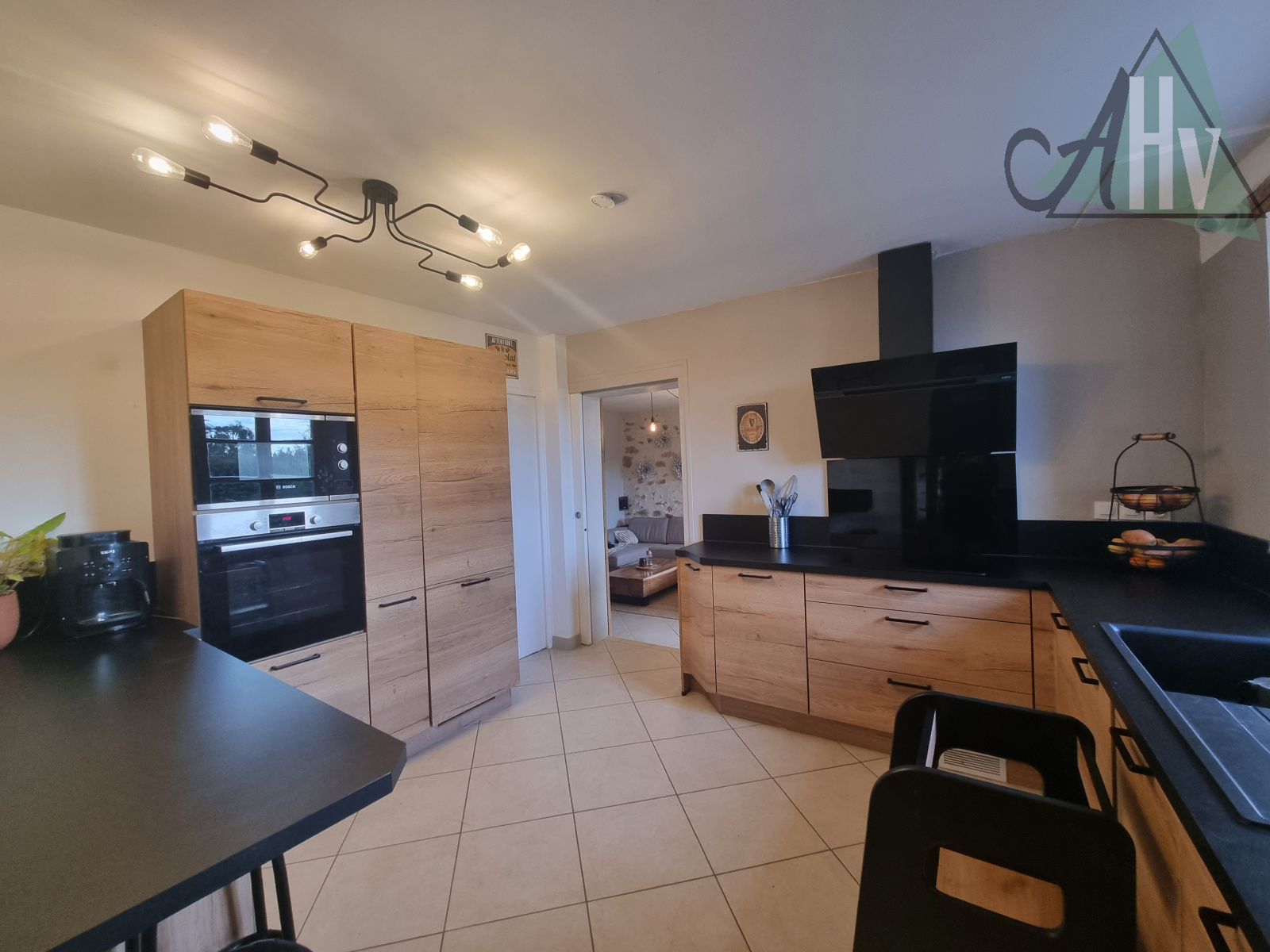 Au rez-de-chaussée : entrée spatieuse, chambre, salle de douche avec WC, salle à manger, cuisine aménagée et équipée, buanderie et séjour avec poêle à granules.