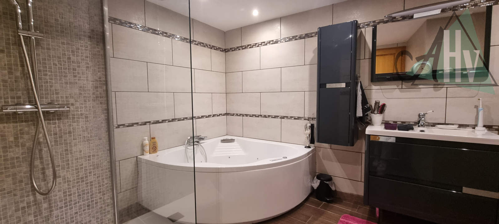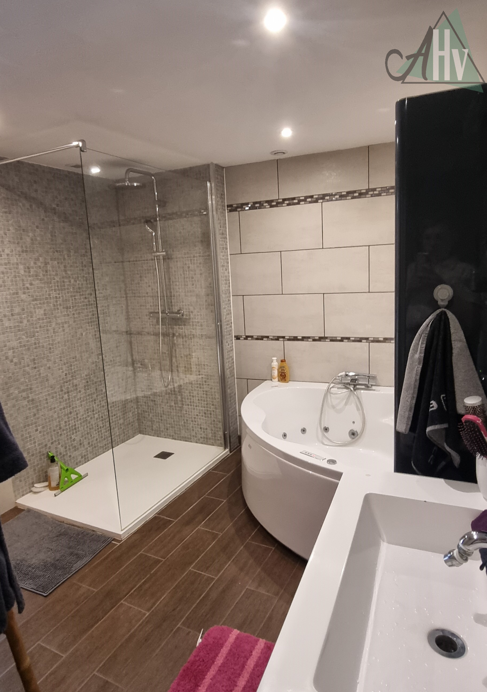 Elle se compose comme suit : entrée sur cuisine, pièce de vie avec poêle à granules, salle de bains avec douche, WC, buanderie, cellier.