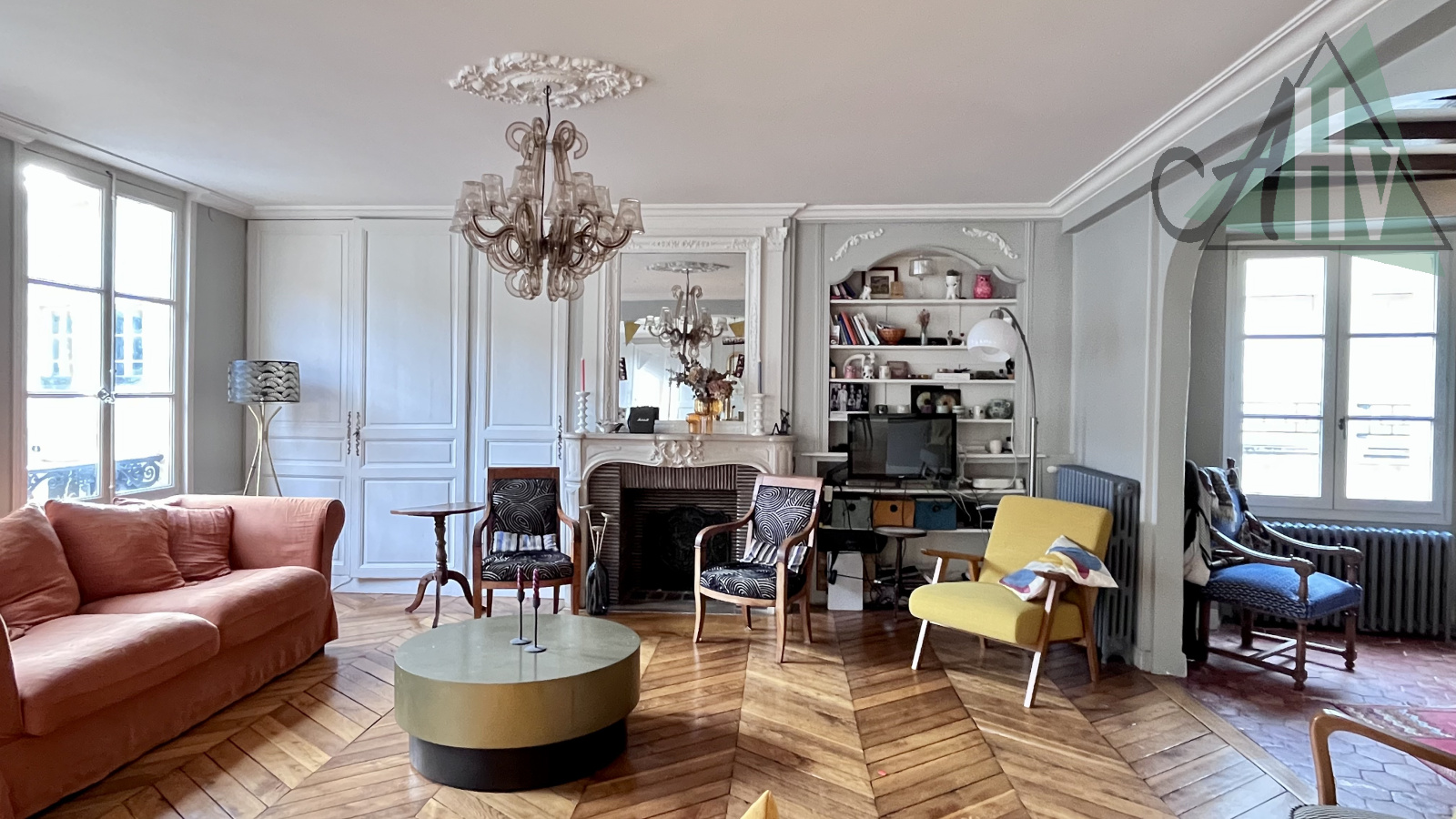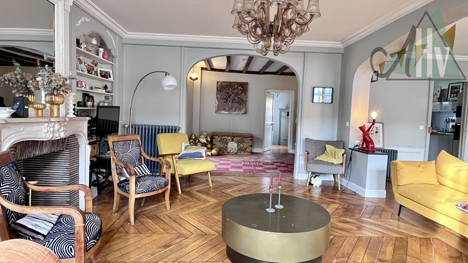 Au 1er étage : un WC sur palier, un bureau, un double salon-séjour avec parquet massif en chêne et deux belles cheminées en marbre, une cuisine aménagée et équipée (plaque, hotte, four, four micro-onde, réfrigérateur), deux chambres en enfilade et une salle de bain avec WC indépendant.