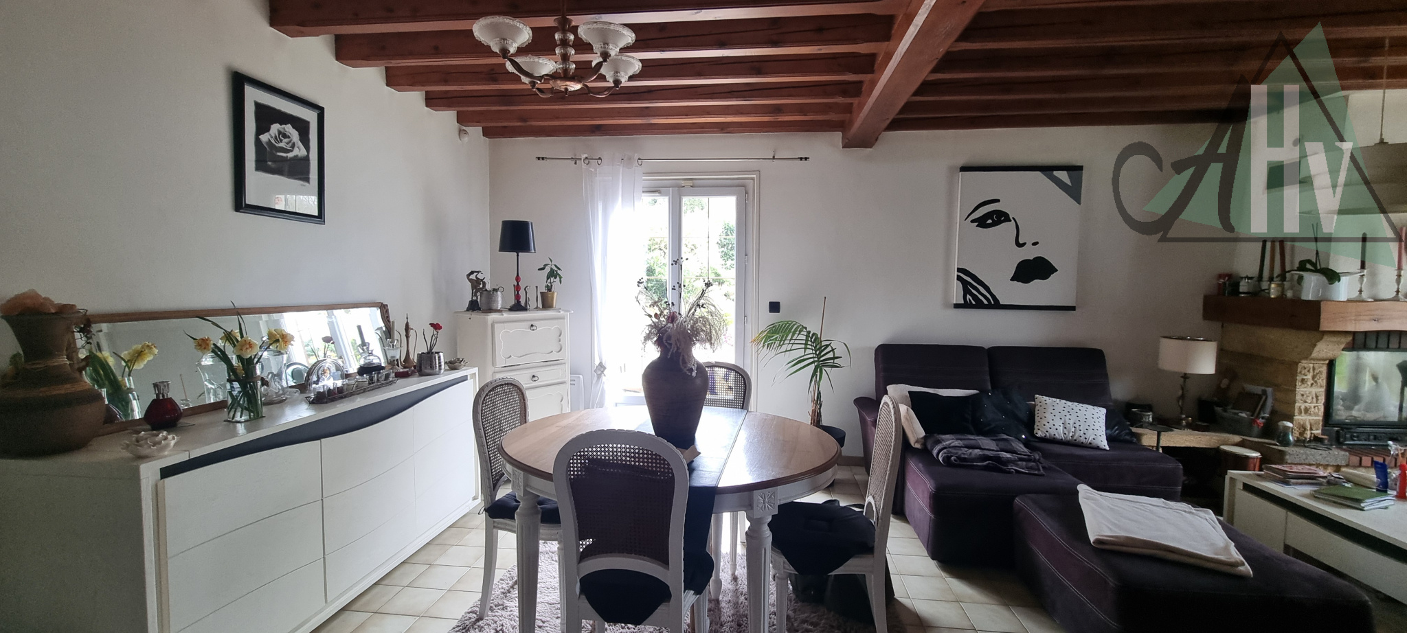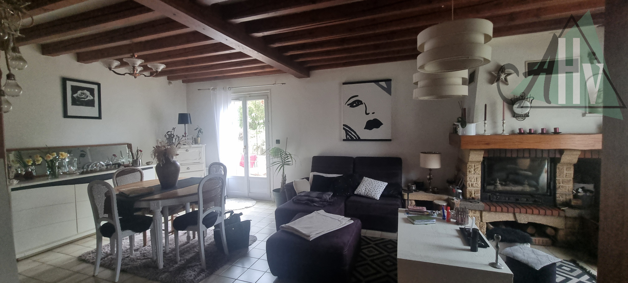 Elle se compose au rez-de-chaussée d'une entrée, un double séjour avec cheminée, une cuisine, une salle d'eau et un WC, un bureau.