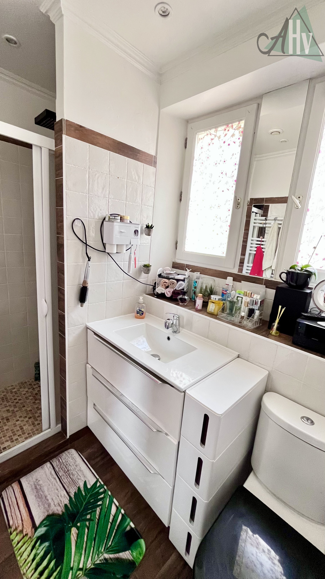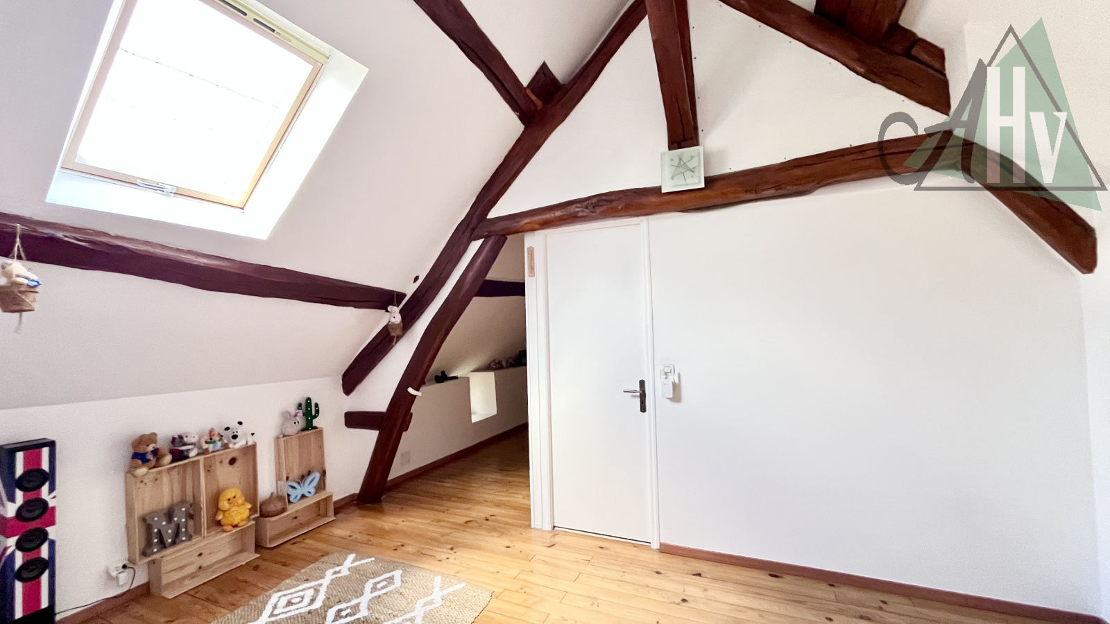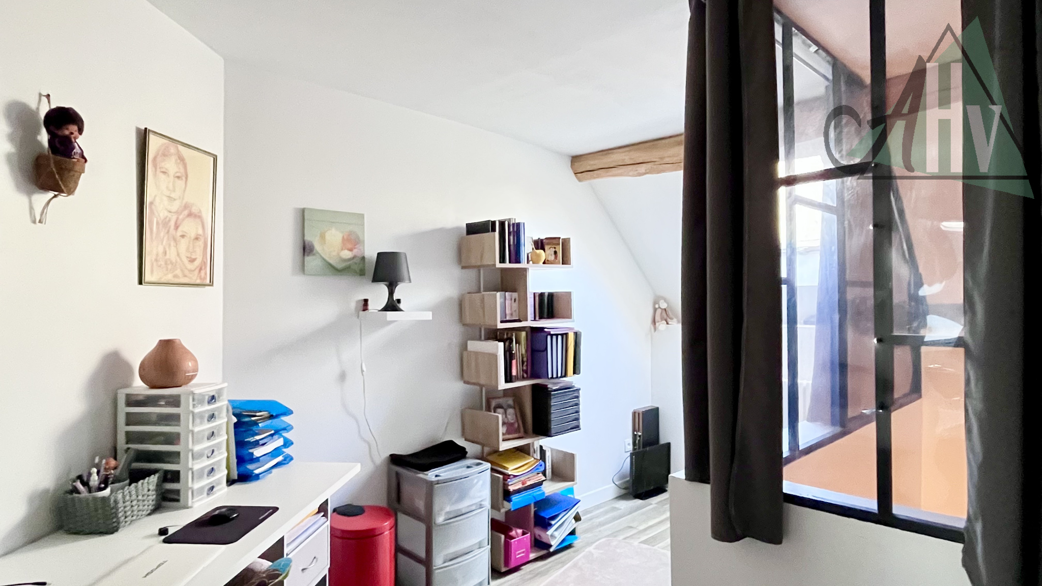 Le premier étage vous invite à découvrir un bureau, une grande pièce palière desservant deux chambres, ainsi qu’une salle d’eau avec WC.