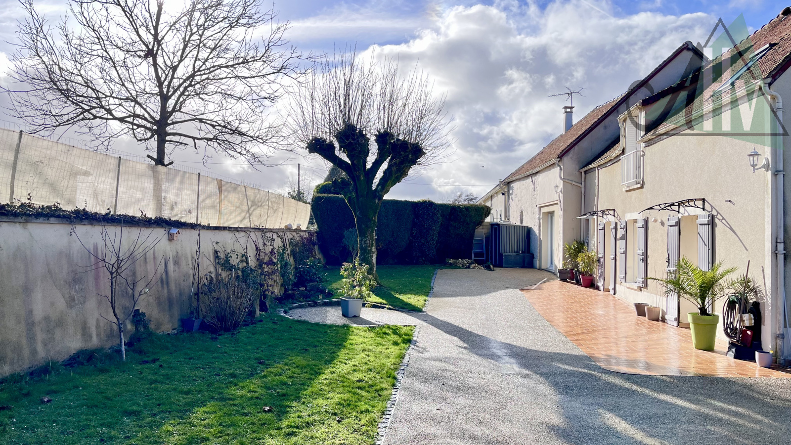 Côté extérieur : un jardin de 490 m2 environ avec des arbres fruitiers, une terrasse et un abri de jardin.