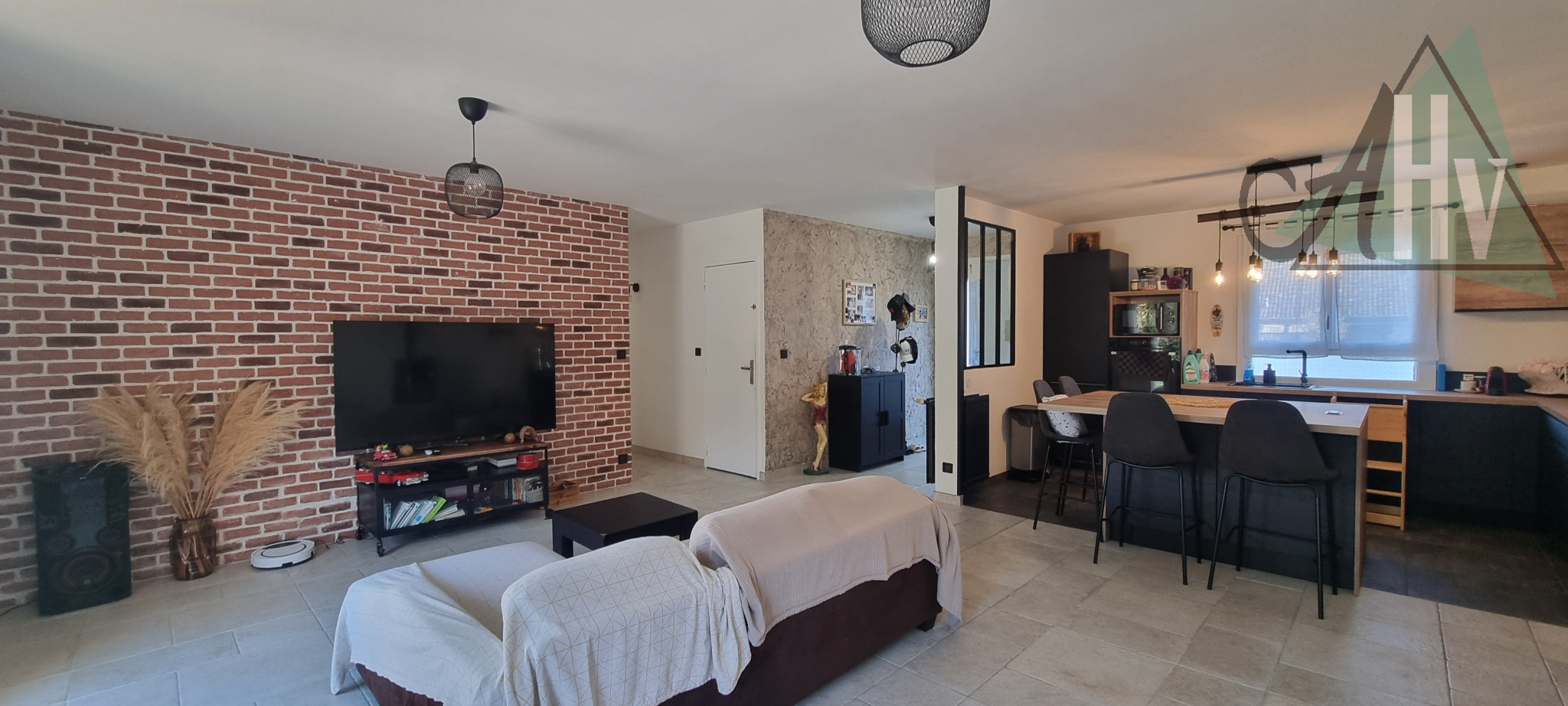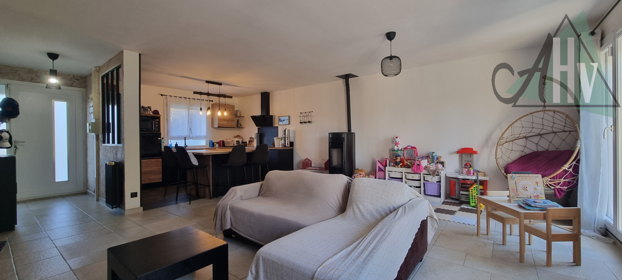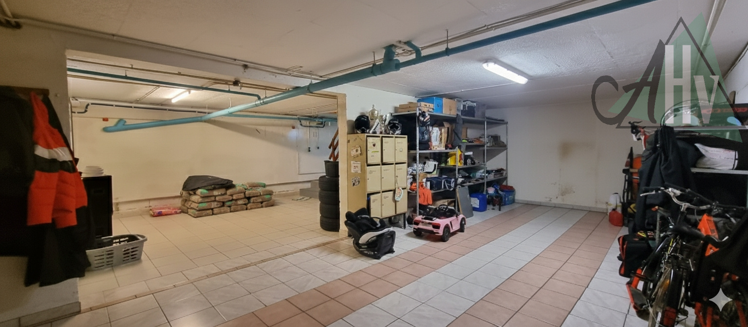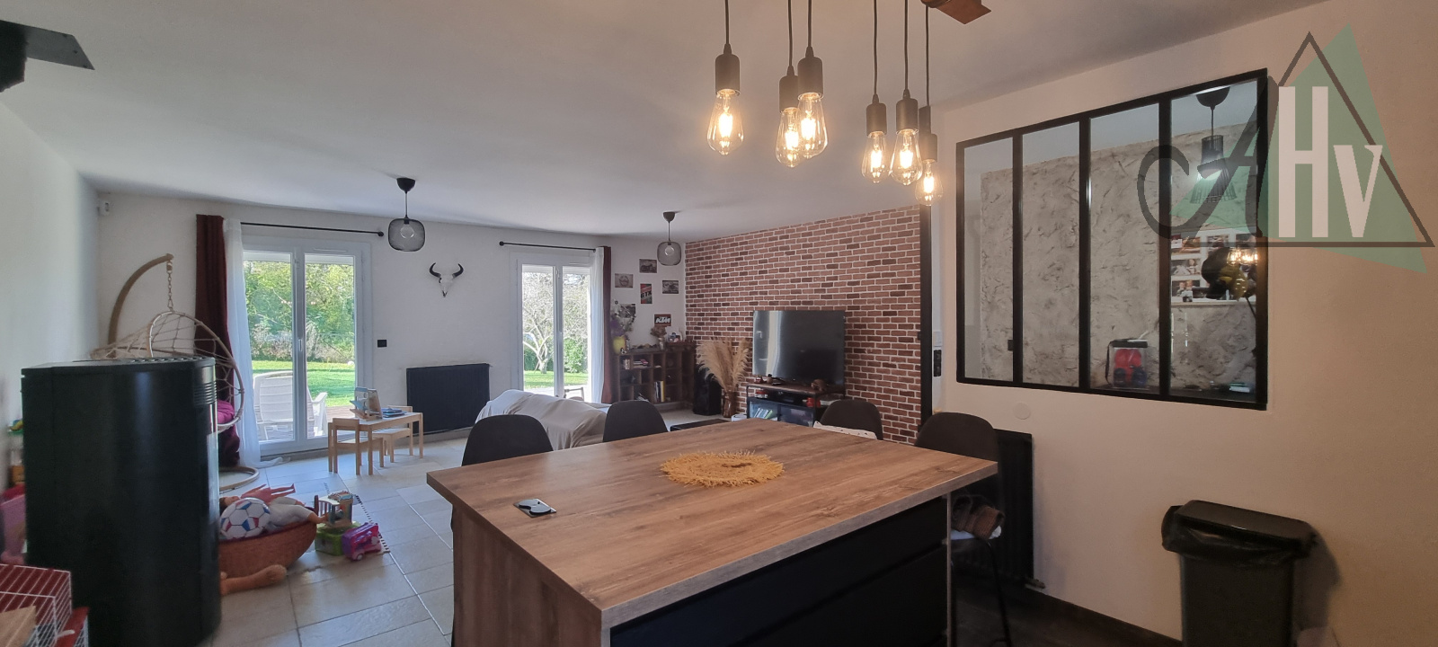 La partie de plain-pied se compose comme suit : salon-séjour lumineux ouvert sur la cuisine, offrant un espace convivial donnant directement sur la terrasse et le jardin à l’arrière, un couloir dessert un WC, une salle de bain, trois chambres et un dressing.