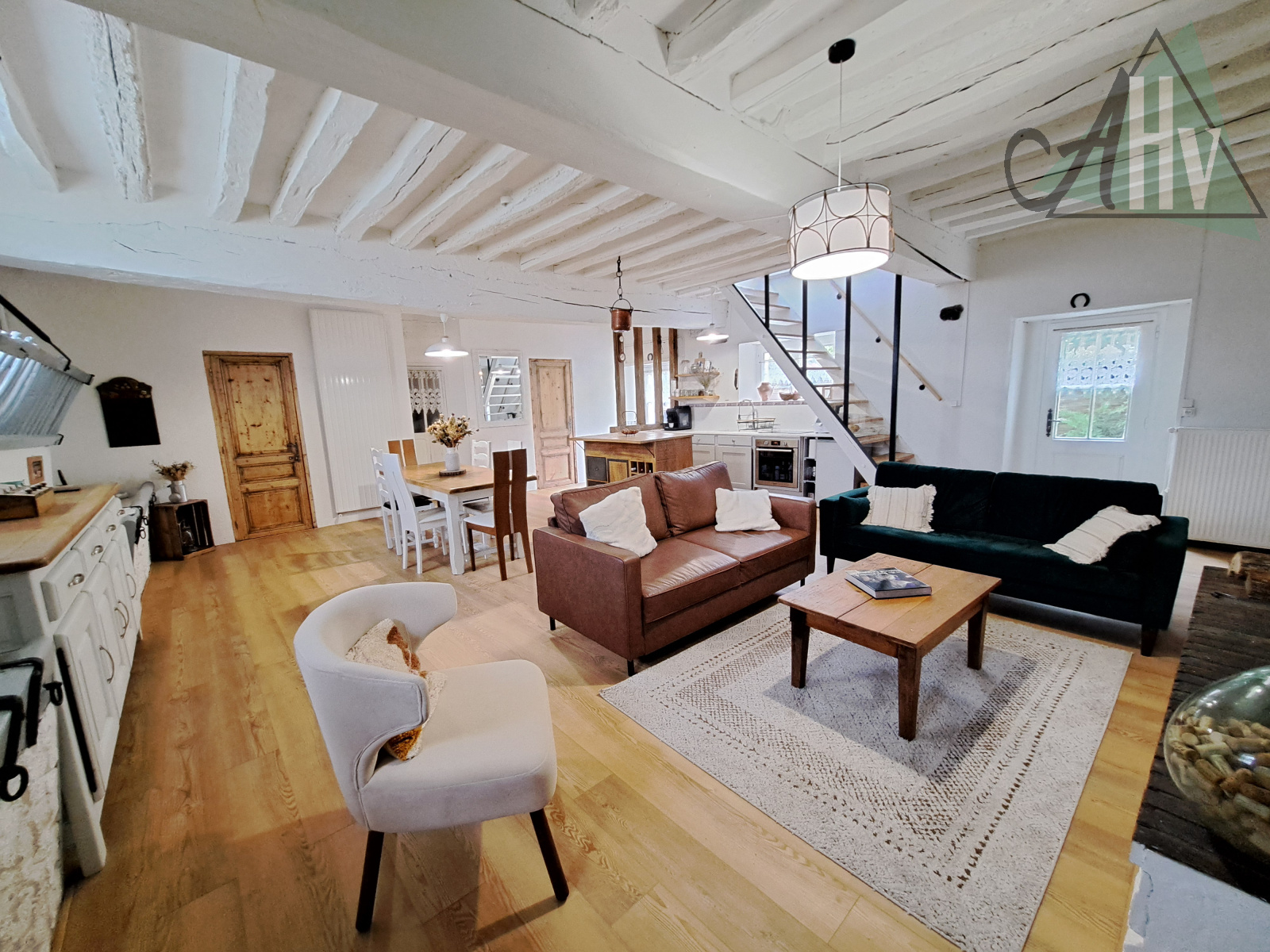 Au RDC : salon - séjour de 56 m² avec cheminée, cuisine aménagée équipée ouverte, quatre chambres (24 - 17 - 10 et 9 m²) avec de nombreux rangements, salle d’eau (douche à l’italienne) avec wc, salle de bain avec baignoire d’angle et wc, buanderie-chaufferie.