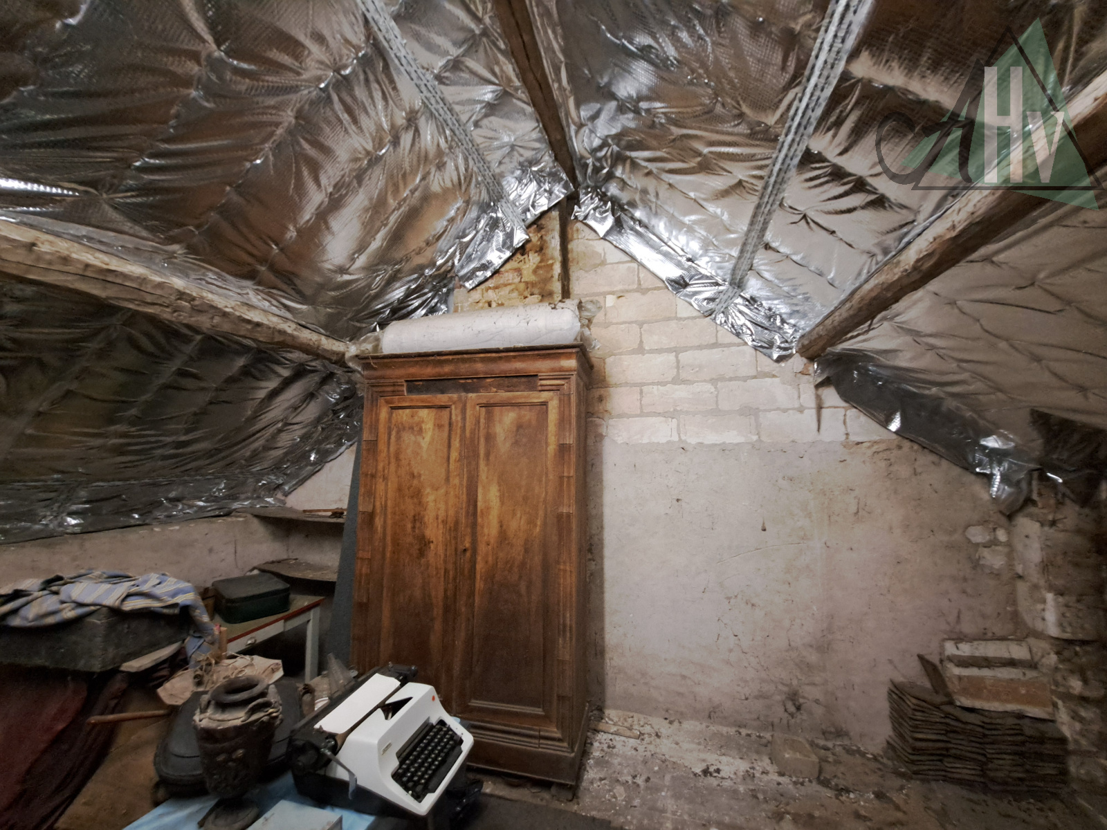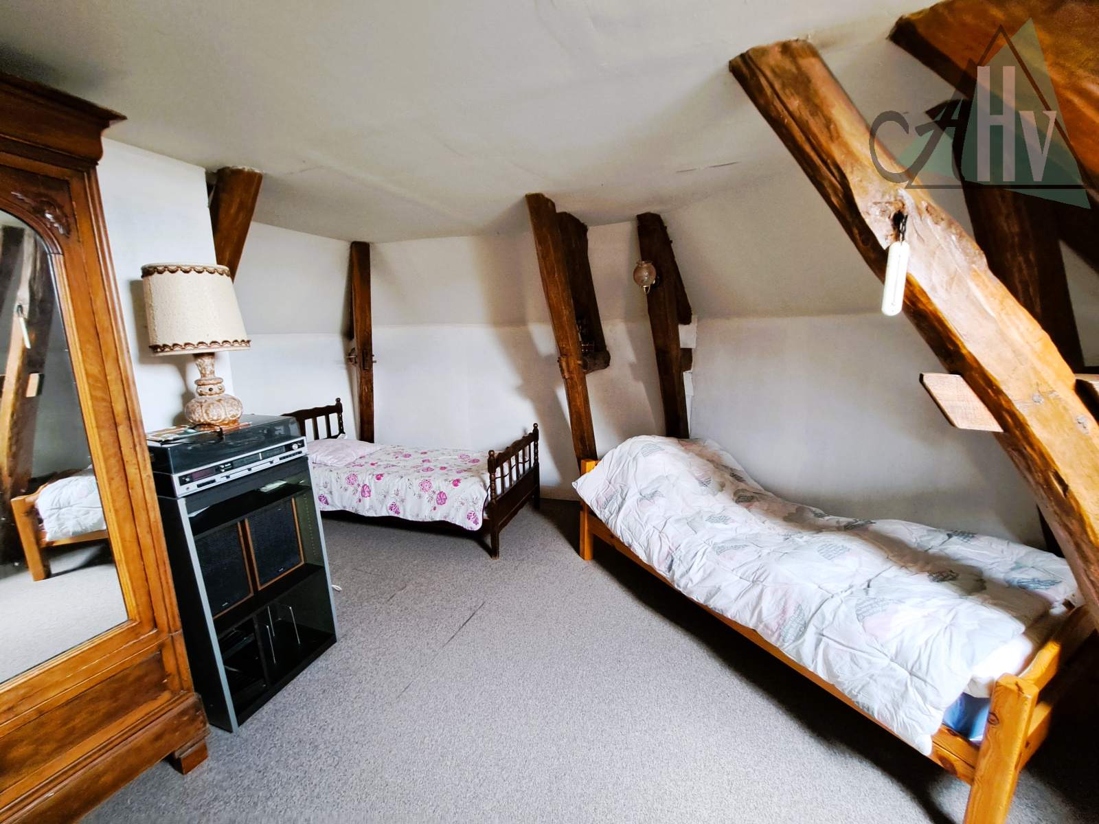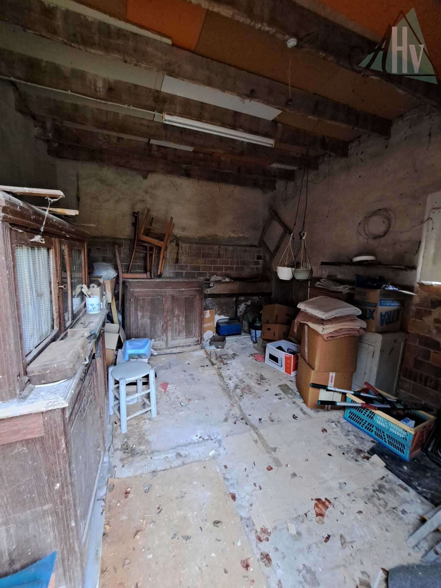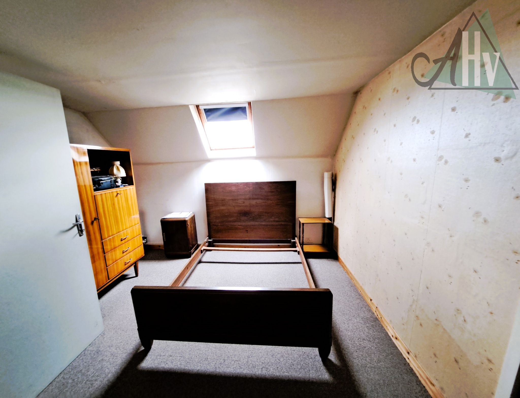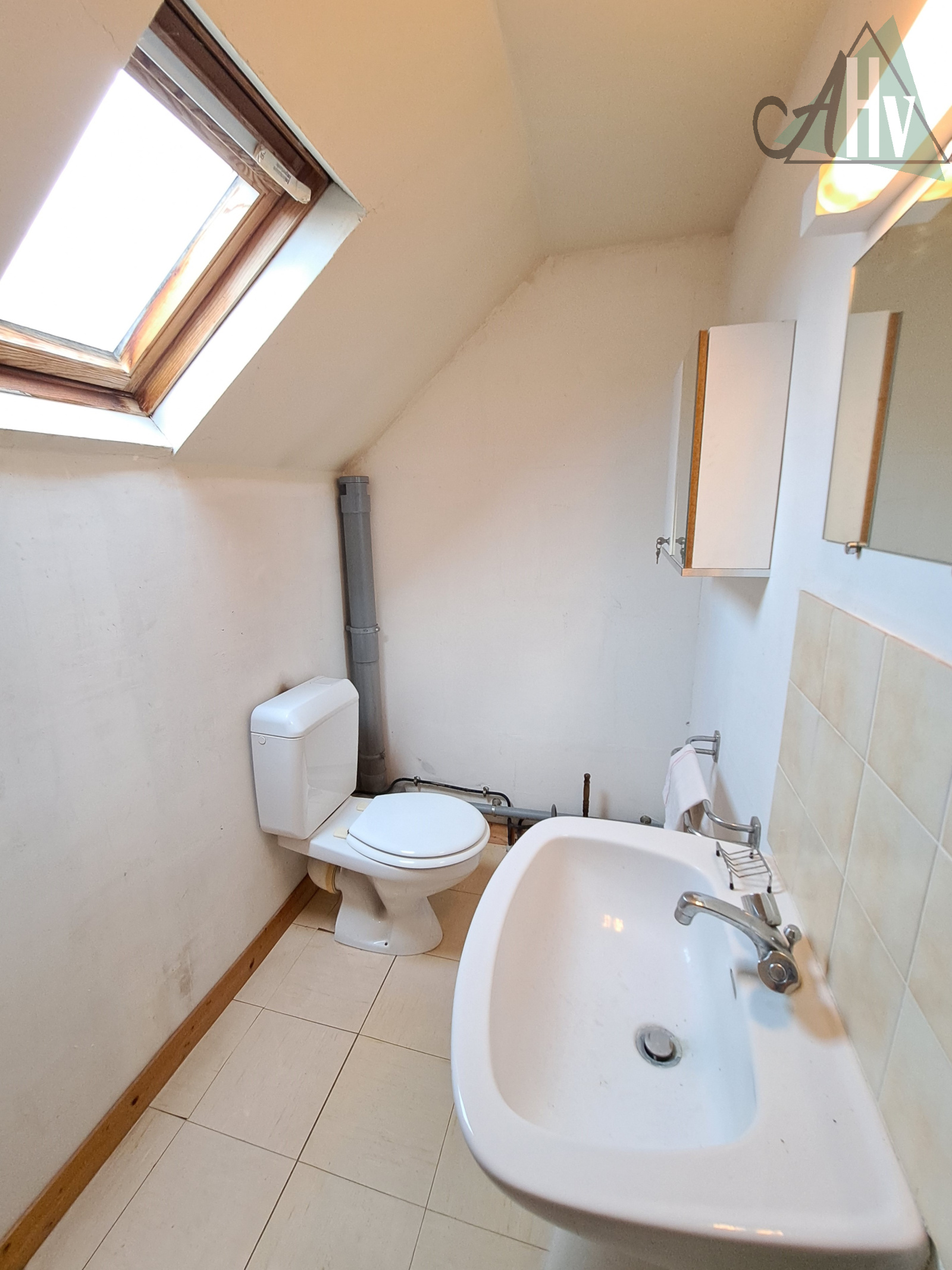 A l'étage : deux chambres (19 et 16,5 m²), dégagement, wc avec lave-mains, grenier (27 m2).