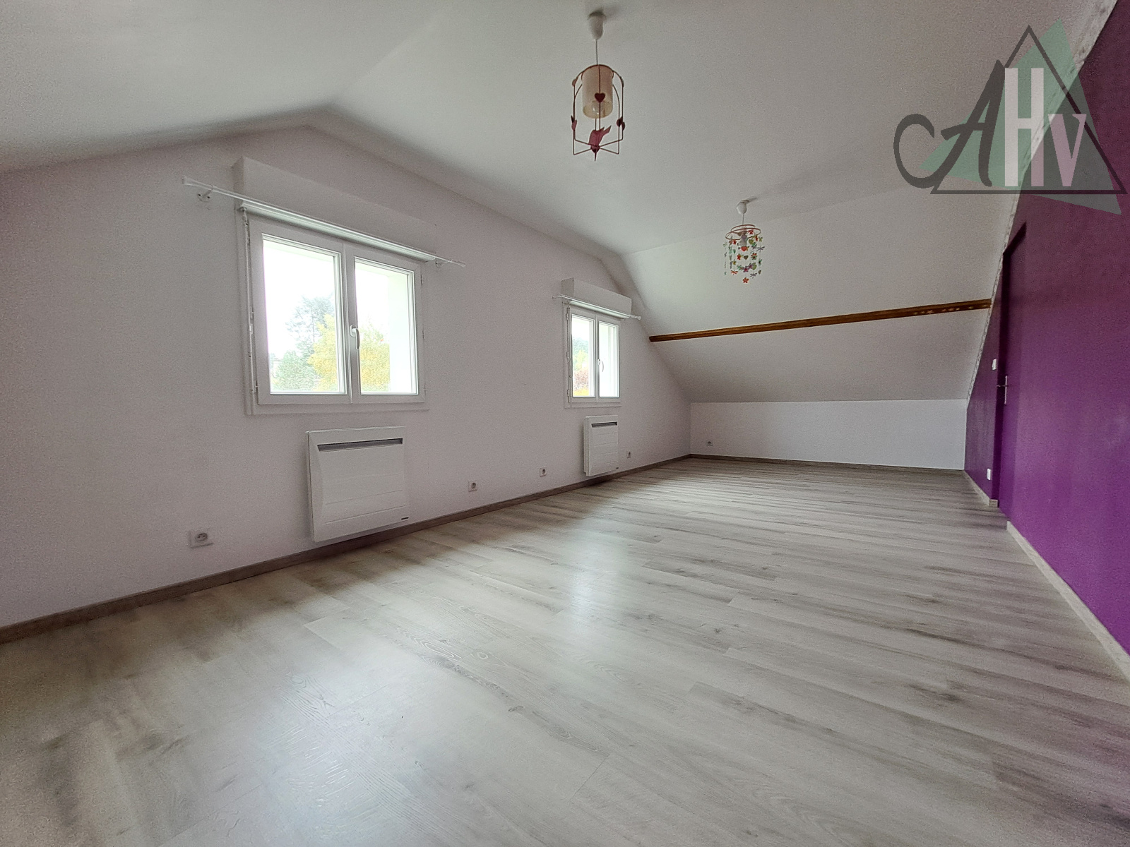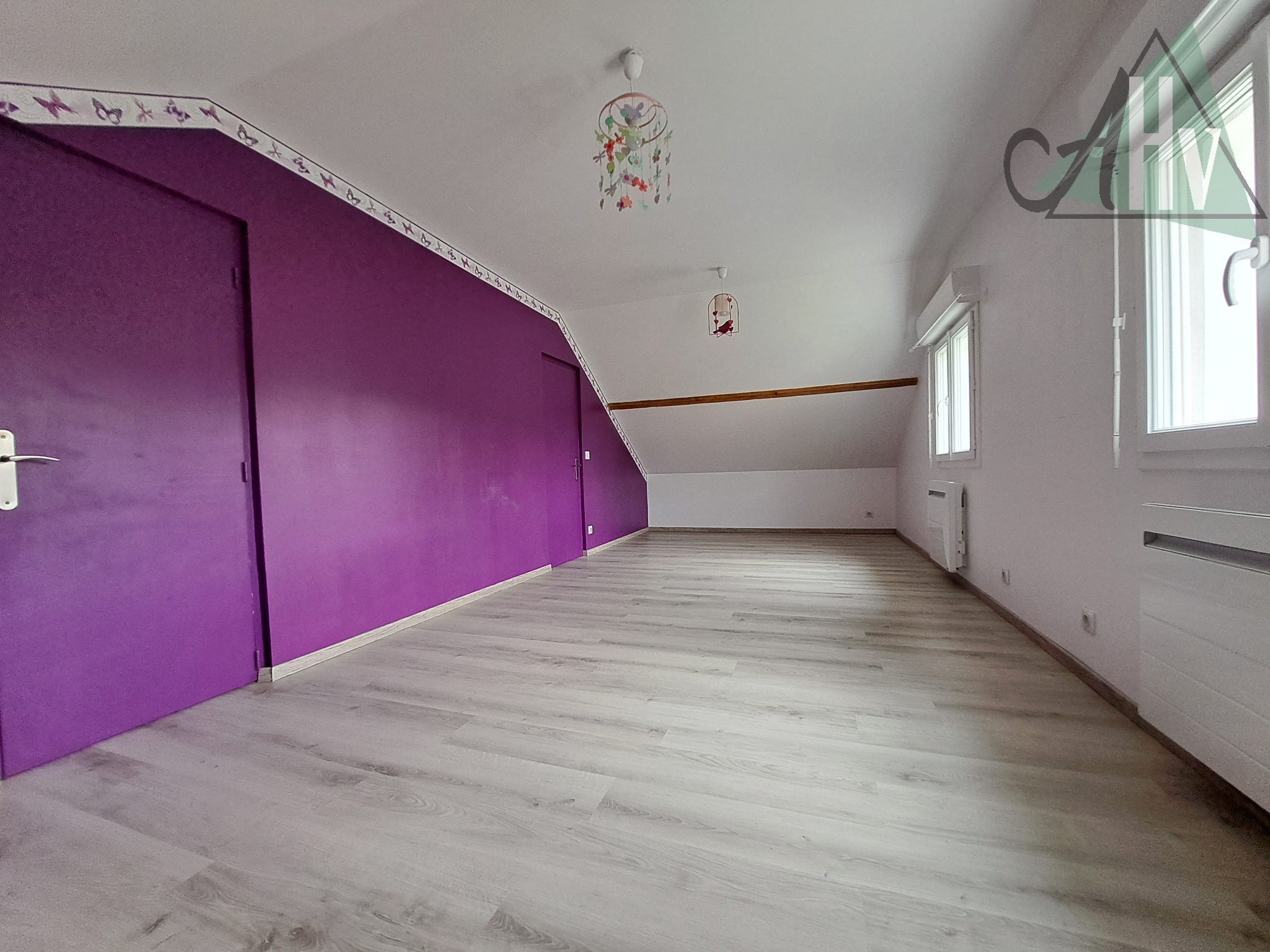 A l'étage : pièce palière de 14 m², grande chambre de 23 m² (possible de diviser en deux chambres pour créer une 4ème chambre), chambre de 27 m² avec penderie, wc avec lave-mains.
