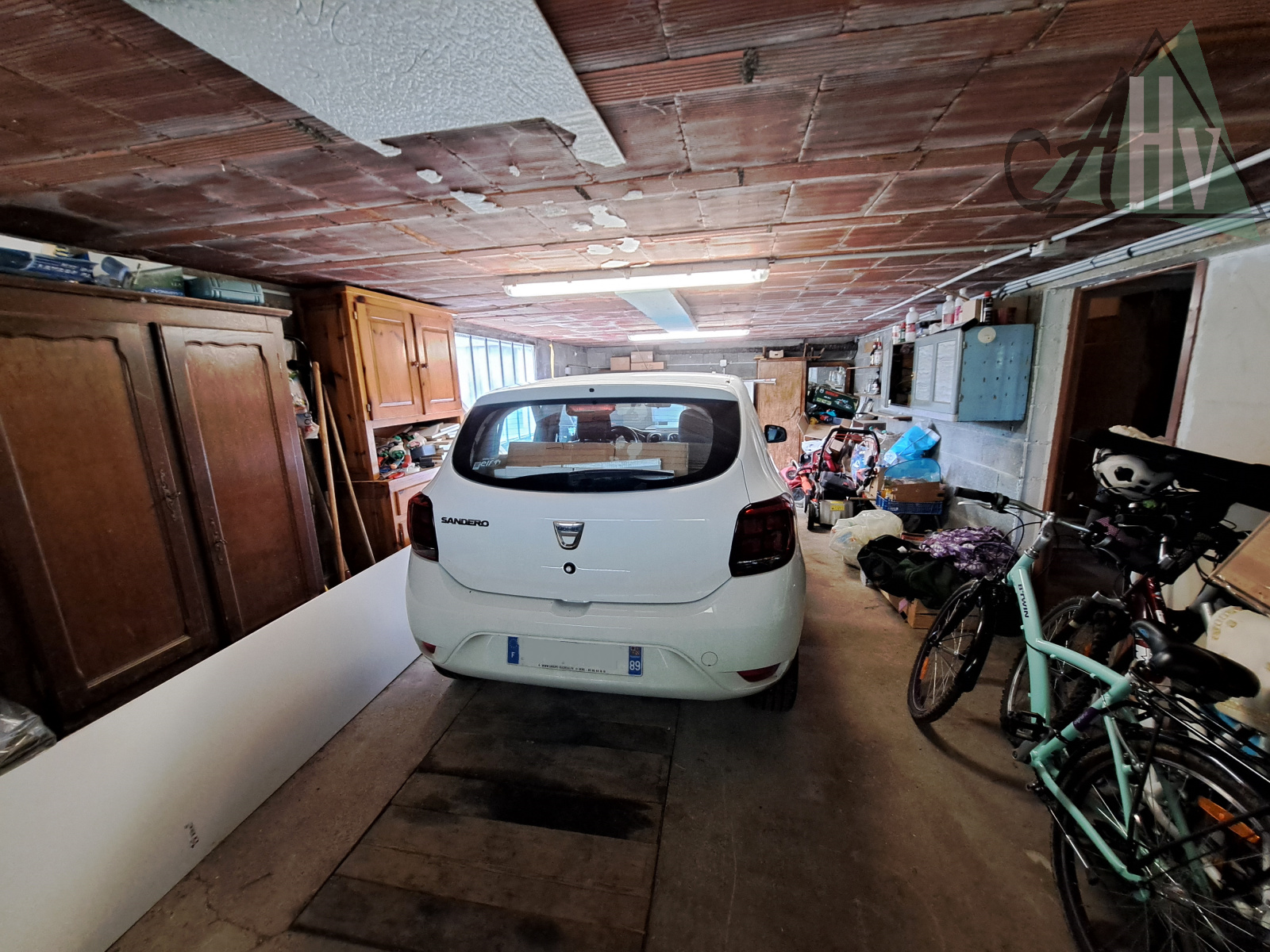Sous-sol total avec garage de 33 m² (avec fosse), buanderie, pièce de 27 m² avec lavabo et accès au jardin.