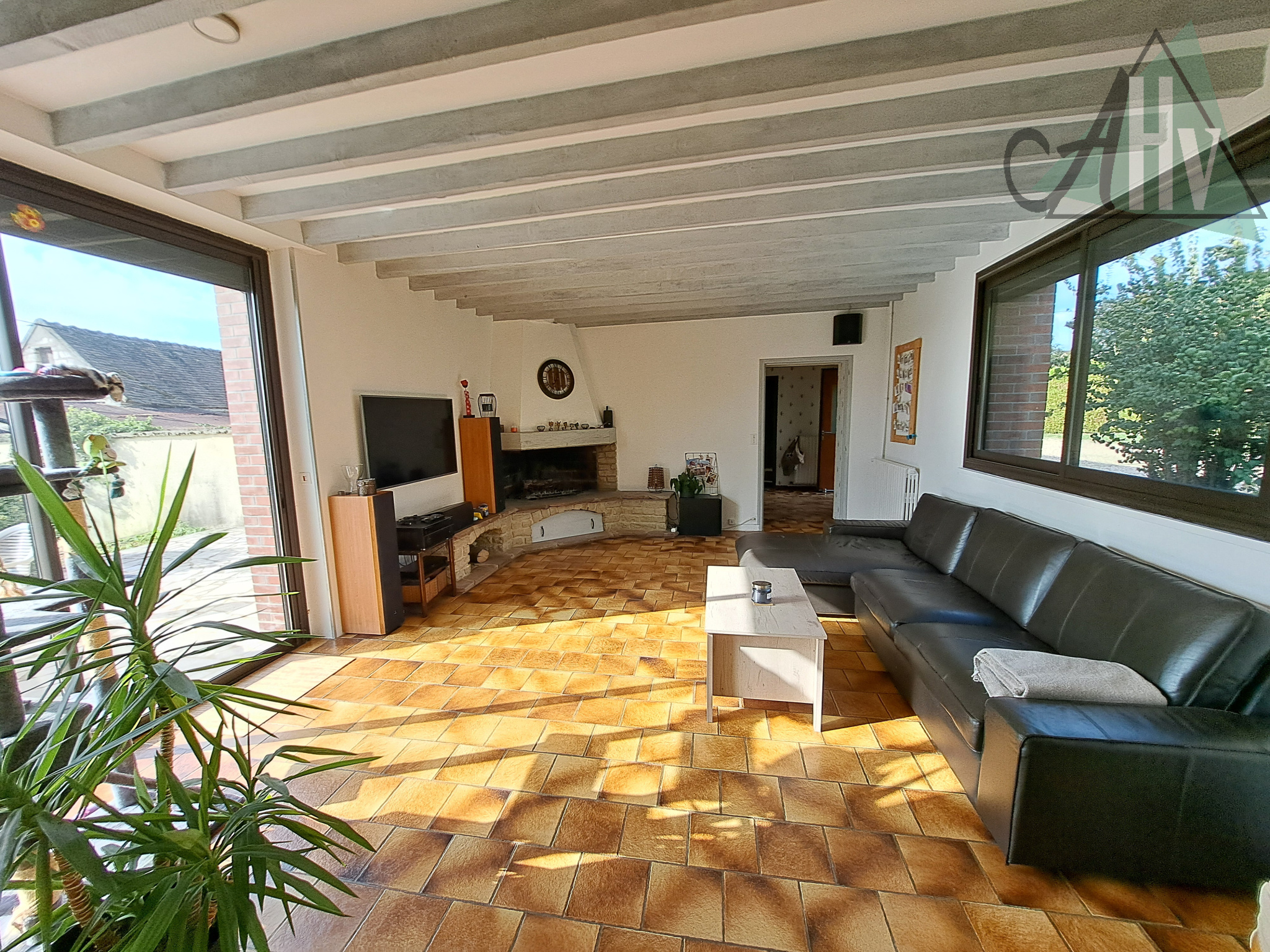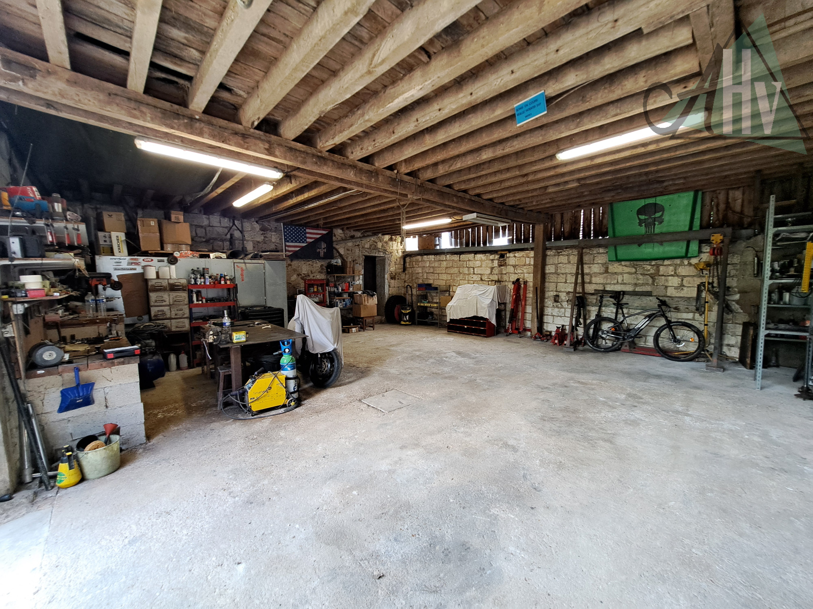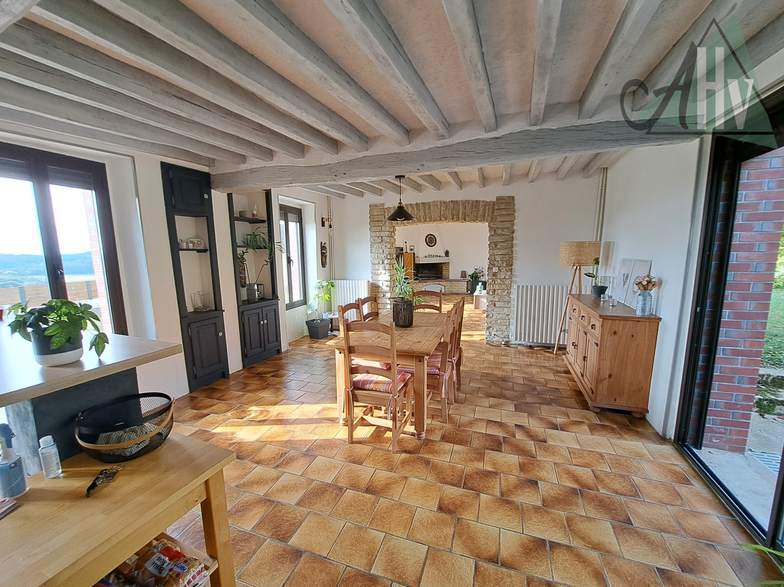 entrée, cuisine aménagée équipée de 14 m² ouverte sur un vaste salon - salle à manger de 62 m² avec cheminée ouverte et baies vitrées, salle d'eau (à rafraichir), trois grandes chambres (18 - 12,9 et 12,6 m²), couloir (à rénover), wc séparés, chaufferie, dégagement avec placards et accès à l'atelier de 87 m². Grange attenante de 250 m² avec étage. Cave voutée.