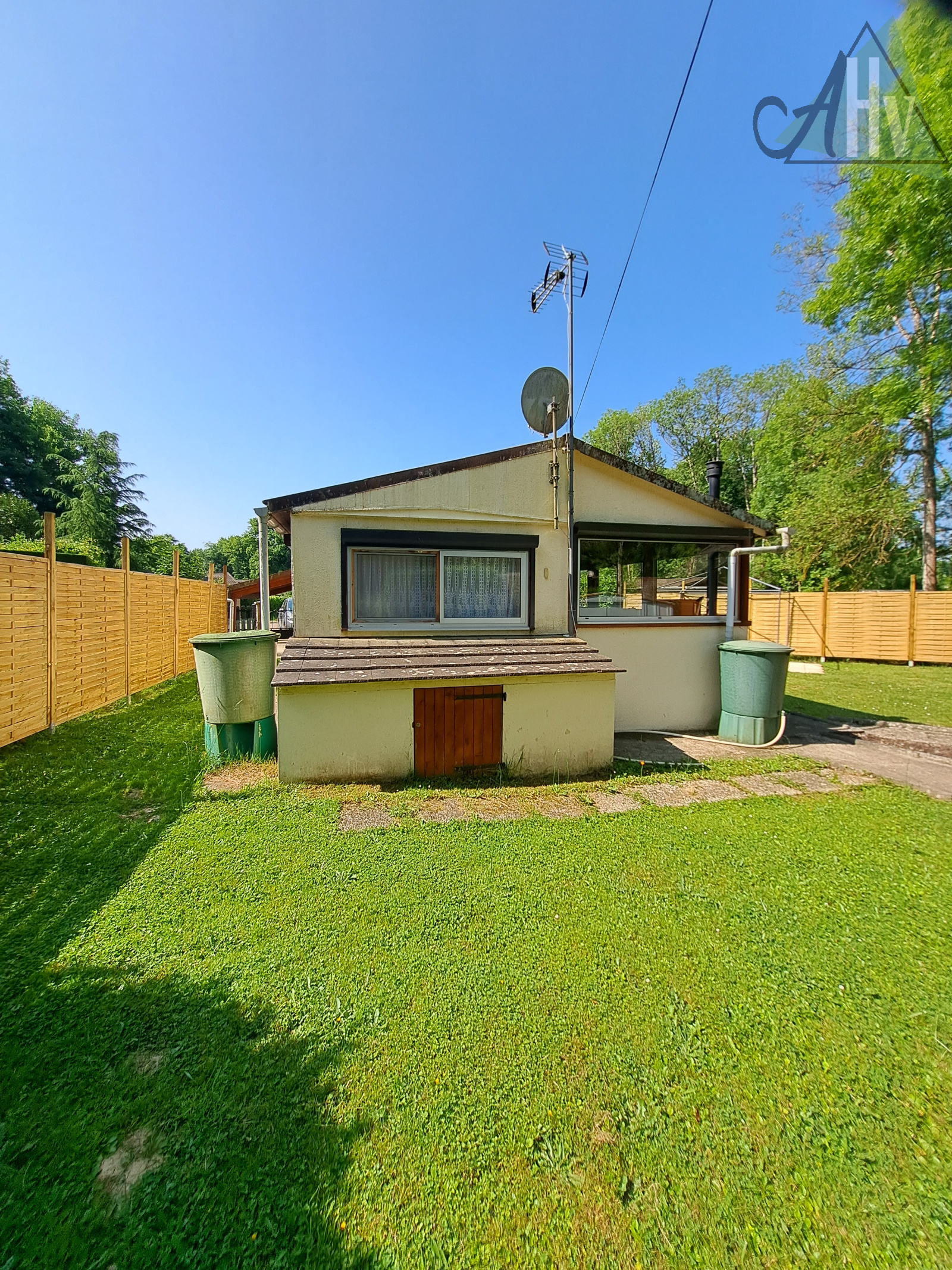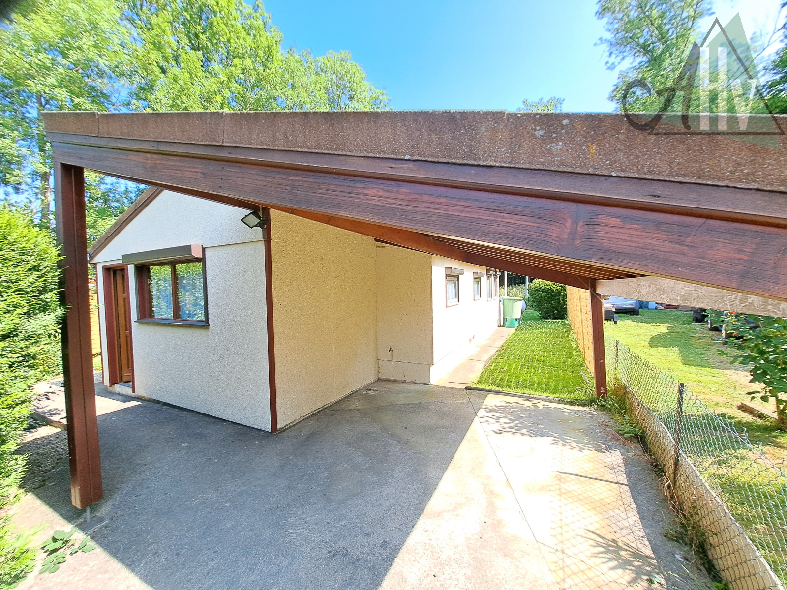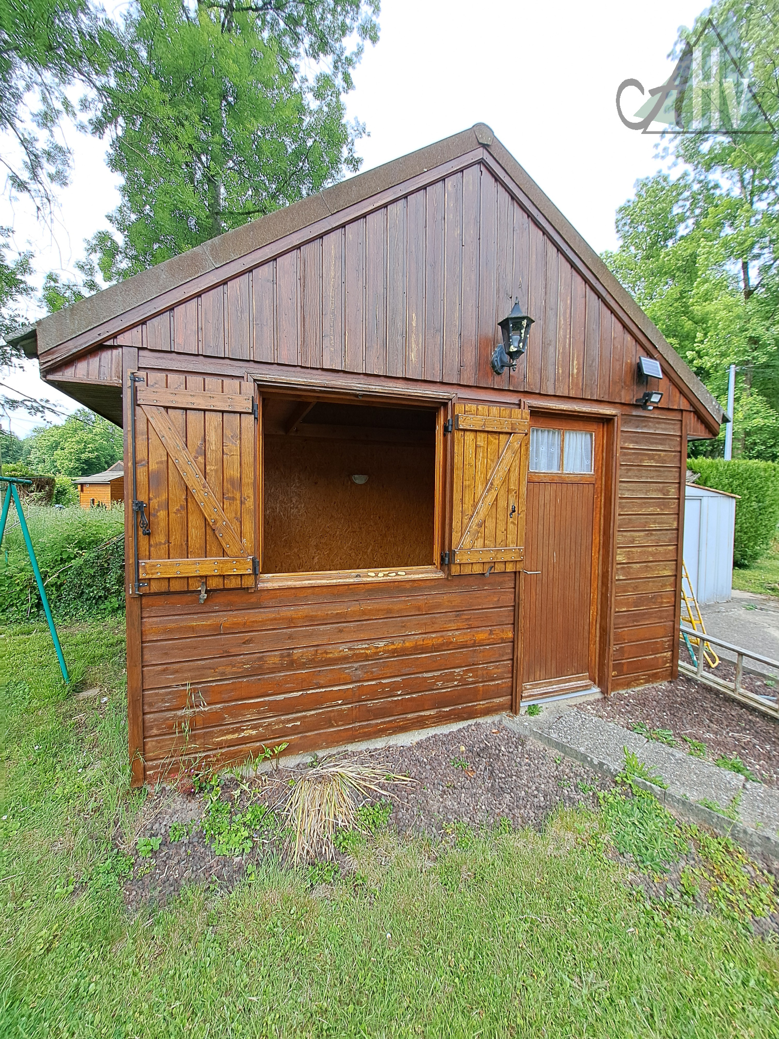 Terrain plat de 386 ㎡, entièrement clos, avec un chalet bois sur dalle de 11 ㎡ (possible chambre supplémentaire, avec chauffage), un cabanon de jardin, un carport et une terrasse.