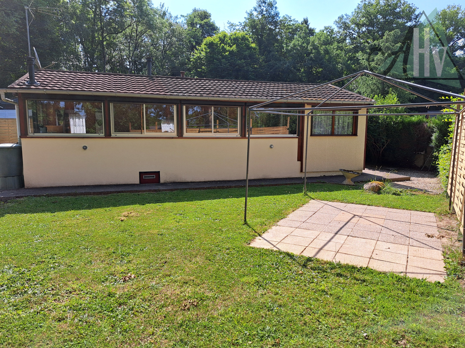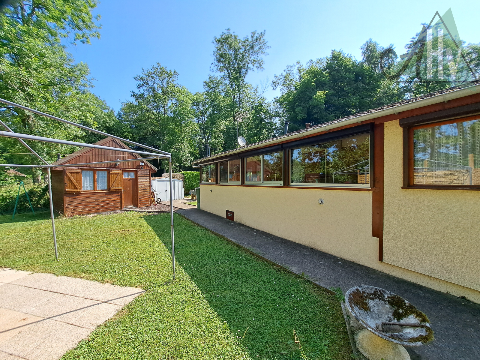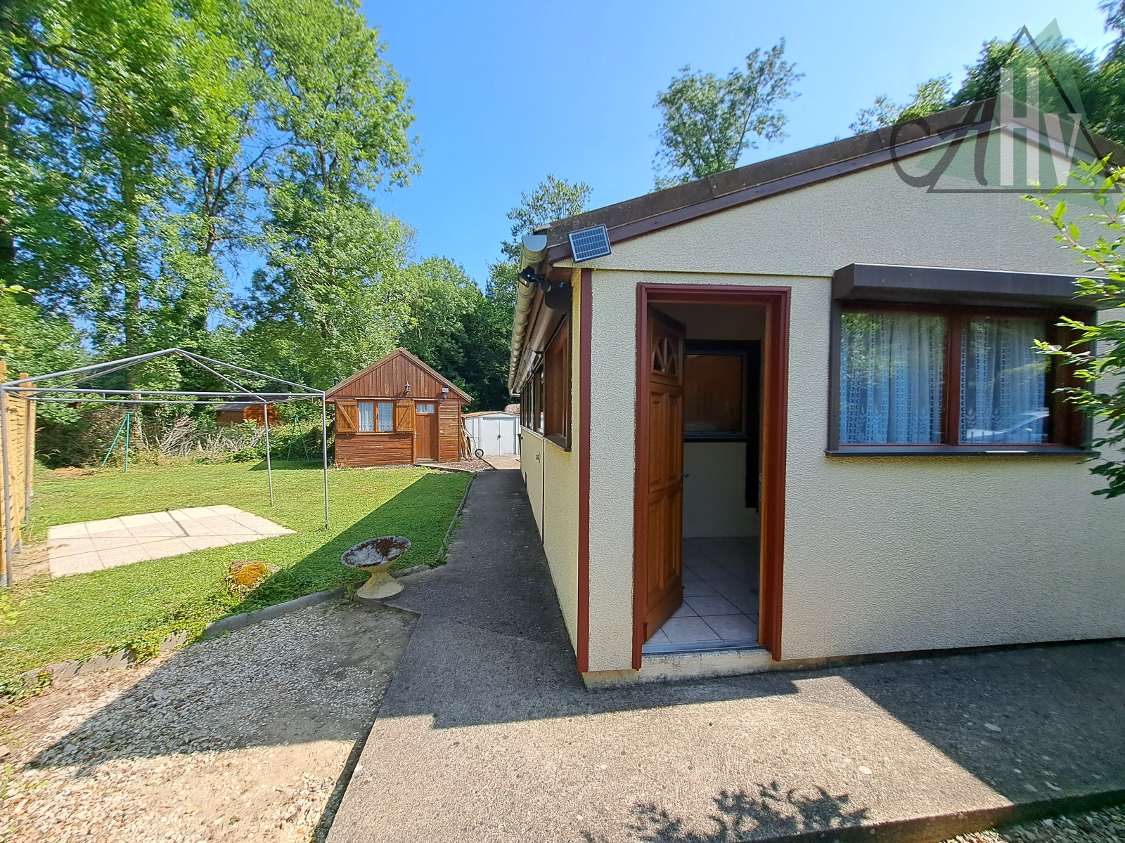 Terrain plat de 386 ㎡, entièrement clos, avec un chalet bois sur dalle de 11 ㎡ (possible chambre supplémentaire, avec chauffage), un cabanon de jardin, un carport et une terrasse.