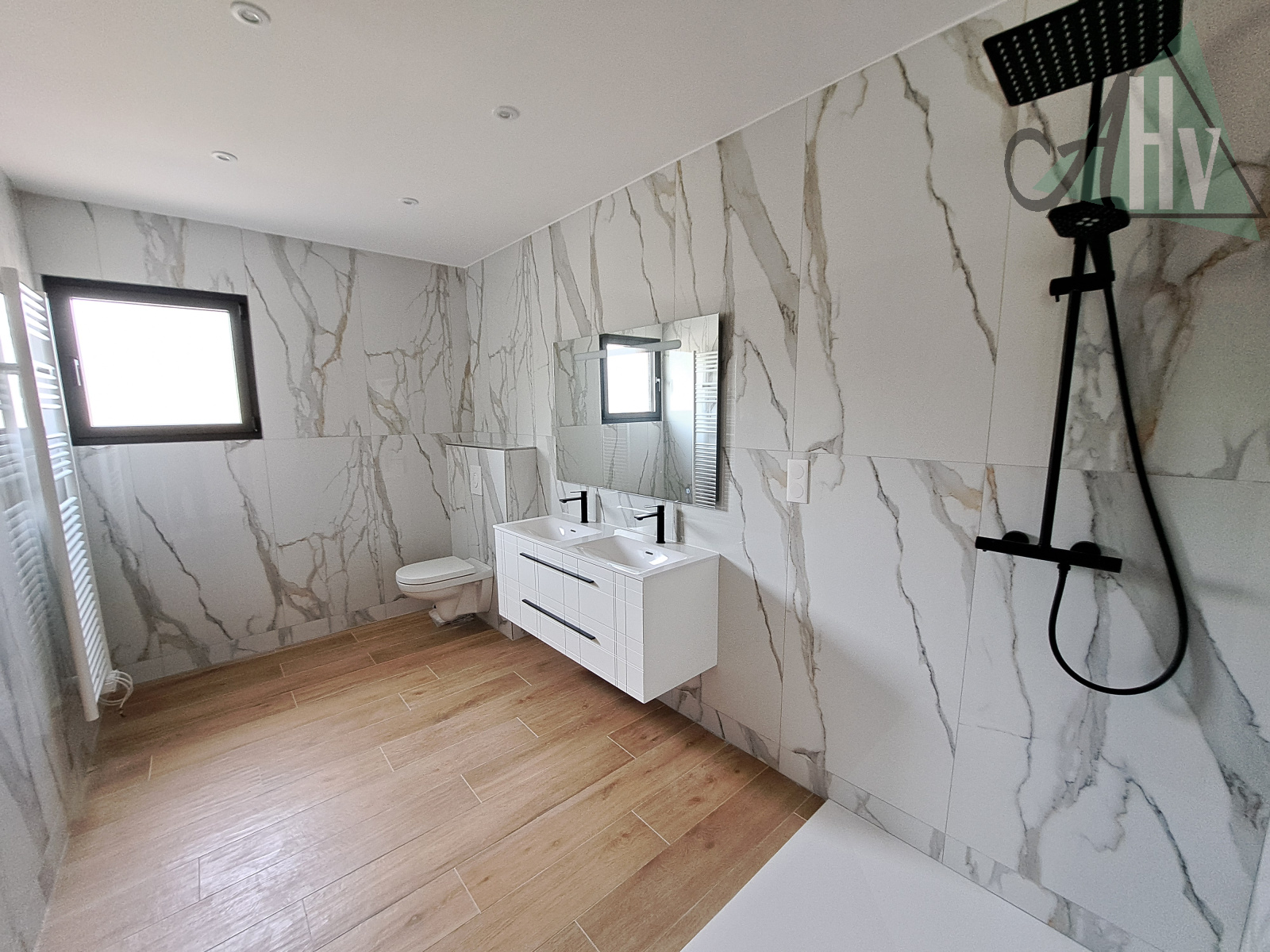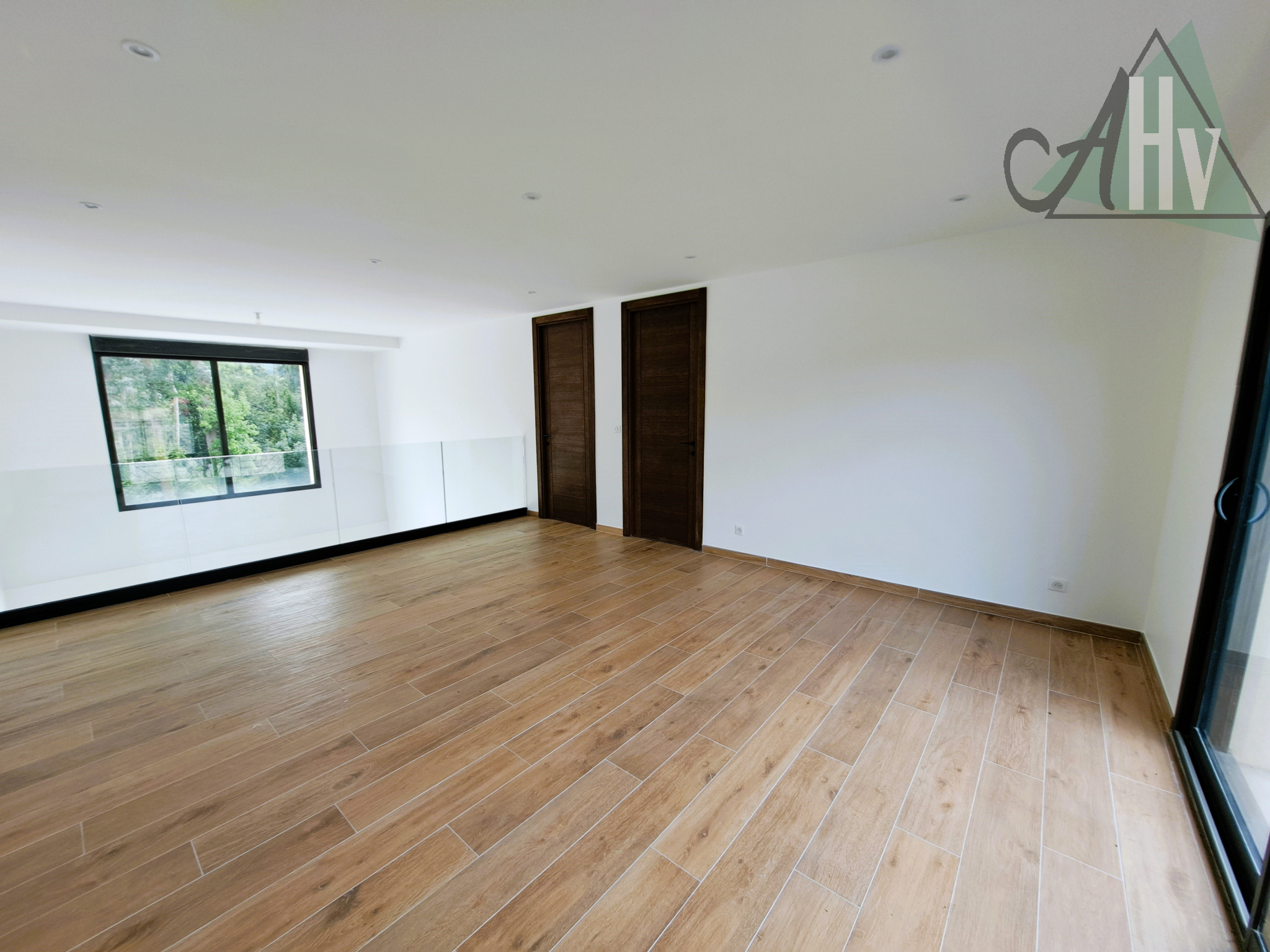A l'étage : grande pièce palière de 26 m² (idéale pour bureau, bibliothèque...), trois grandes chambres (de 20 - 19 et 12,5 m²) dont deux avec balcon, salle d'eau (douche à l'italienne, miroir connecté) avec wc.