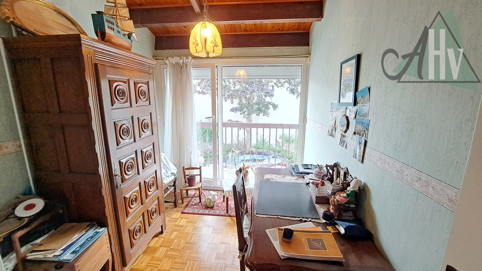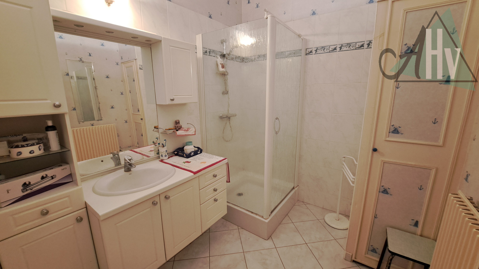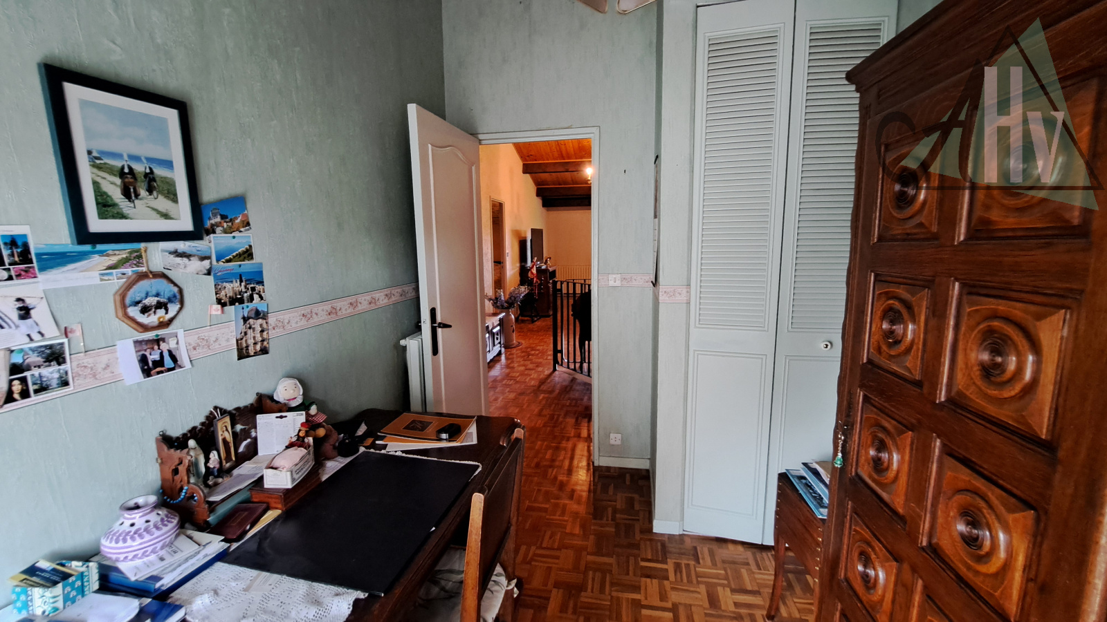 à l'étage : palier, trois chambres (12,3 m², 10,4 m² et 7,3 m²) dont deux avec balcon abrité et store-ban, salon de 22 m², salle d'eau de 5,3 m² et wc séparés.