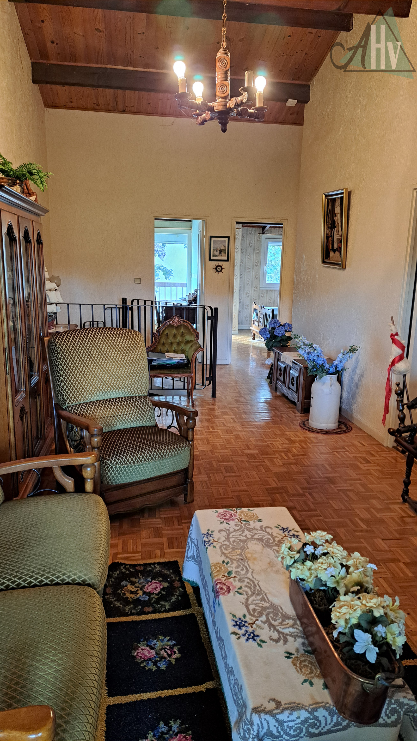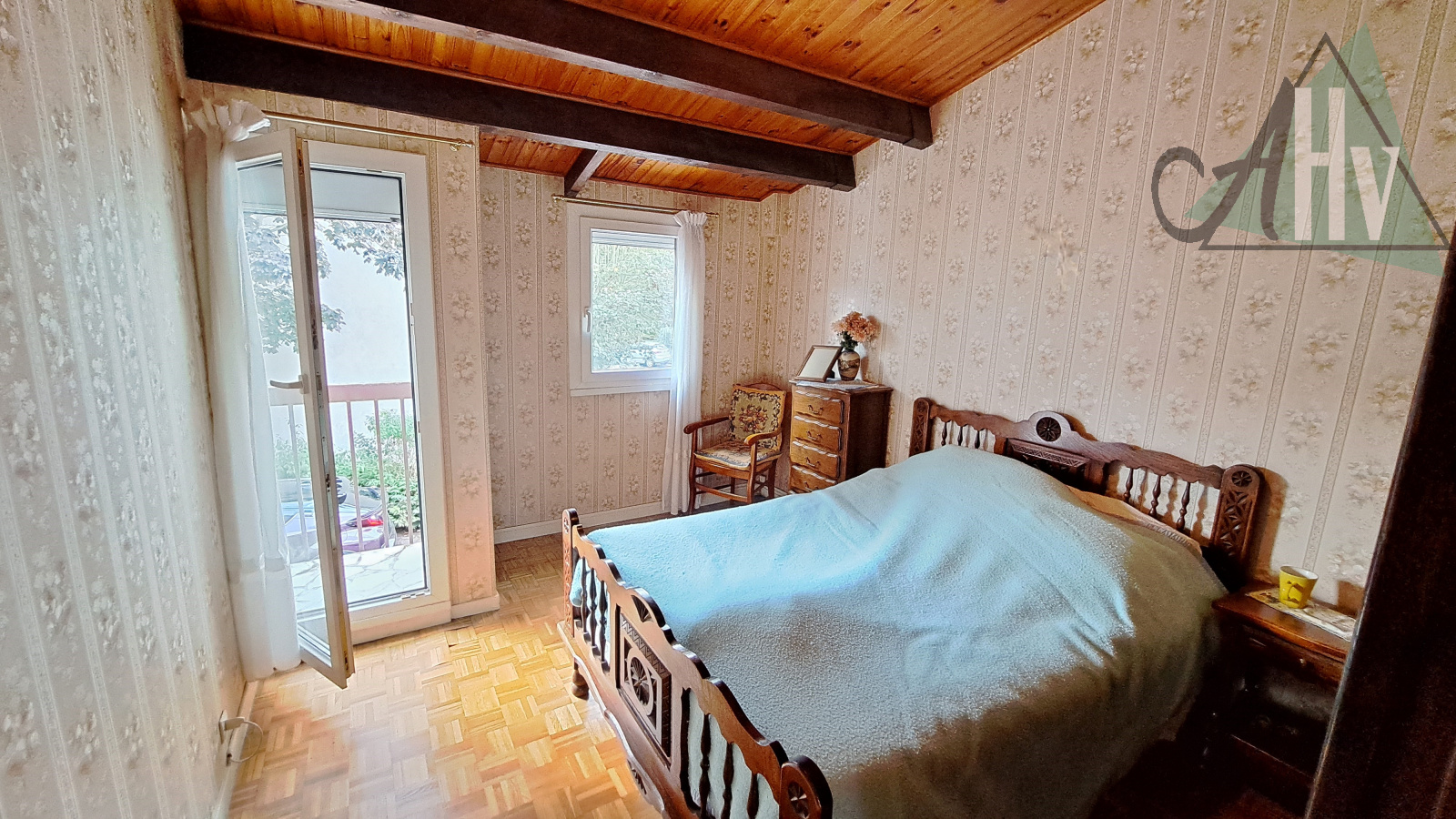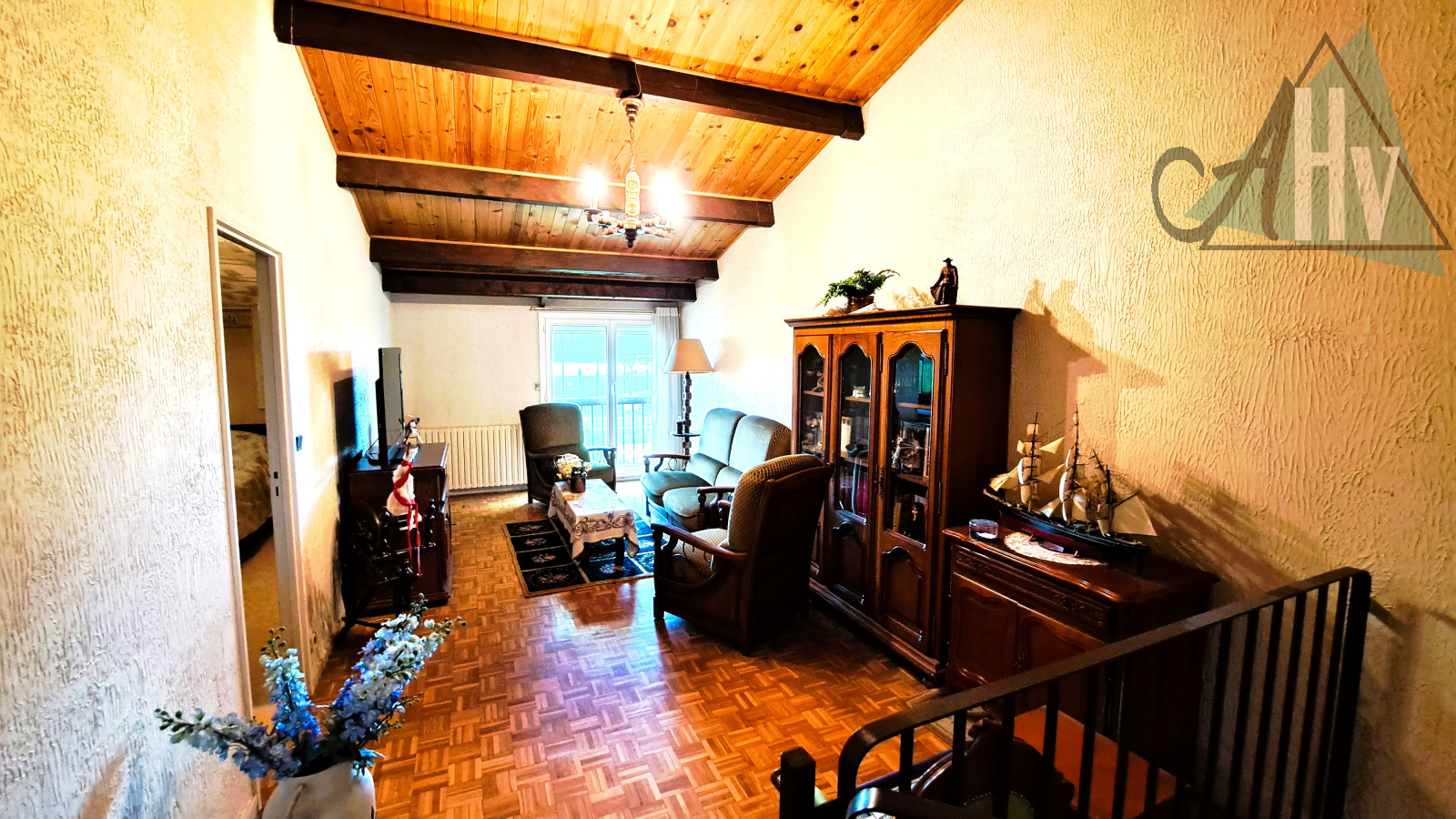 à l'étage : palier, trois chambres (12,3 m², 10,4 m² et 7,3 m²) dont deux avec balcon abrité et store-ban, salon de 22 m², salle d'eau de 5,3 m² et wc séparés.