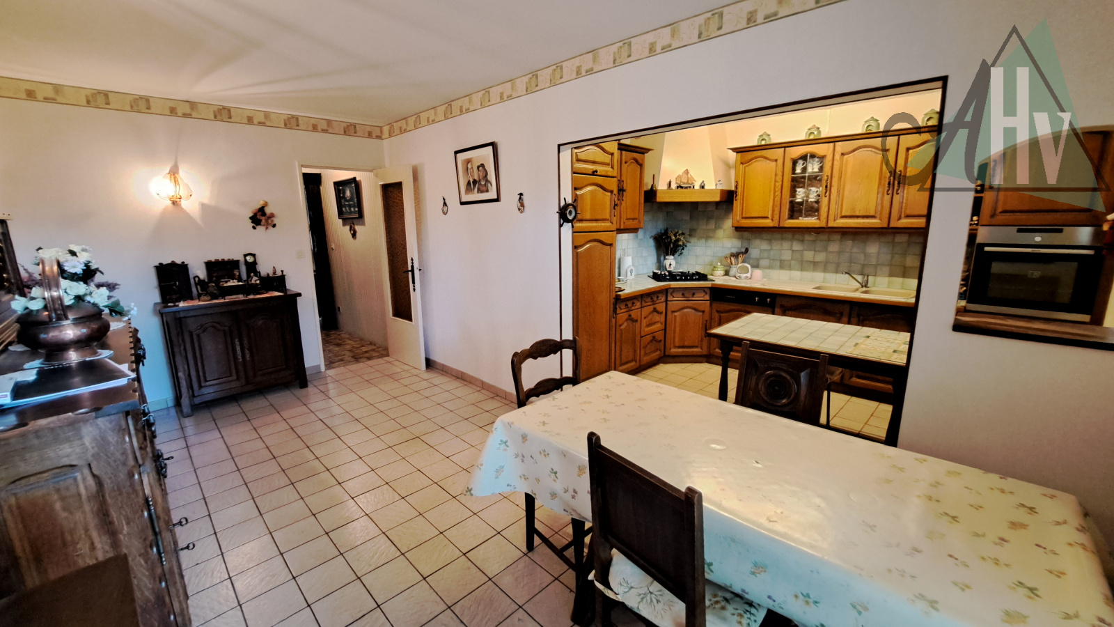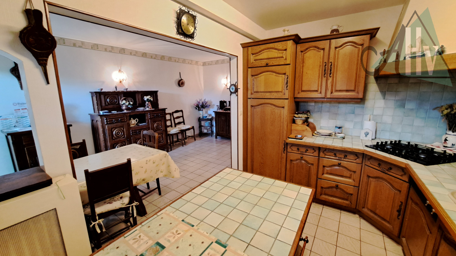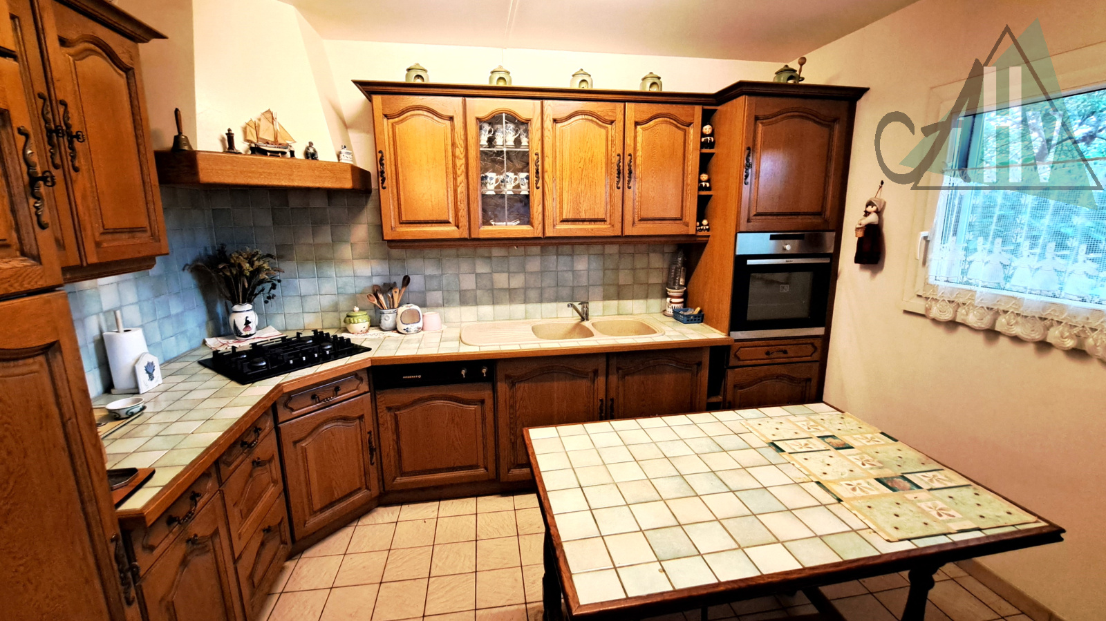 au RDC : grand entrée avec placards et accès au garage, cuisine aménagée équipée (frigidaire, lave-vaisselle, four, plaques gaz, hotte) de 5,6 m² ouverte sur salle à manger de 14 m² avec accès jardin ;